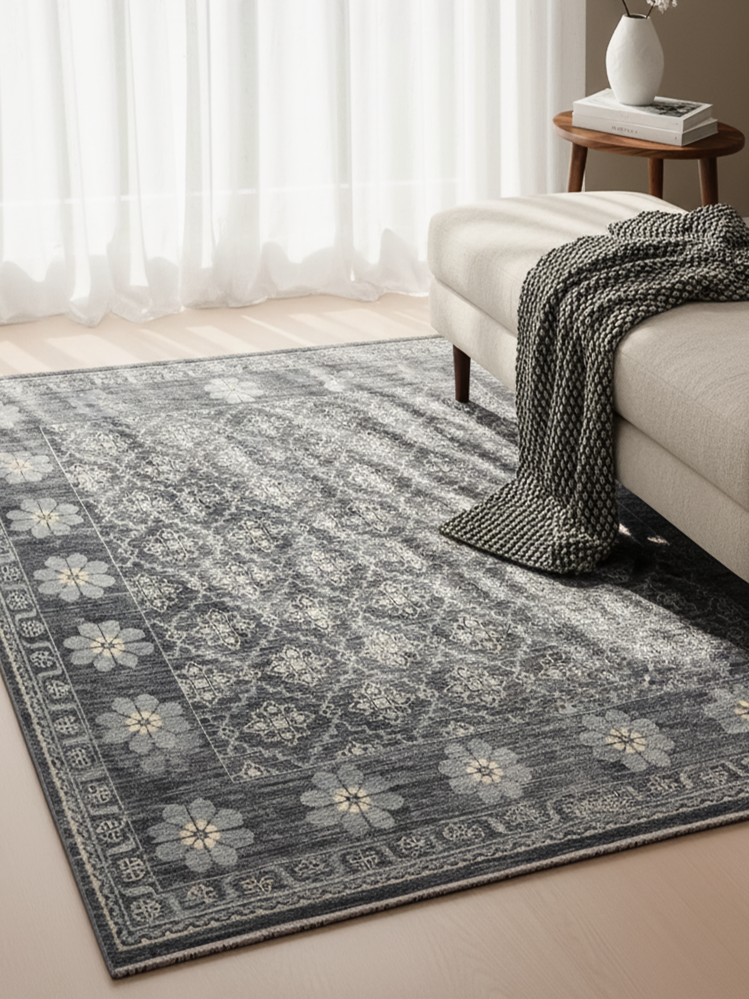 To keep your rug looking its best, shake or lightly beat it to remove dust, and rotate it regularly for even wear. Blot spills immediately with a clean, white cloth, keeping the rug as dry as possible. For tougher stains, professional cleaning is recommended. To preserve its colour and texture, avoid placing it in direct, prolonged sunlight. Do not pull any loose yarns. If needed, simply trim them with scissors so they sit neatly at the same height as the rest of the pile.