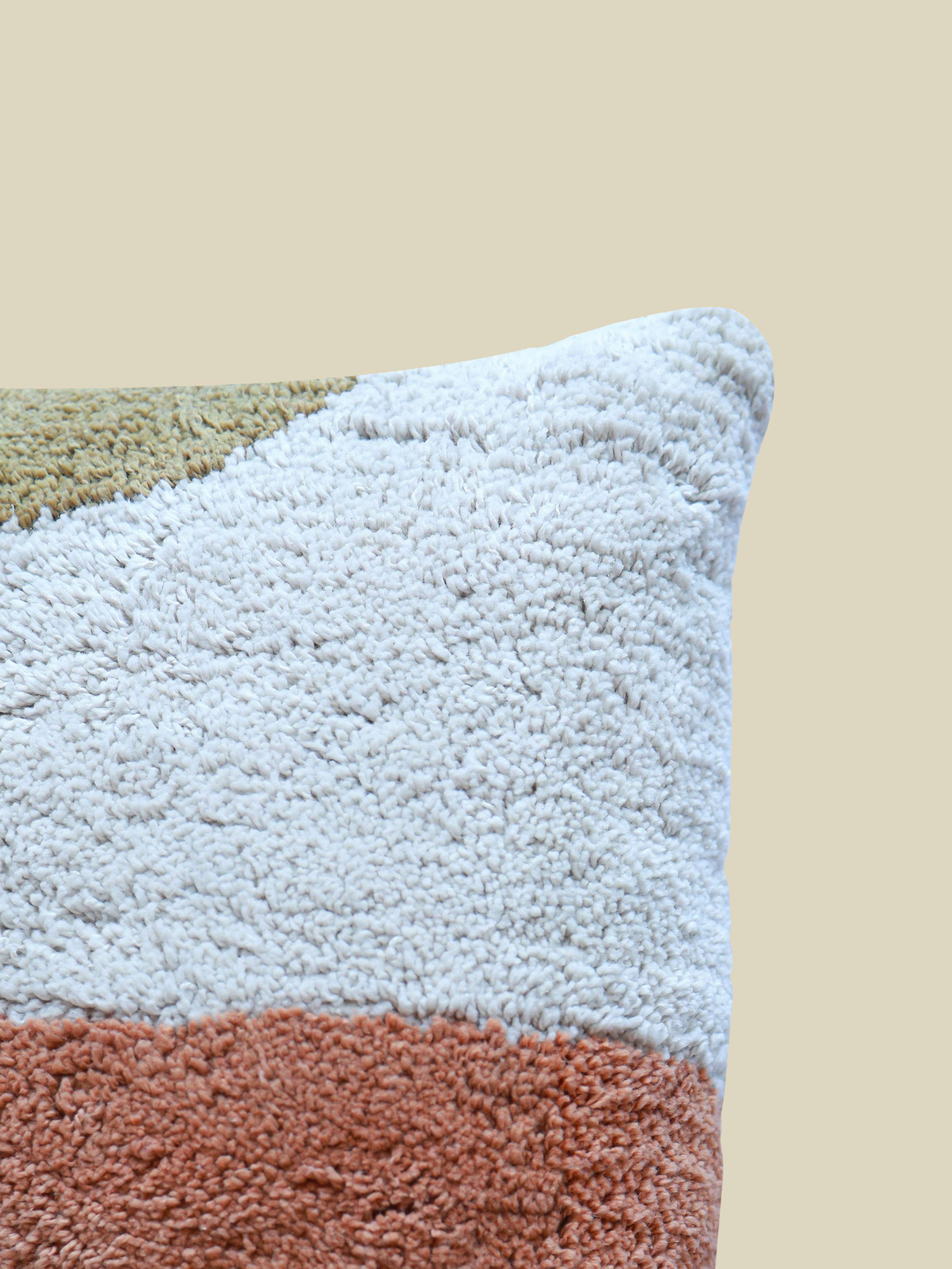 A rectangular cushion with a bold abstract tufted design in rust, olive, and beige, finished with a hidden zipper closure for a clean, polished look.