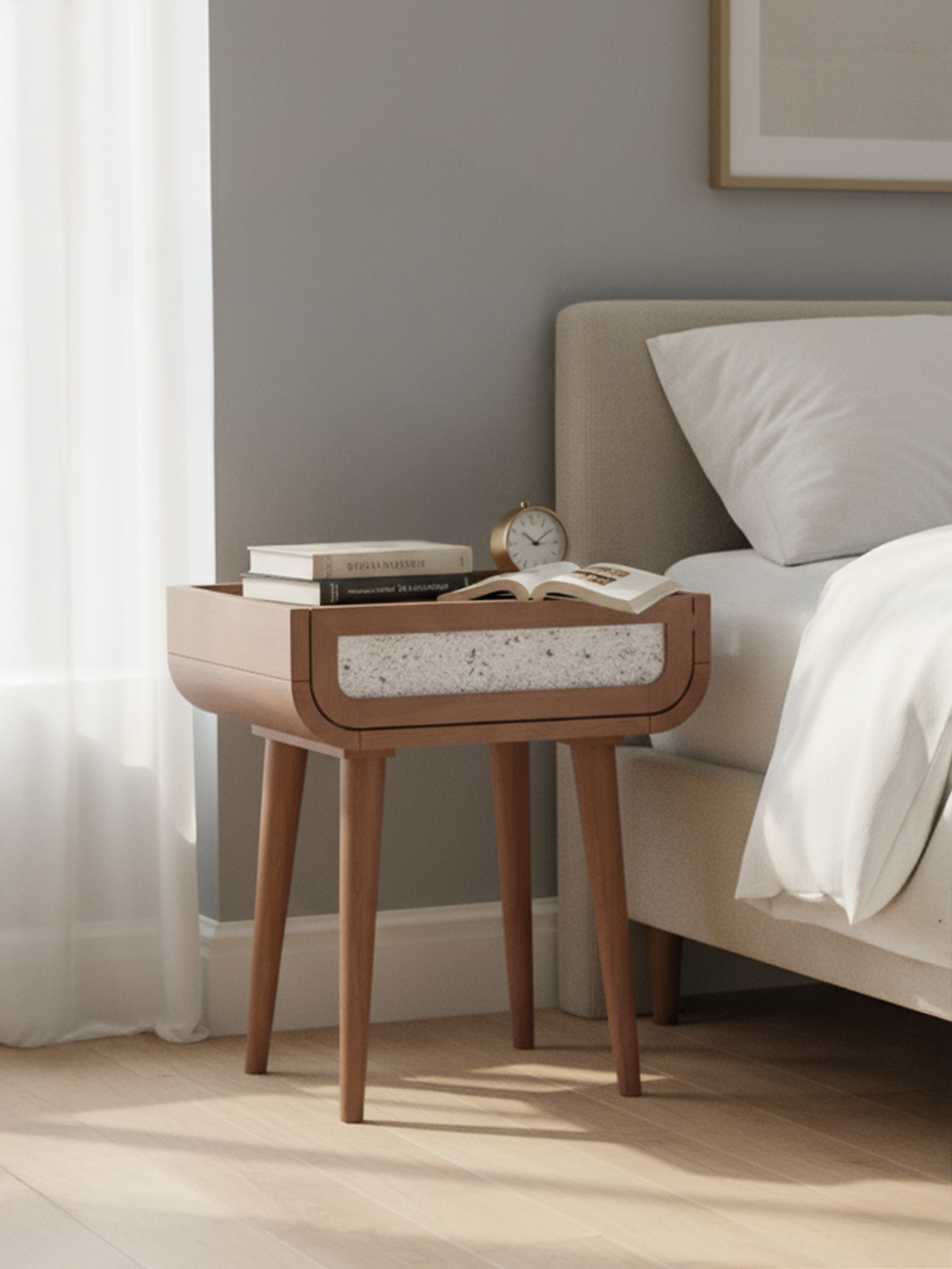 Our bedside tables often feature natural materials like wood, stone, and marble, each with its own unique grain and tone. Subtle variations in colour or texture are part of their character and not considered defects. While we aim to show colours accurately, differences in lighting and screens can create slight shifts. Every piece is crafted with care, and no two are ever exactly alike.