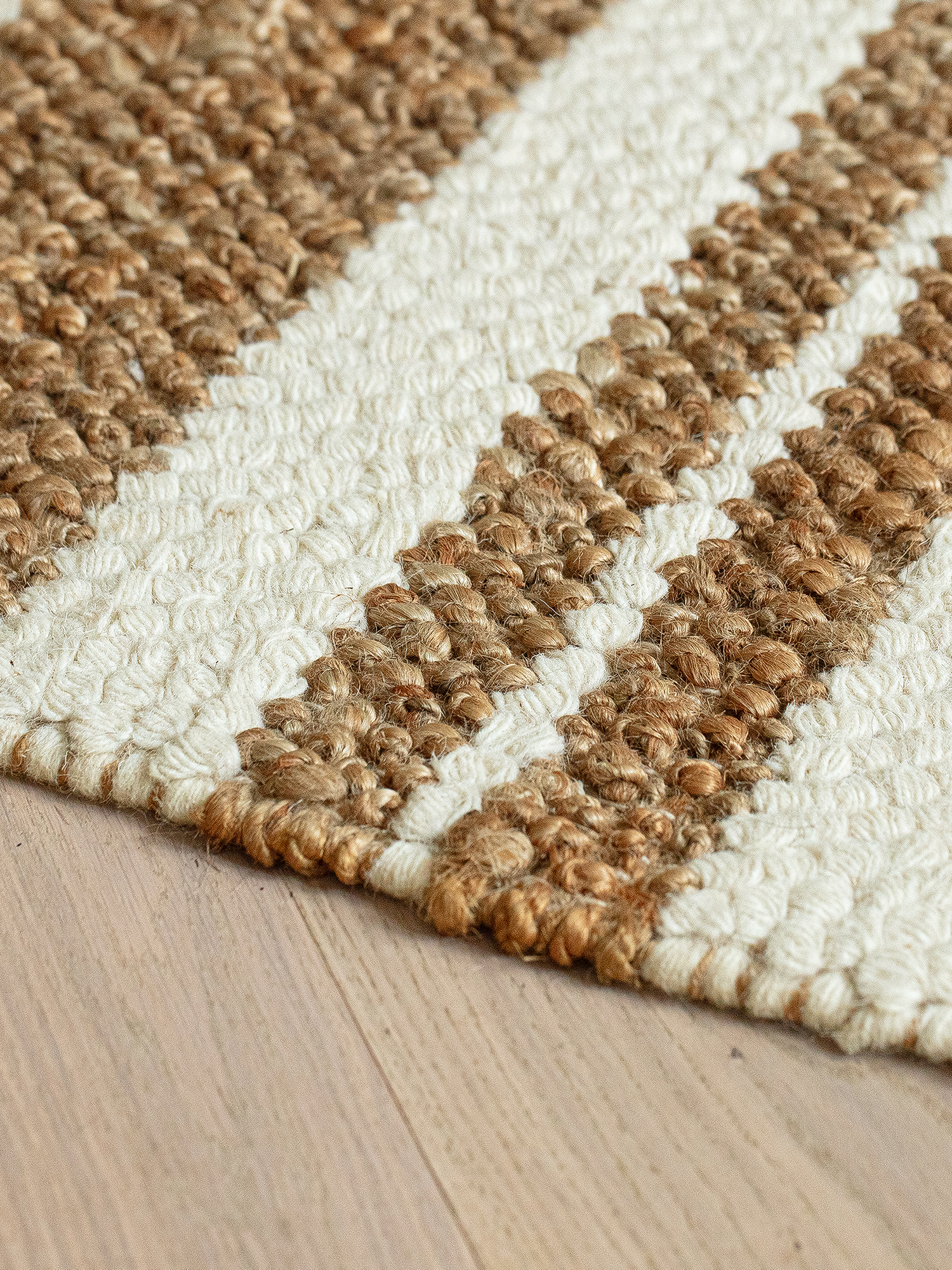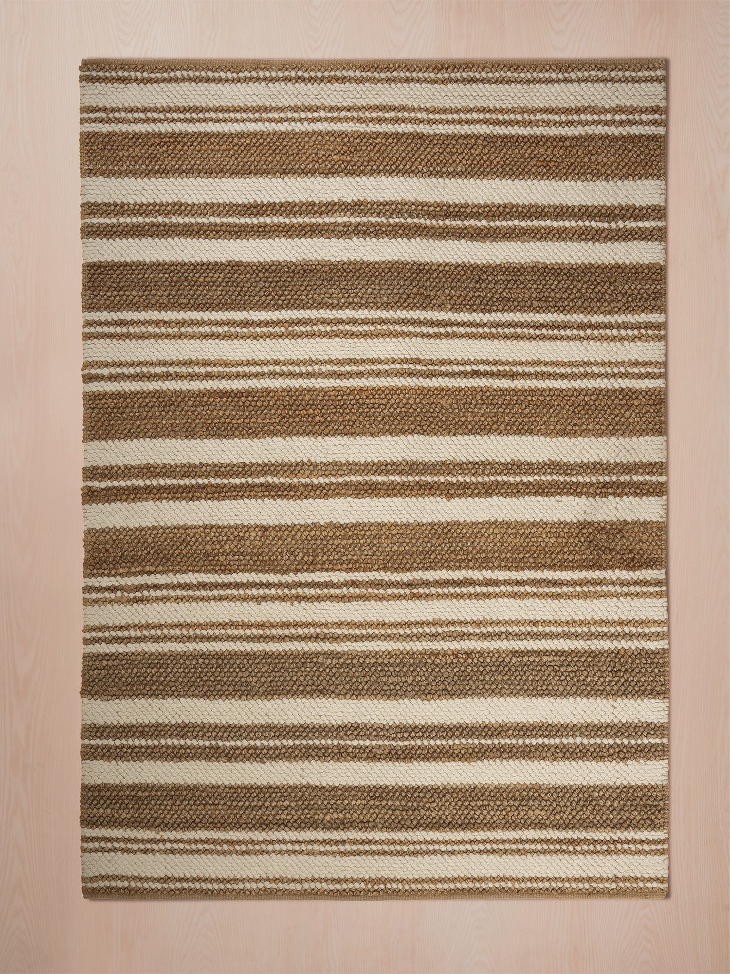 The Maxwell rug brings the calming essence of sandy beaches into your home. Woven by hand on a loom from a blend of jute, wool, and cotton, it offers a perfect mix of durability, warmth, and texture. Its natural and ivory-striped pattern creates a soft yet structured look, making it an ideal addition to coastal, contemporary, and rustic interiors.