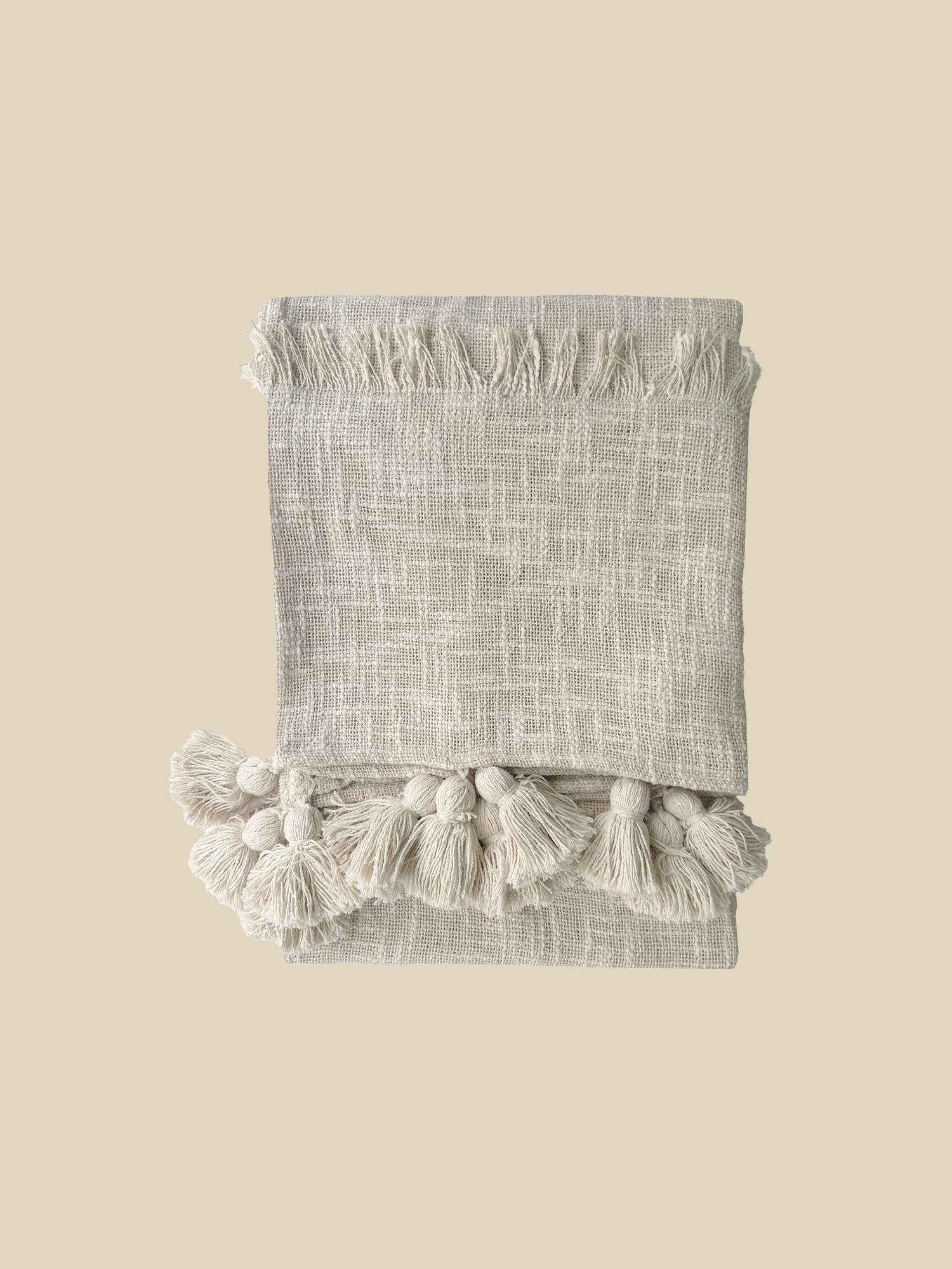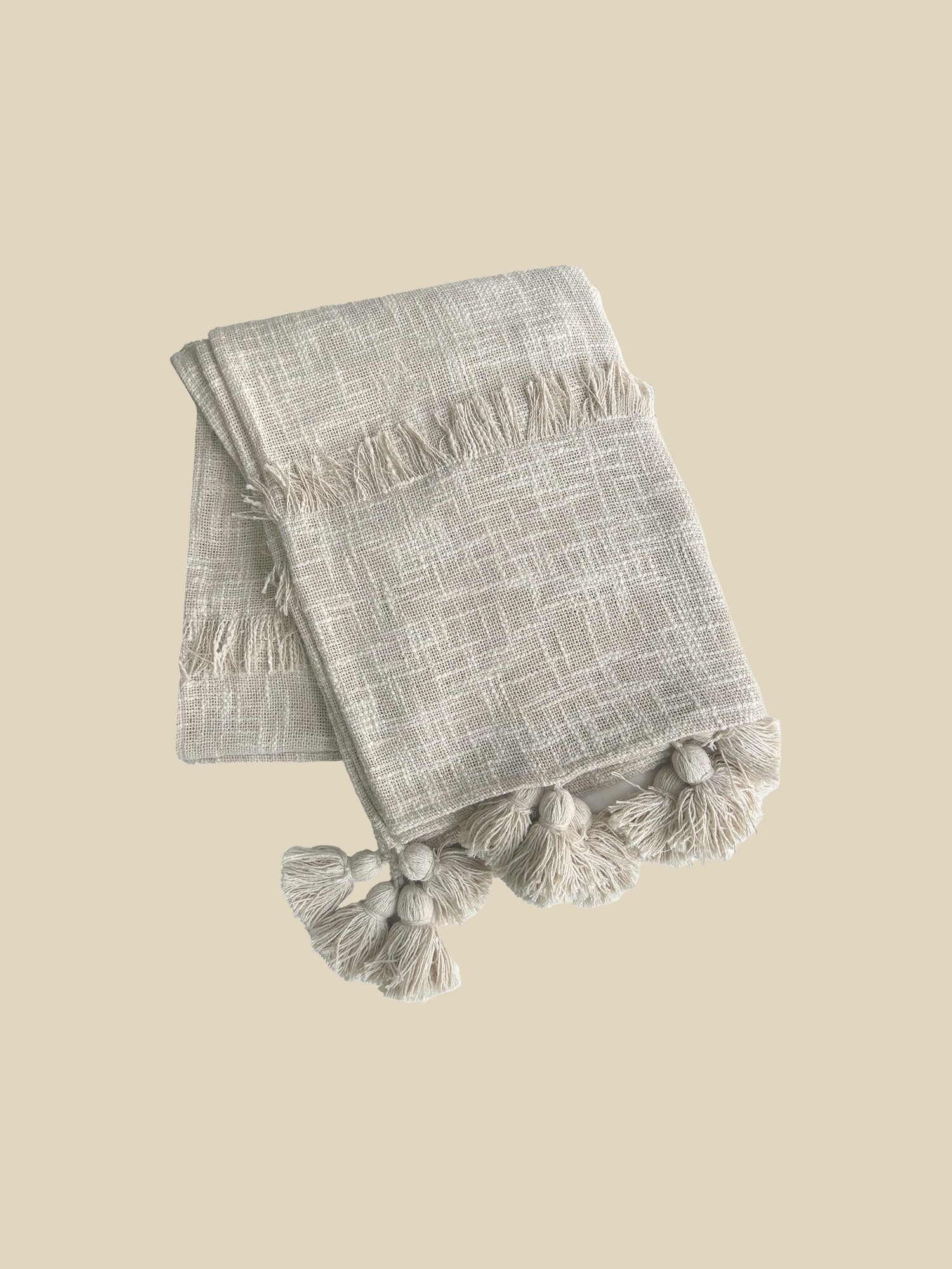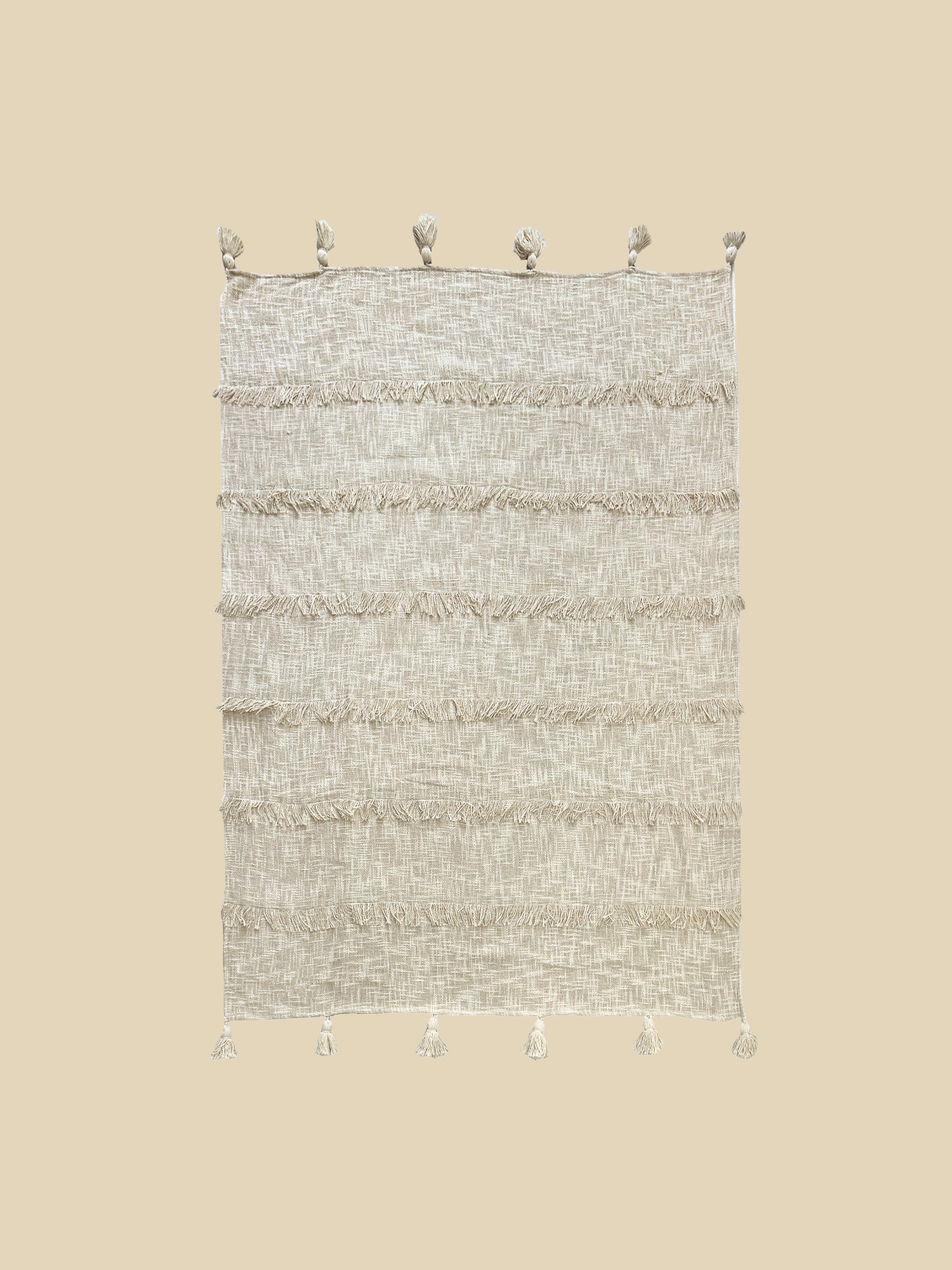 The Omo Throw is crafted to bring effortless comfort and style to your home. Woven from soft cotton, its textured surface is accented with embroidered stripes and finished with tassels along the edges for a relaxed, bohemian touch. The all-over off-white hue blends seamlessly with contemporary, coastal, or rustic spaces, while its lightweight softness makes it perfect for everyday use.