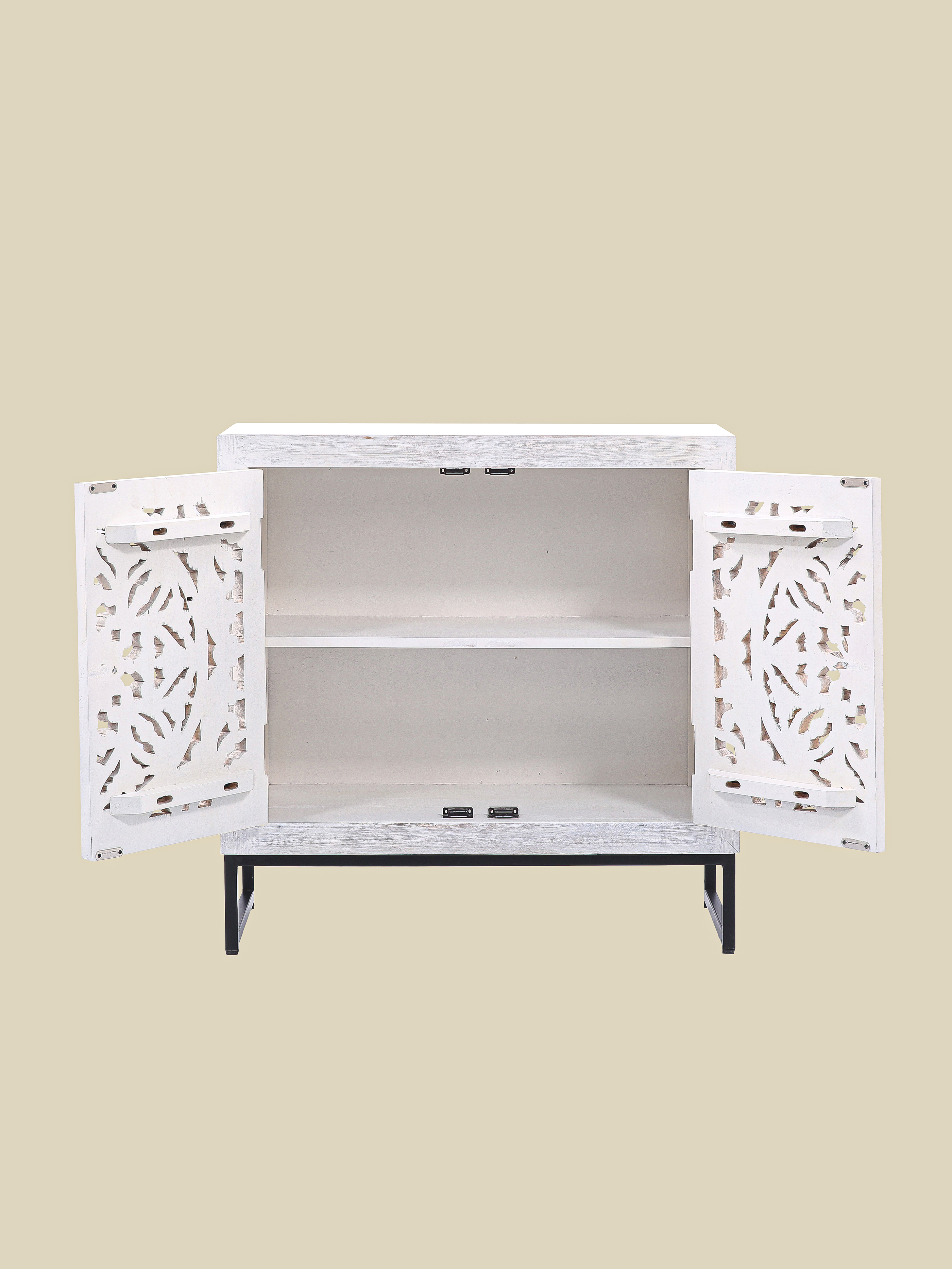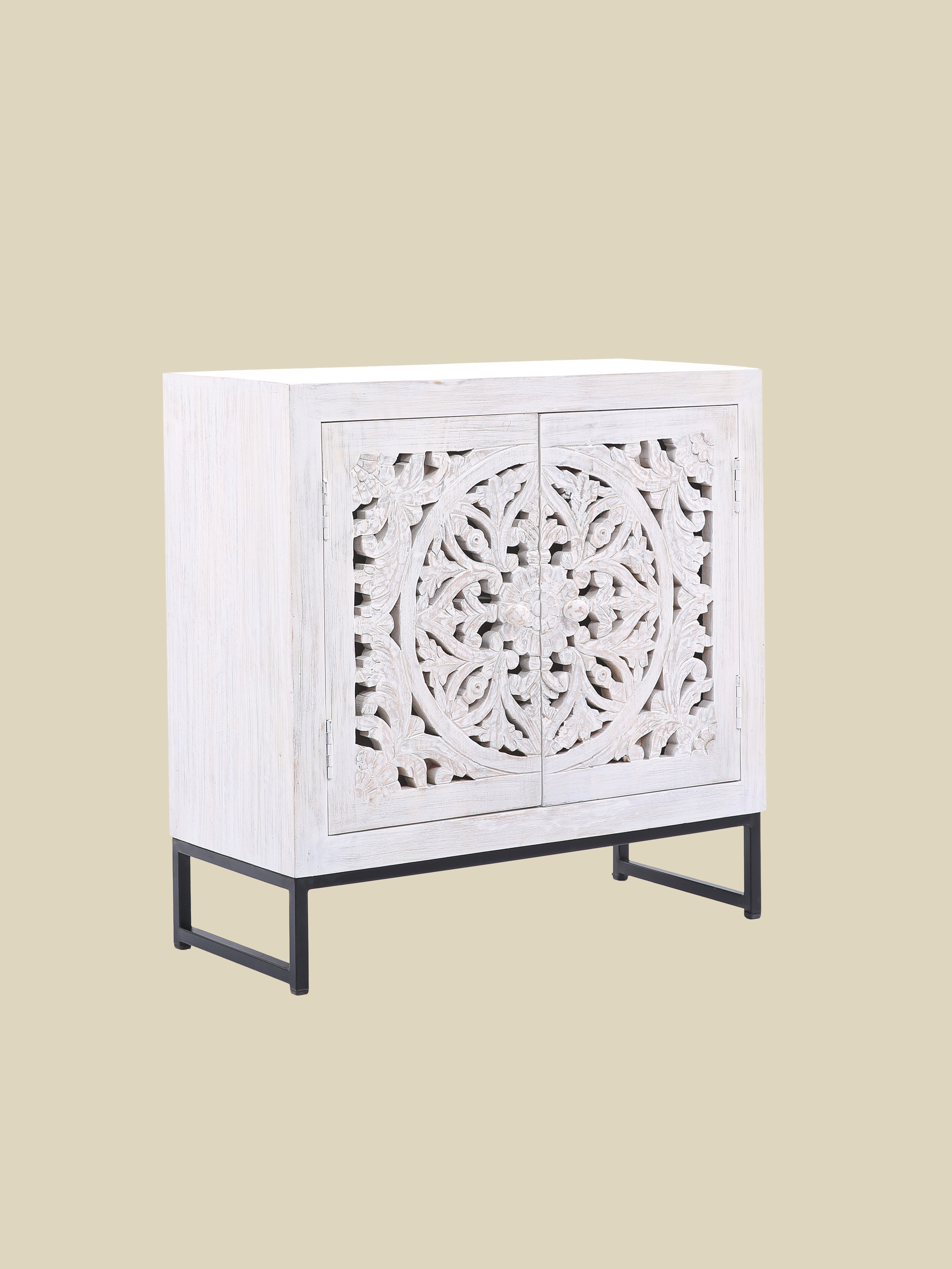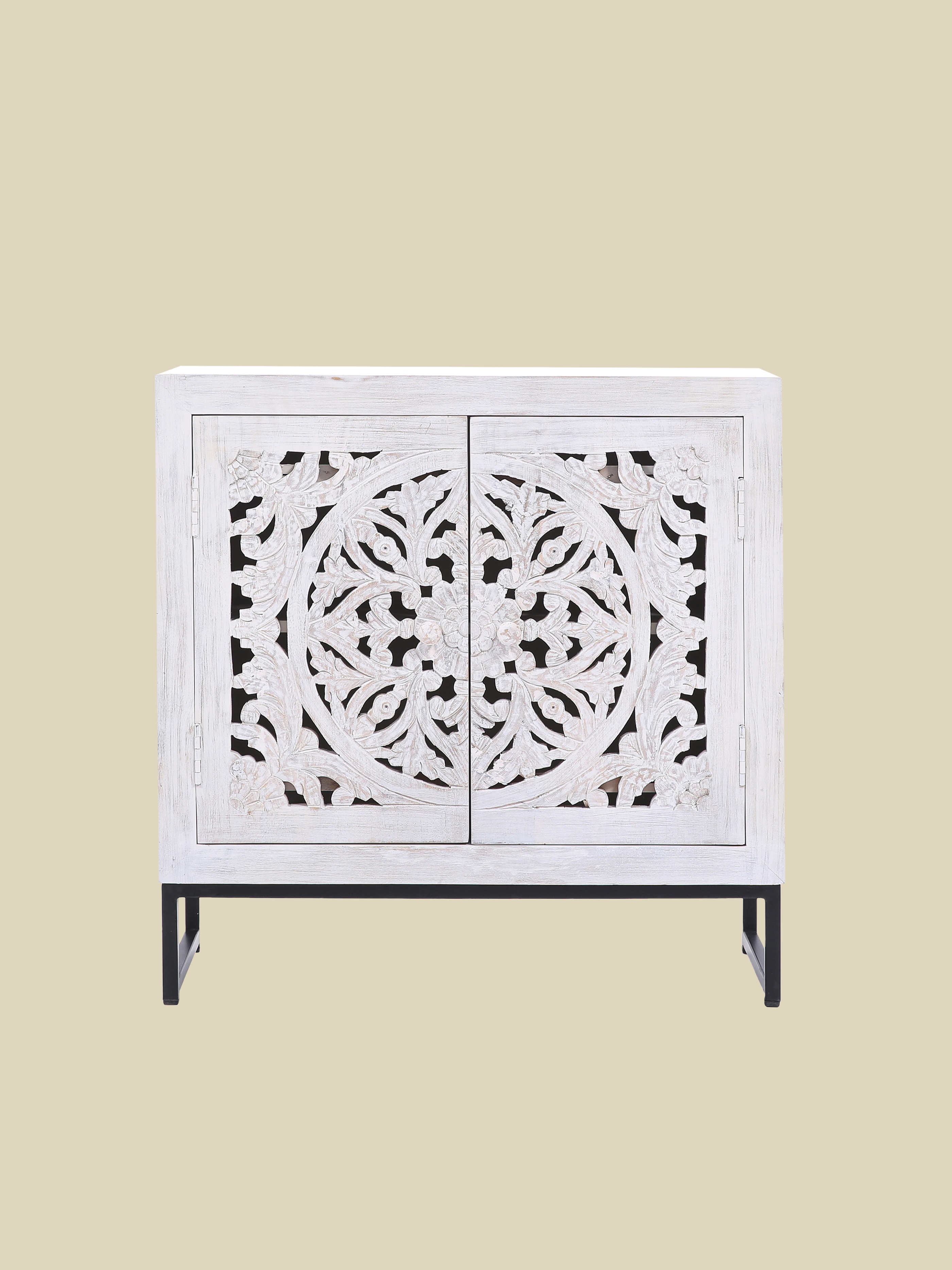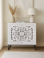 The Solana cabinet is where craftsmanship and character meet. Carefully carved from solid mango wood, it showcases intricate cut-out detailing and a beautifully clean white finish. Set atop a slim black-painted iron base, Solana plays with contrast—balancing delicate texture with modern strength. Behind the two carved doors, spacious shelving keeps everything organized and out of sight.