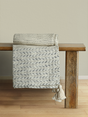 A classic striped pattern with a handwoven texture, embroidered details, and tassel accents, inspired by breezy coastal living.