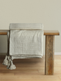 A minimalist yet inviting throw, featuring a soft cotton weave with delicate colour accents and tassel details.