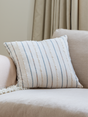 The Neutral Glory Hand-woven cushion features a classic striped pattern in a soothing off-white and beige palette. Made from a luxurious mix of 50% cotton and 50% velvet, it has been woven by skilled artisans on a handloom.