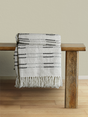 A handwoven striped pattern in classic monochrome, enhanced with tassel details for added texture.