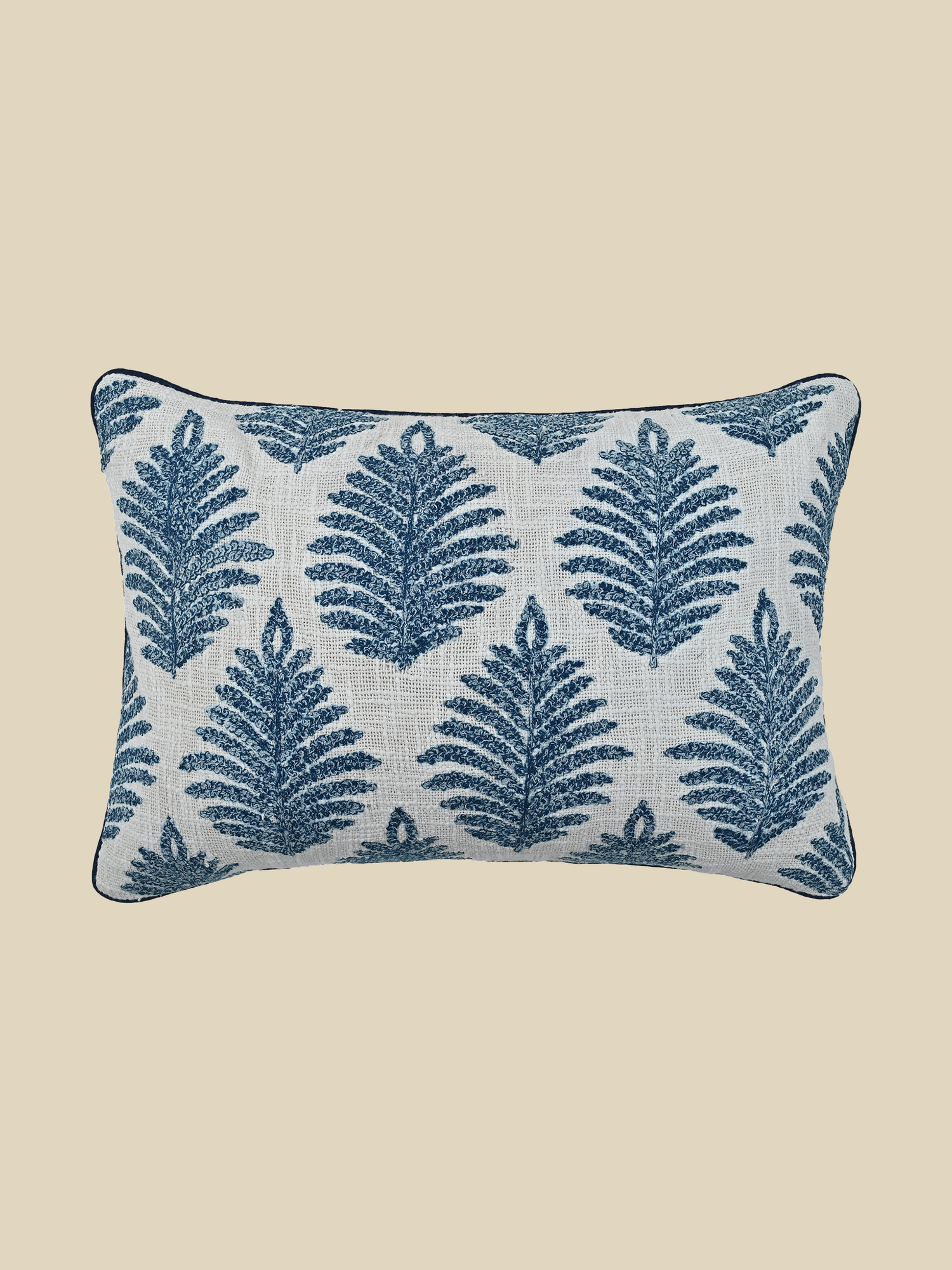 A rectangular cotton-blend cushion in blue and ivory with intricate floral embroidery.