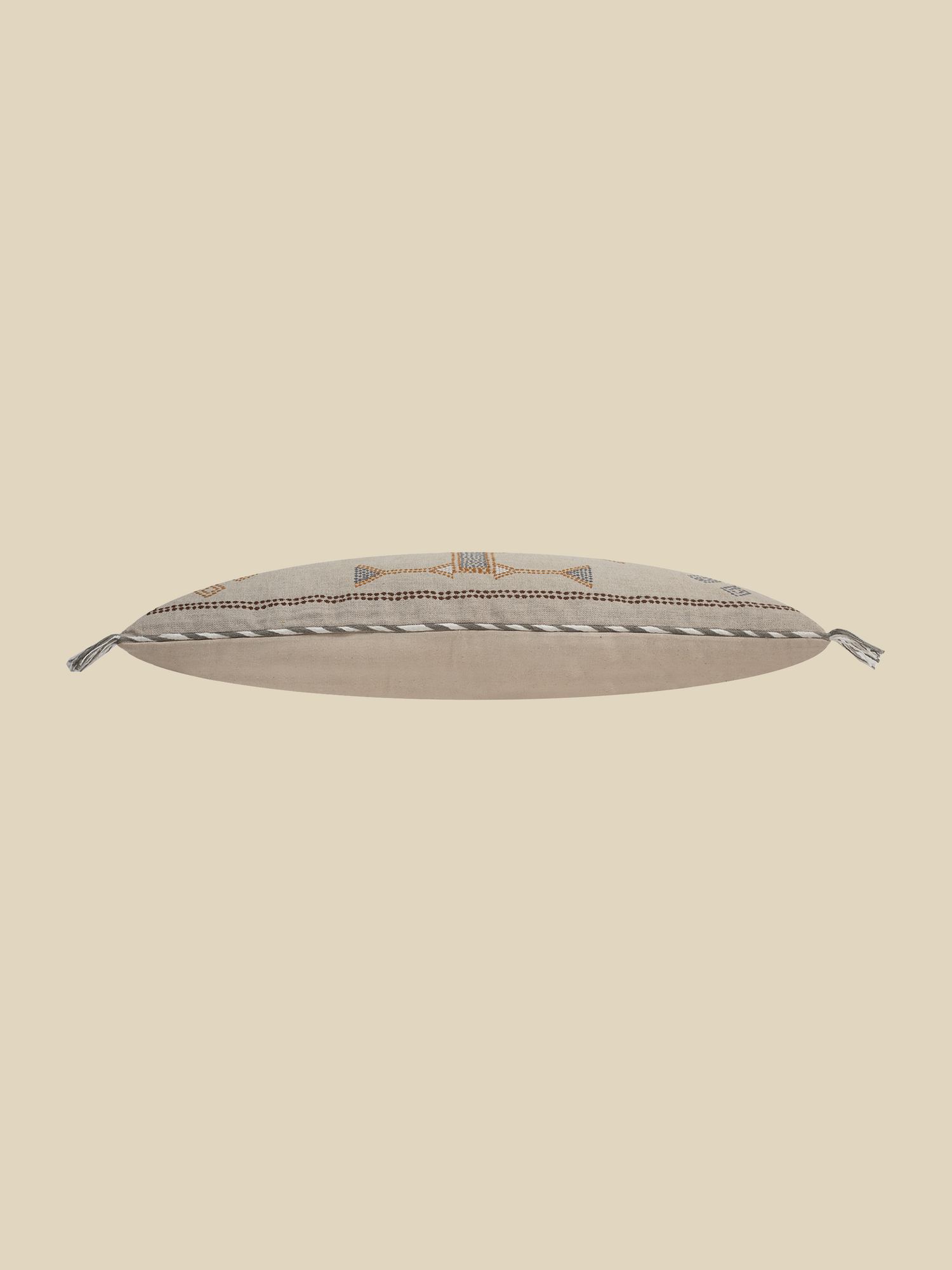 The Grey Dream Cushion captures the spirit of artisanal craft with a touch of global charm. Its grey cotton-linen base is hand-printed, stone-washed, and adorned with intricate embroidery in grey, charcoal, and peach hues. Tassel corners complete the look, lending a playful yet refined detail.