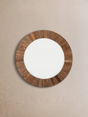A round reclaimed wood mirror with a warm natural finish, crafted to bring depth and character to any space.