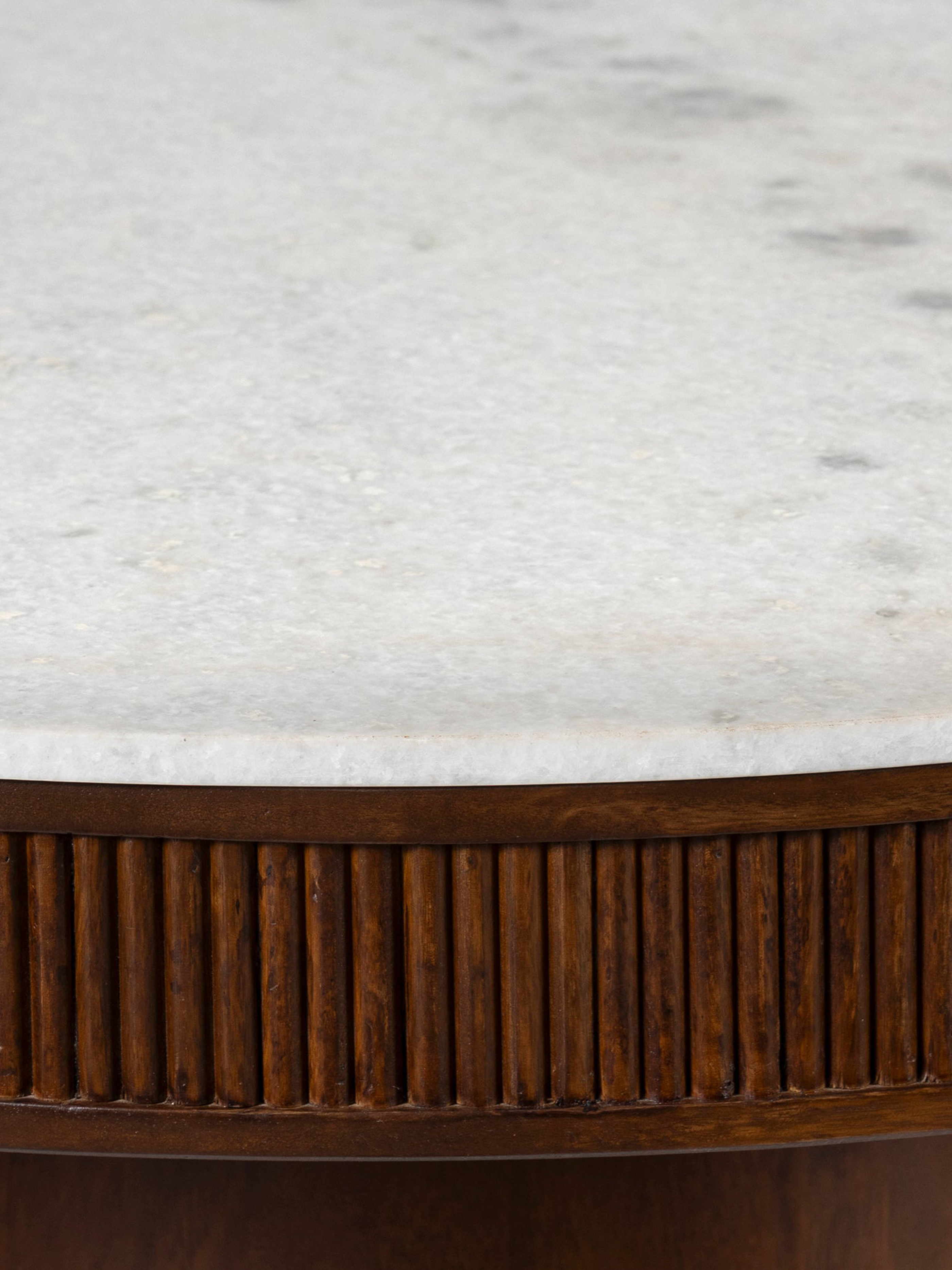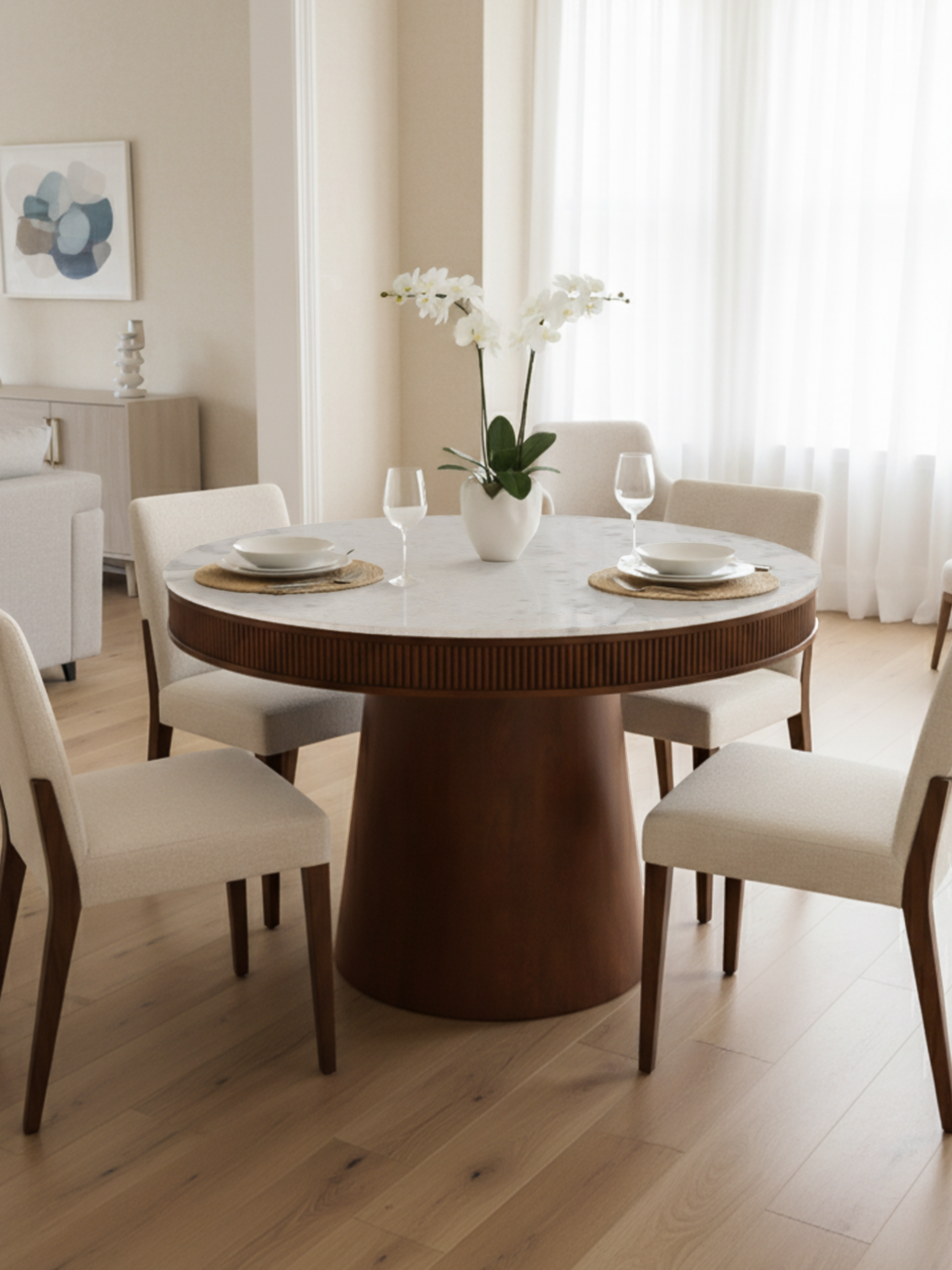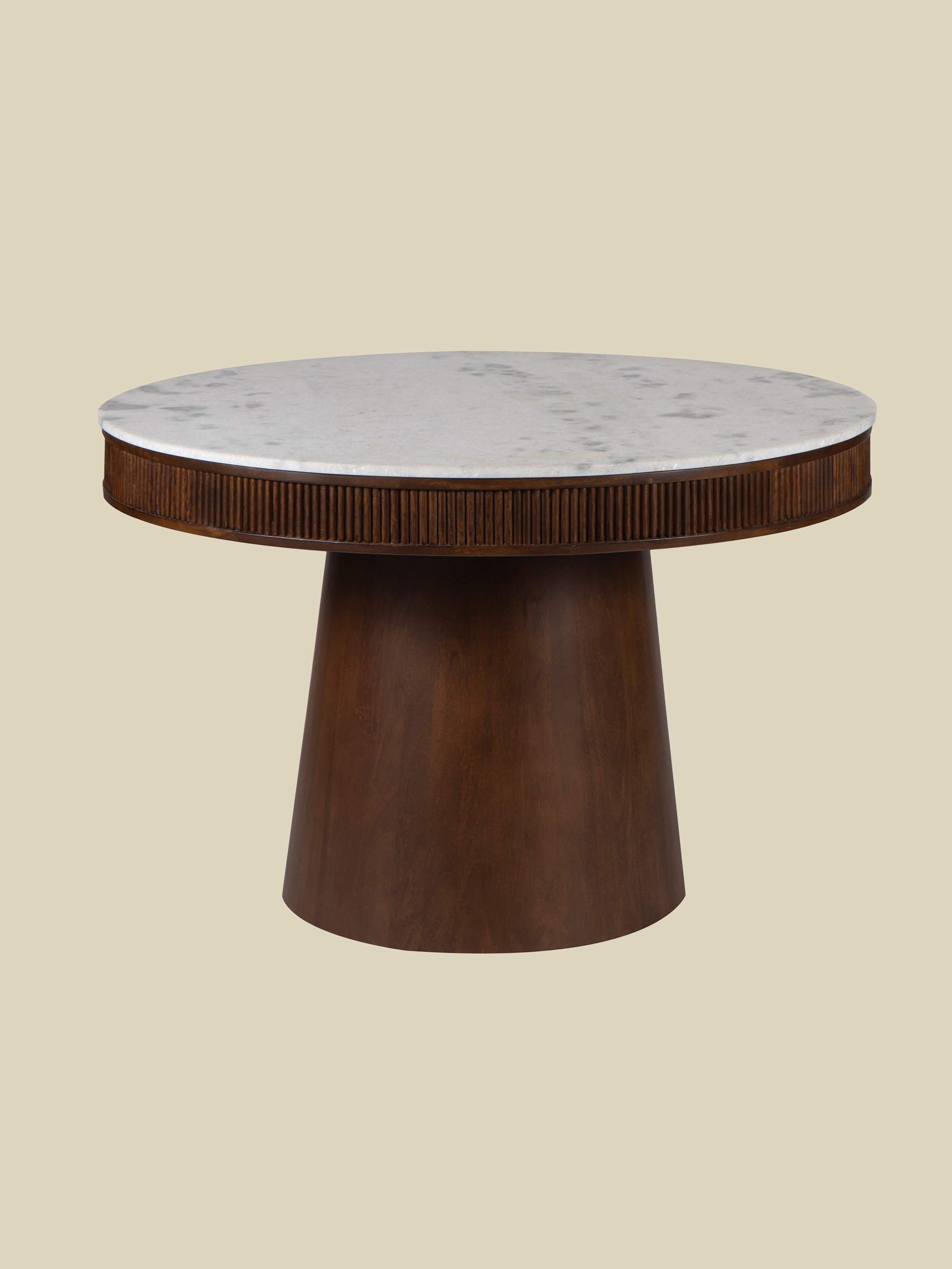 The Nate Marble Top Dining Table combines quiet luxury with modern design. Its round white marble top reveals natural variations in grain and veining, while a walnut-finished mango wood base adds warmth and strength. Designed to seat four, it’s perfect for intimate meals and everyday dining.