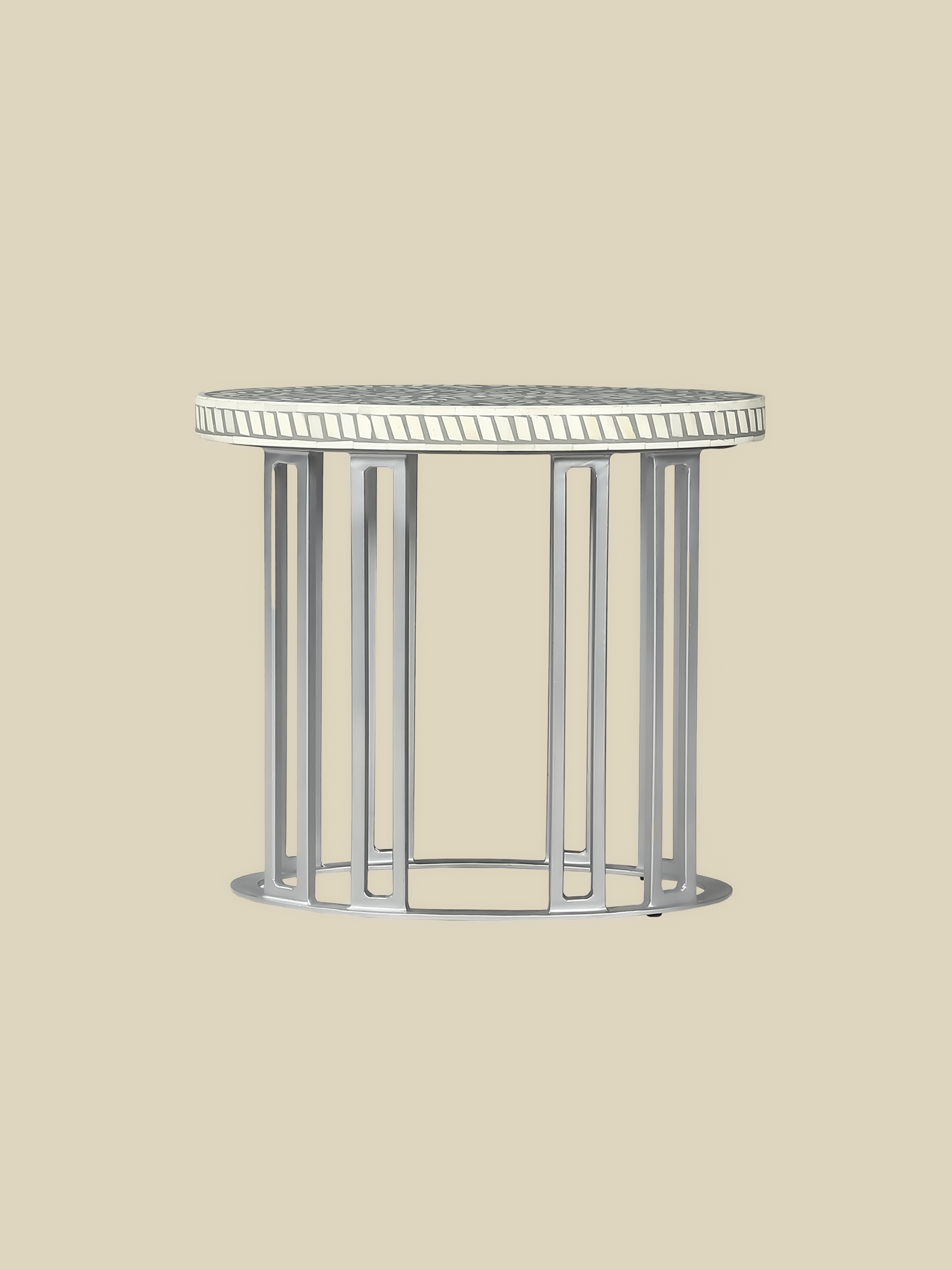The Karen Side Table features a botanical bone inlay design that adds a sophisticated yet artistic touch. Its sleek silver iron frame provides an open, airy feel, balancing heritage craftsmanship with modern aesthetics.