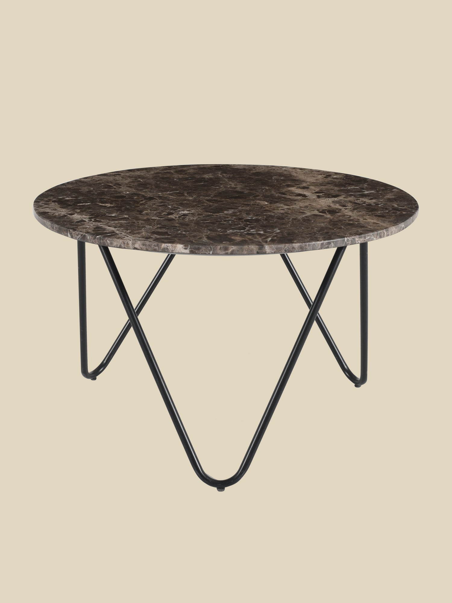 A round Emperador marble top rests on slim, black powder-coated metal legs. The contrast in tone adds depth while keeping the silhouette clean and contemporary.