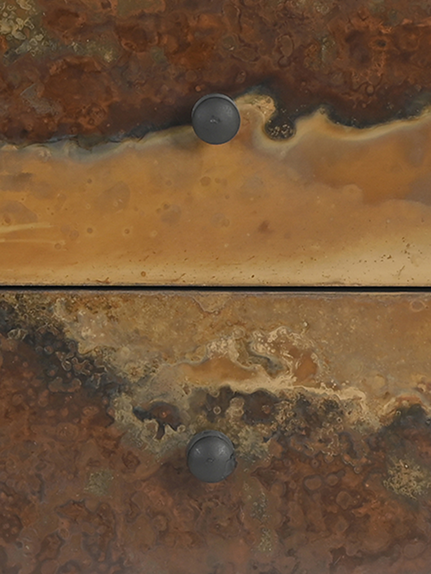 The Astra Bedside Table brings celestial beauty into everyday living. Crafted from iron, its luminous galaxy-inspired finish shifts with the light, creating depth and intrigue. Two drawers open to ample storage, offering a chic way to store bedtime essentials.