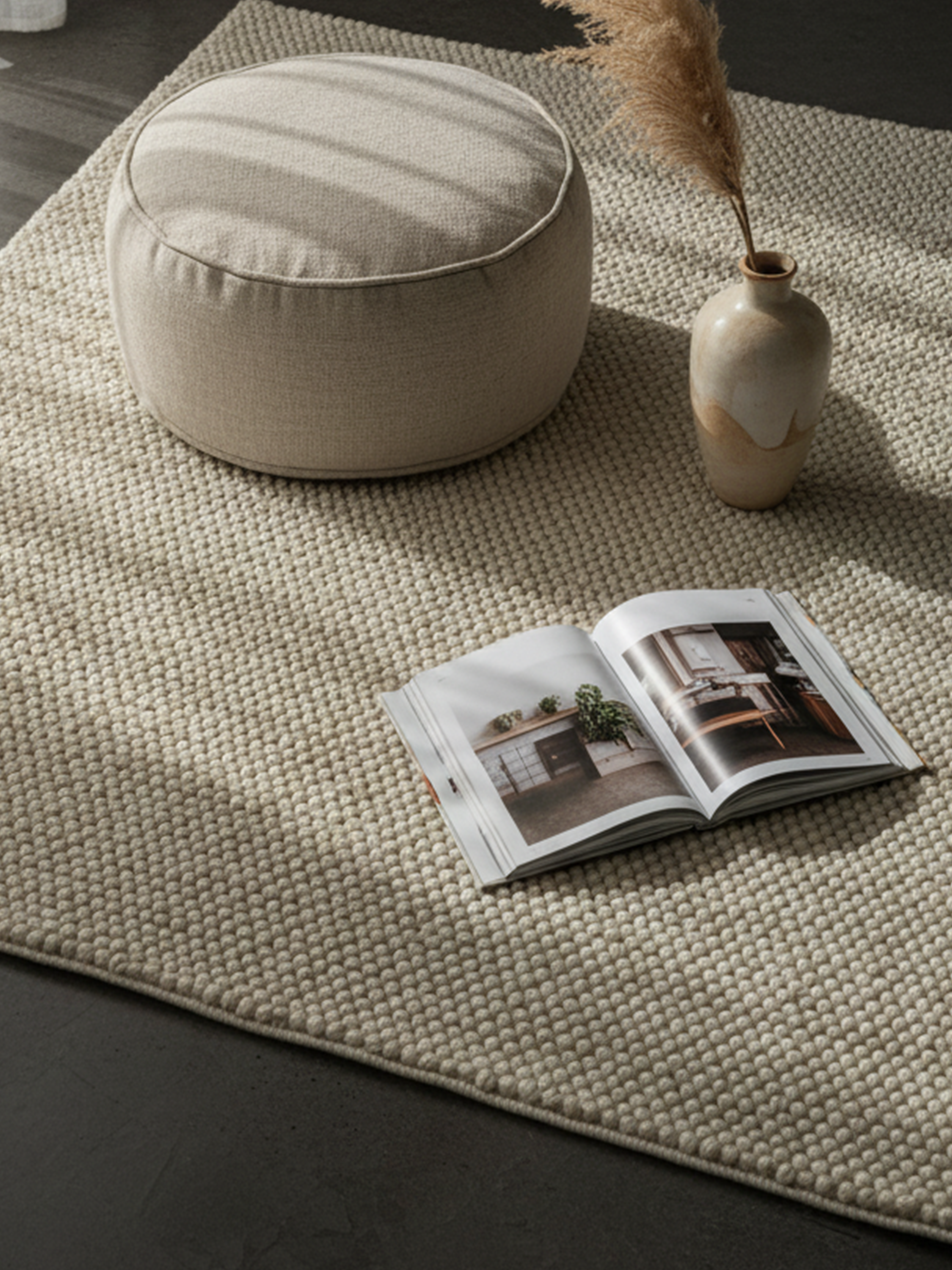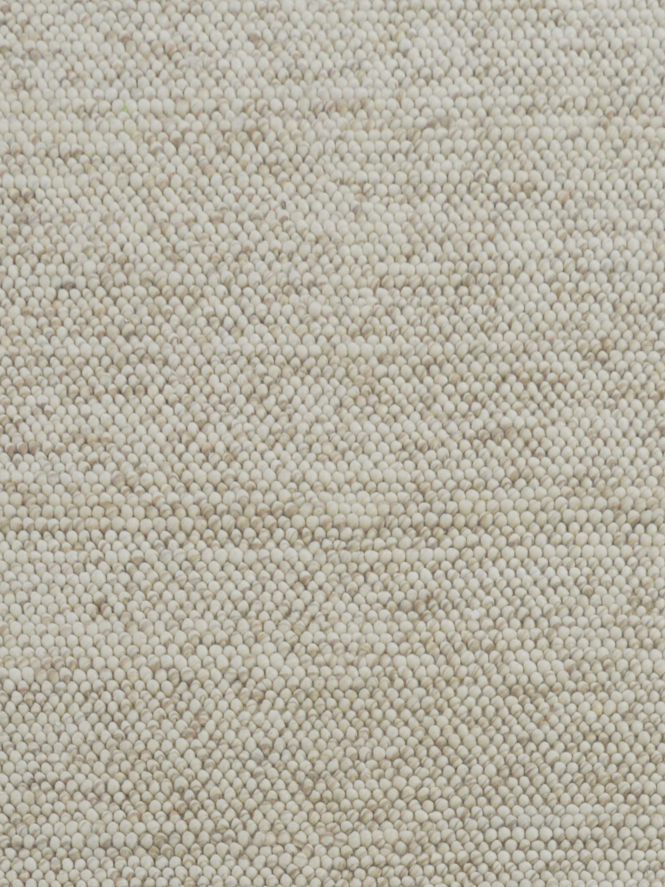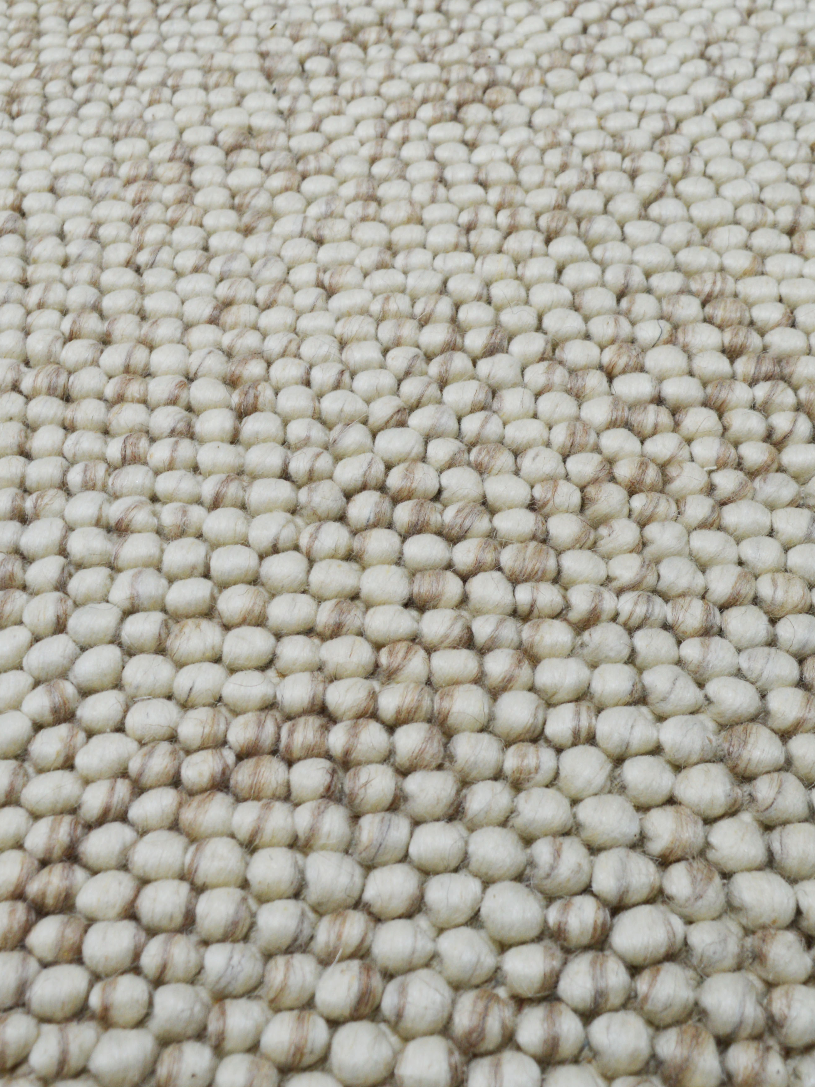 A hand-woven wool rug in soft beige with a richly pebbled texture.