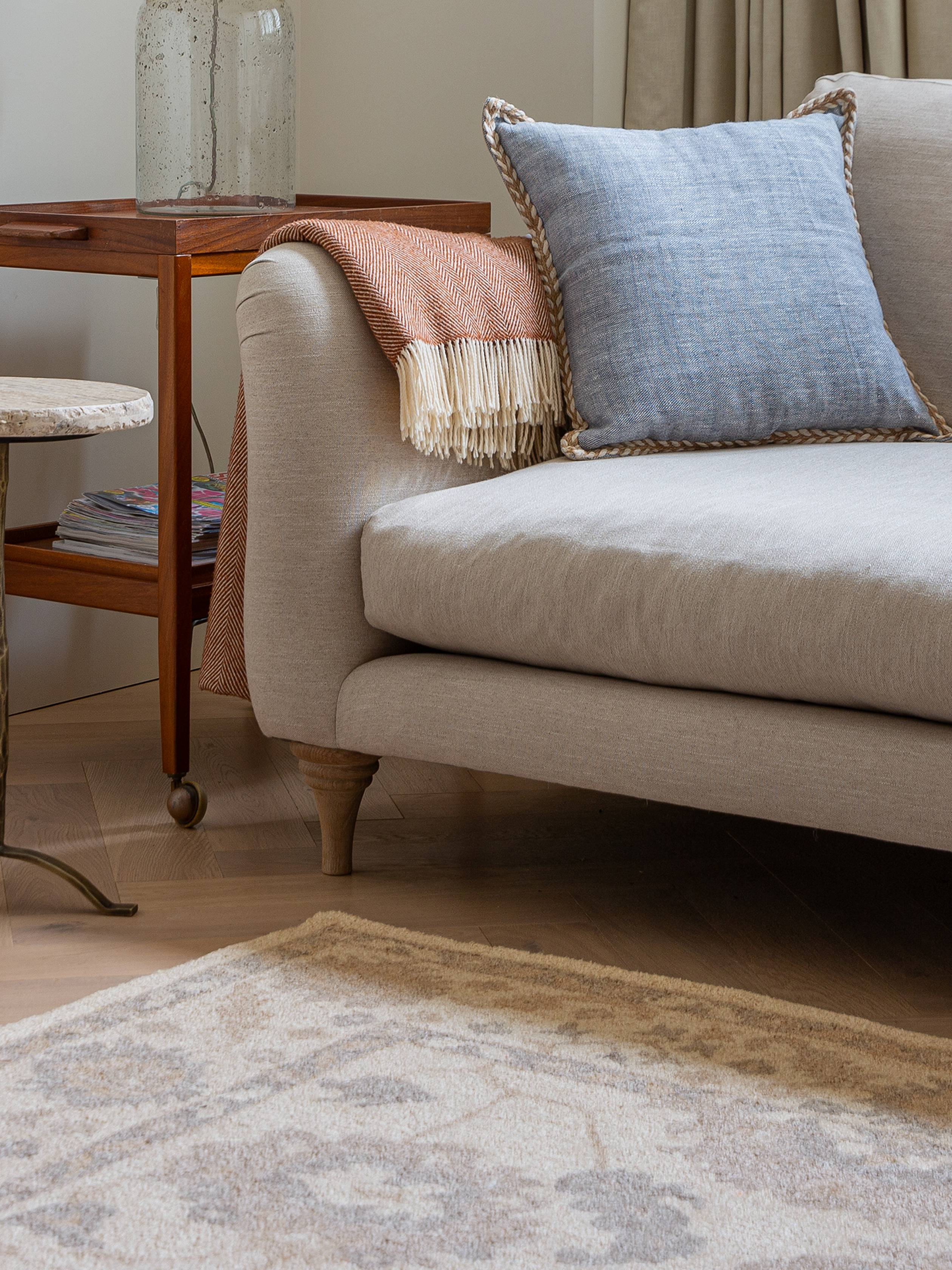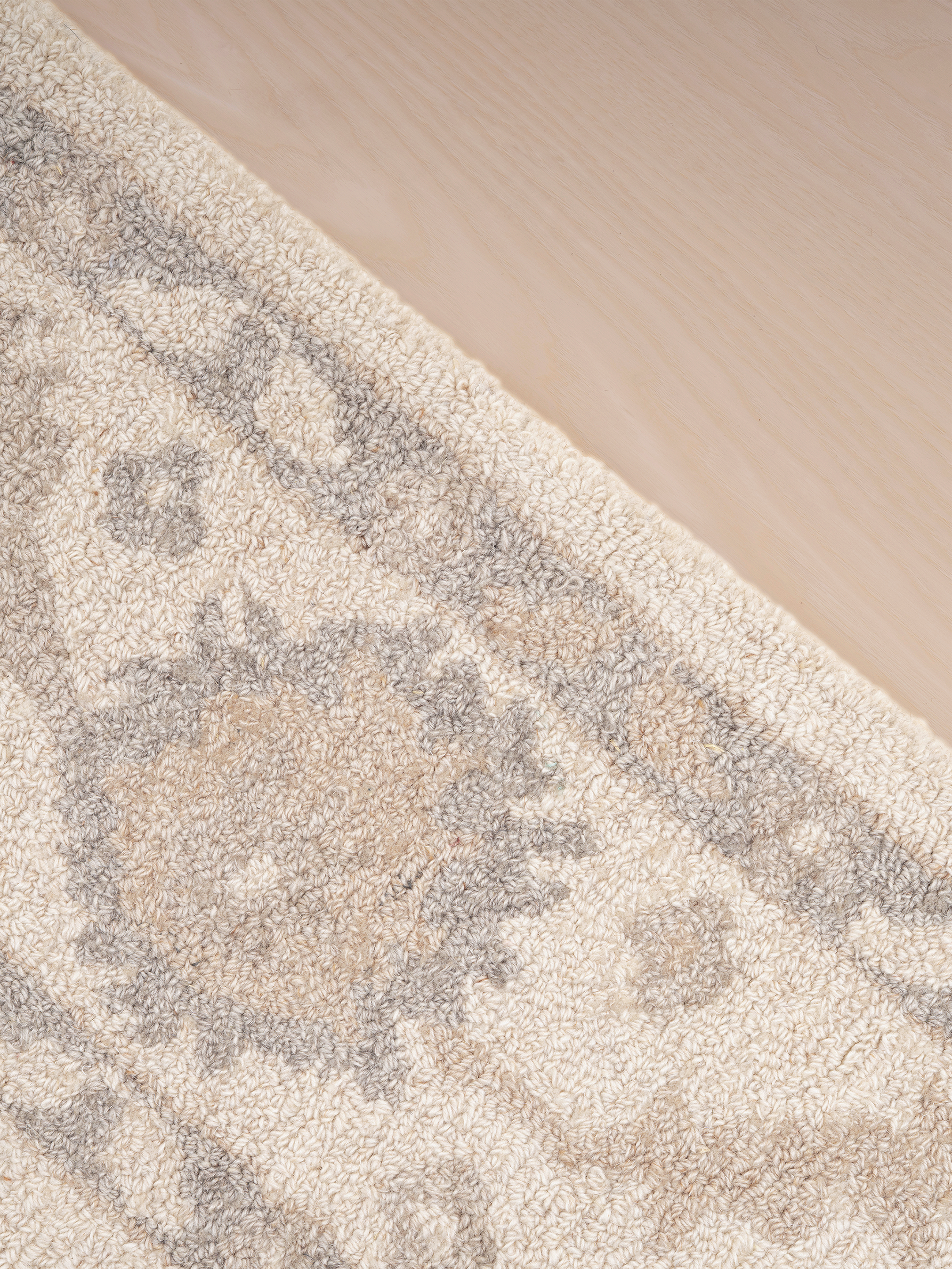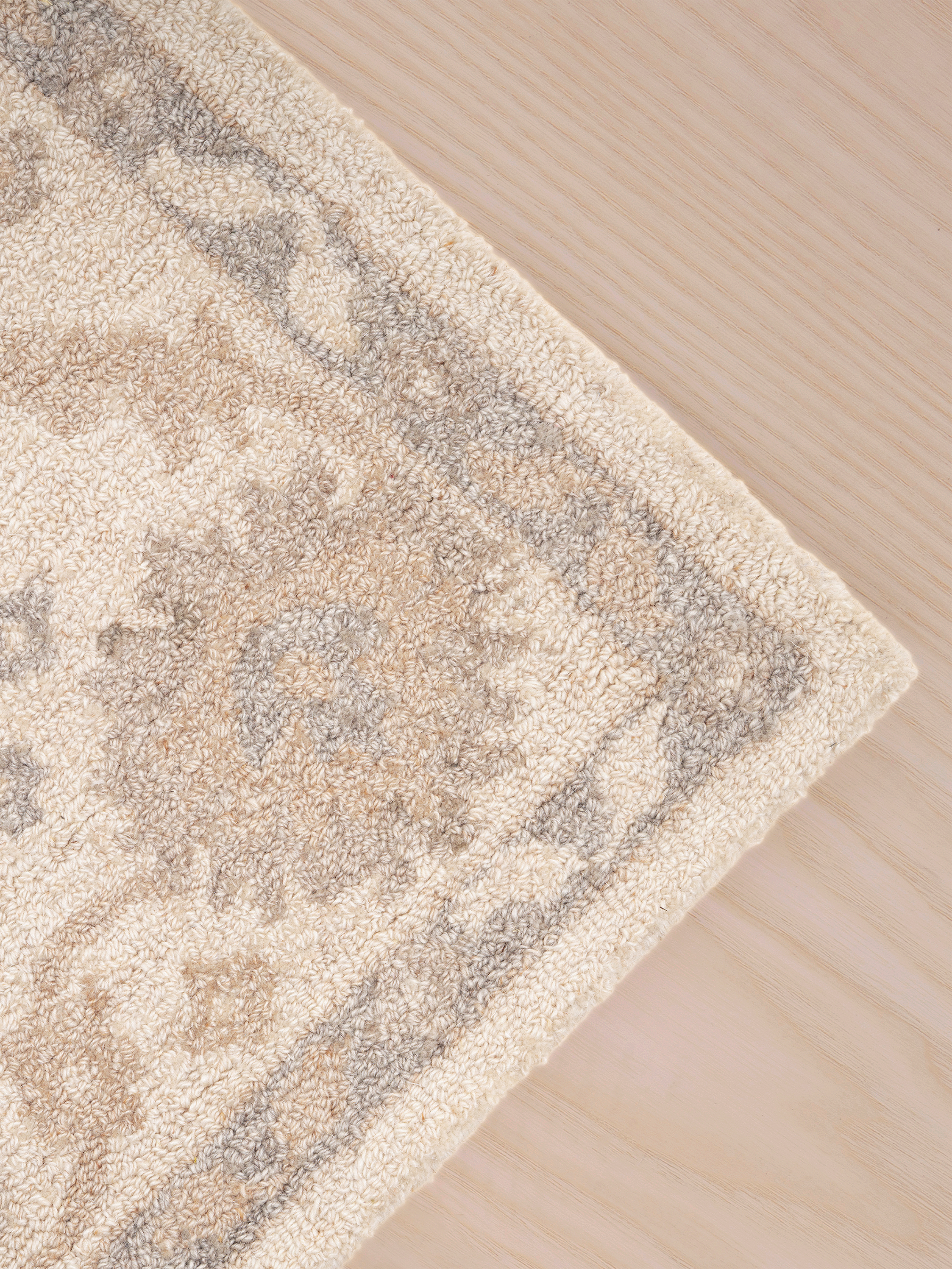 To keep your rug looking its best, shake or lightly beat it to remove dust, and rotate it regularly for even wear. Blot spills immediately with a clean, white cloth, keeping the rug as dry as possible. For tougher stains, professional cleaning is recommended. To preserve its colour and texture, avoid placing it in direct, prolonged sunlight. Do not pull any loose yarns. If needed, simply trim them with scissors so they sit neatly at the same height as the rest of the pile.