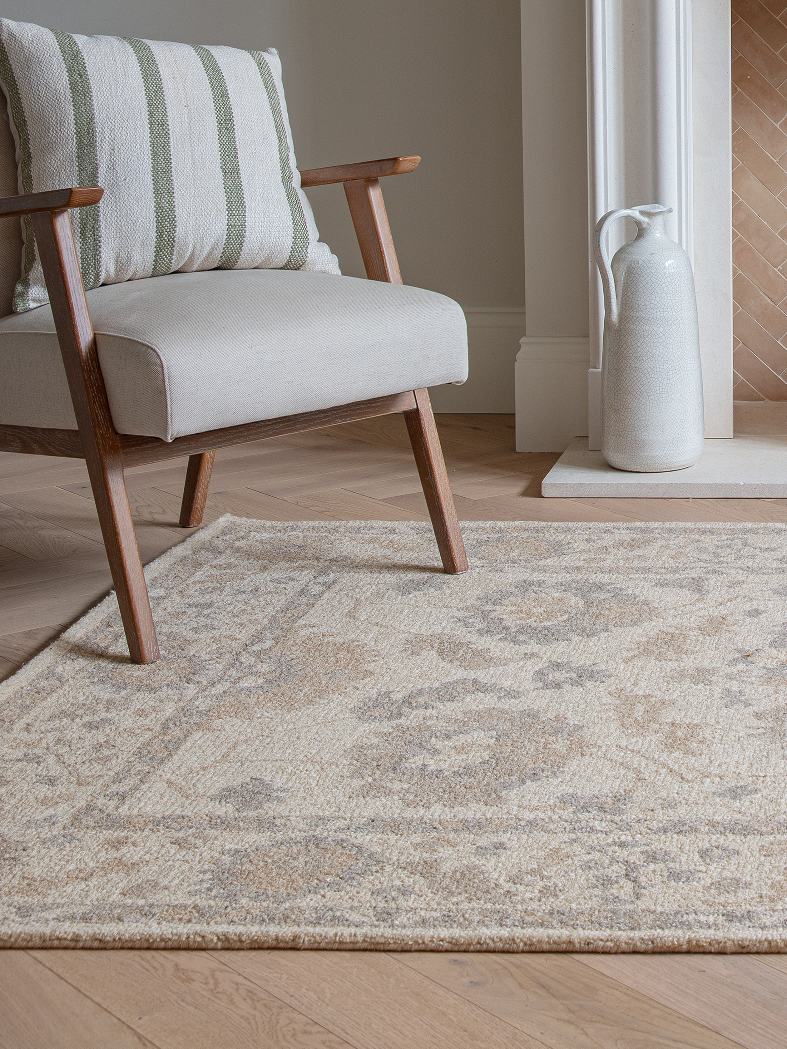 The warm, earthy tones of the Mia rug complement classic wood furniture, stone flooring, and neutral-toned décor. It pairs beautifully with antique brass accents, deep greens, and warm terracotta hues for a rich, inviting atmosphere.