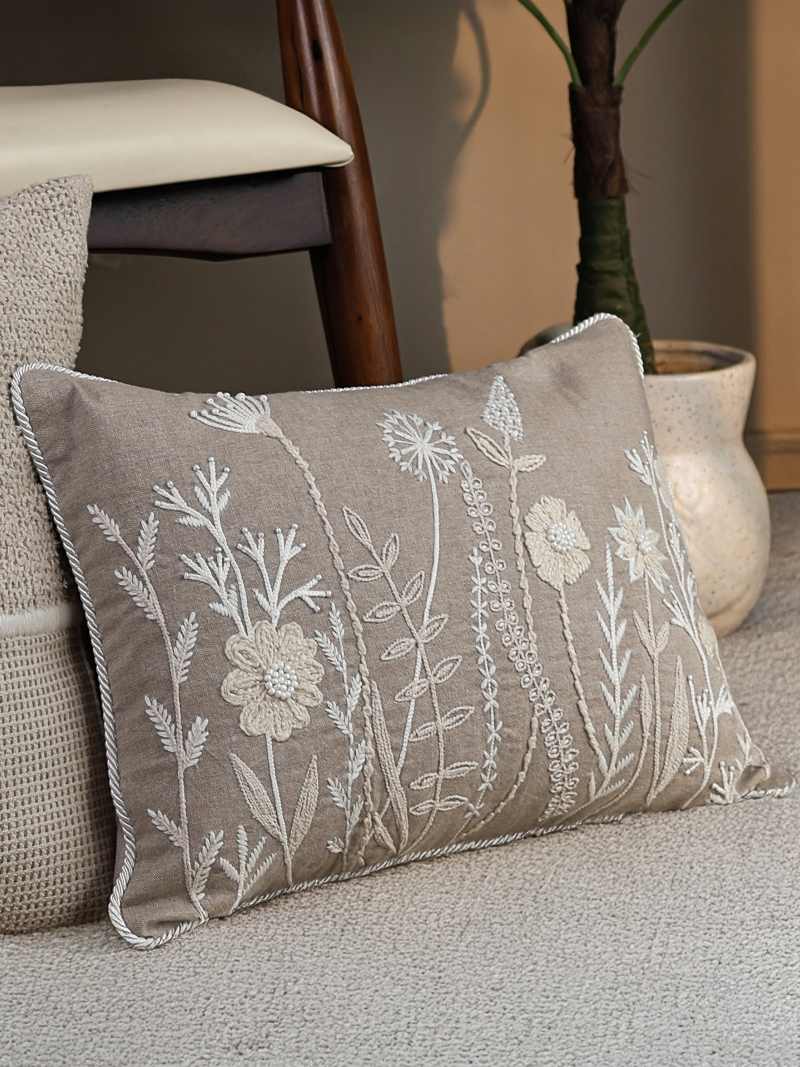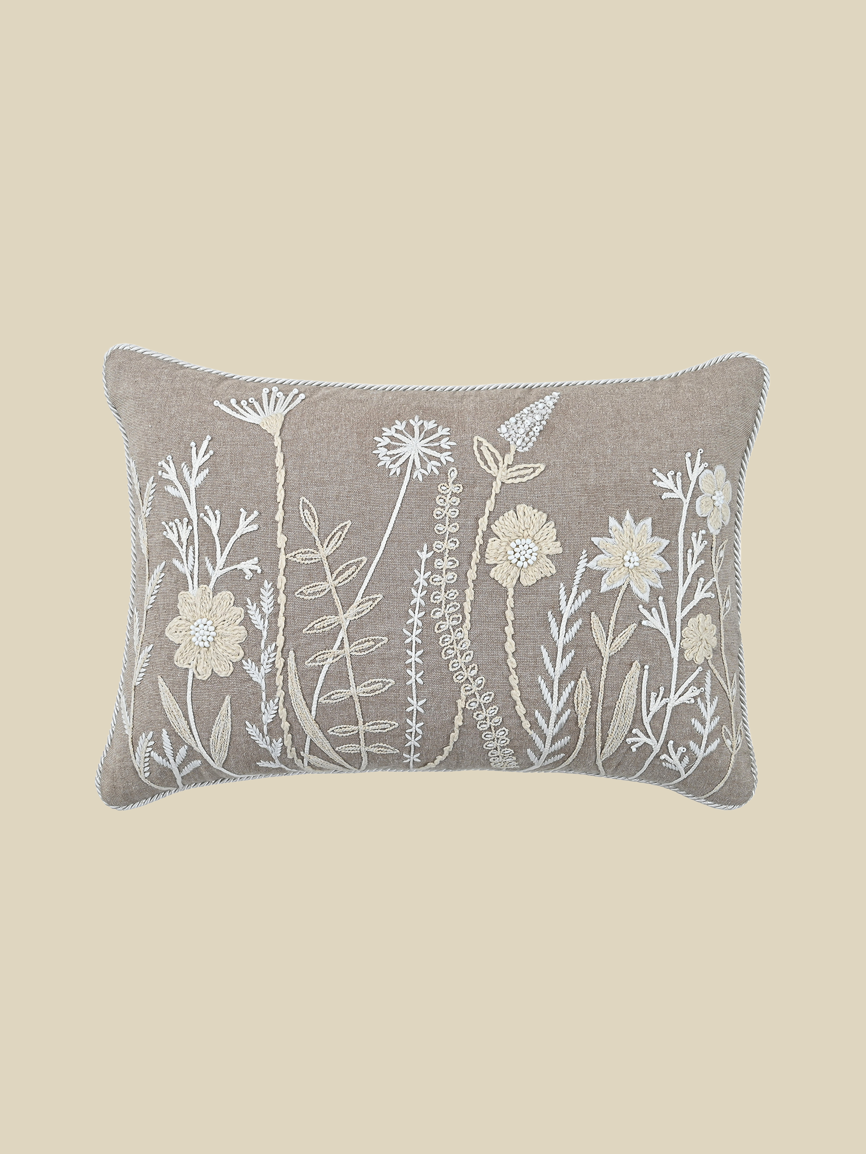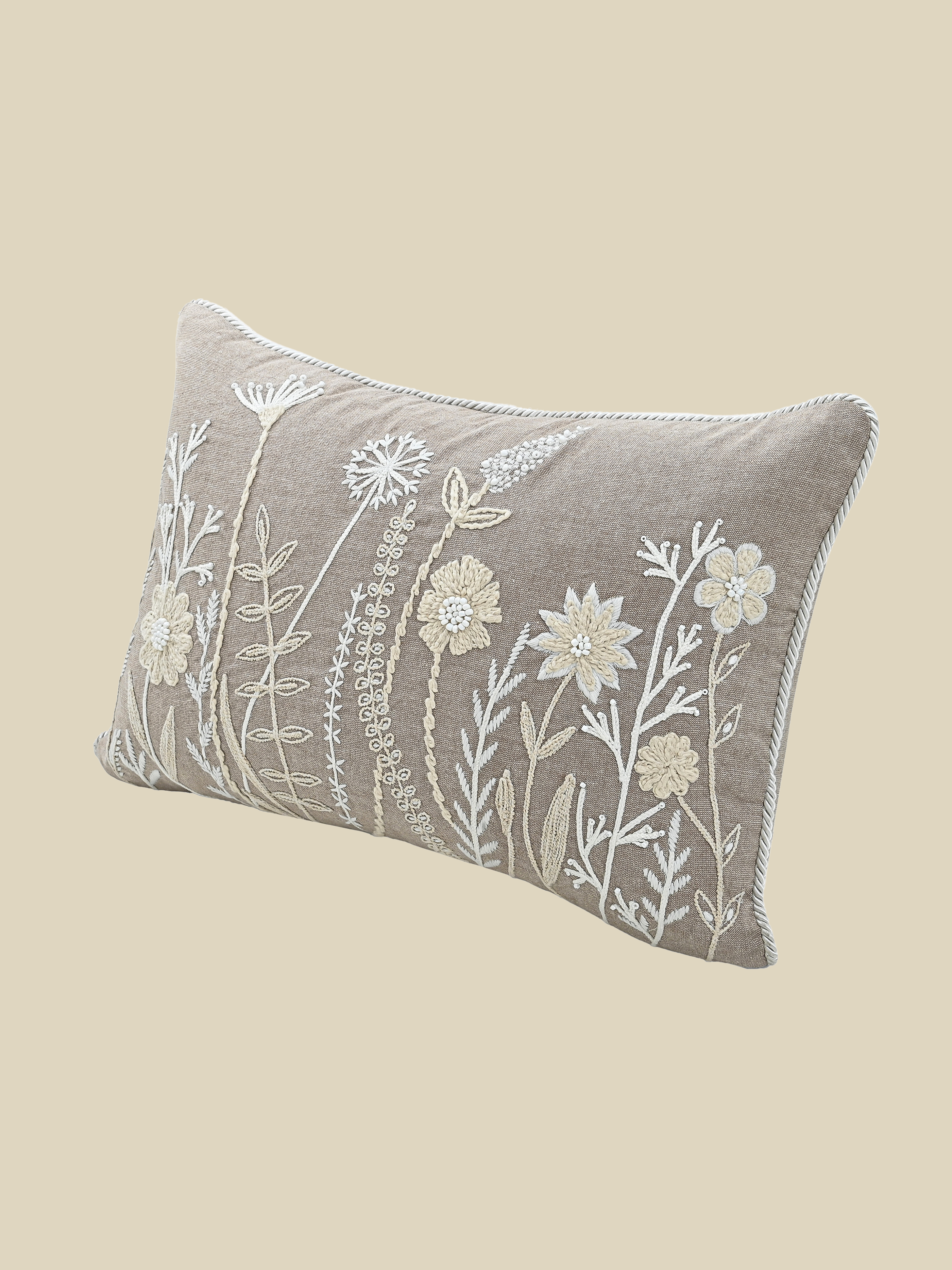 This rectangular cushion features intricately embroidered ivory florals set against a warm beige canvas, finished with a hidden zip for a clean, tailored look.