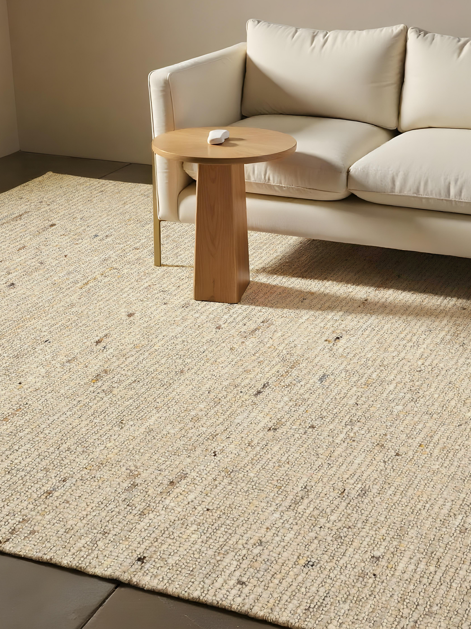 • Hand-woven wool rug with a soft, nature-inspired texture