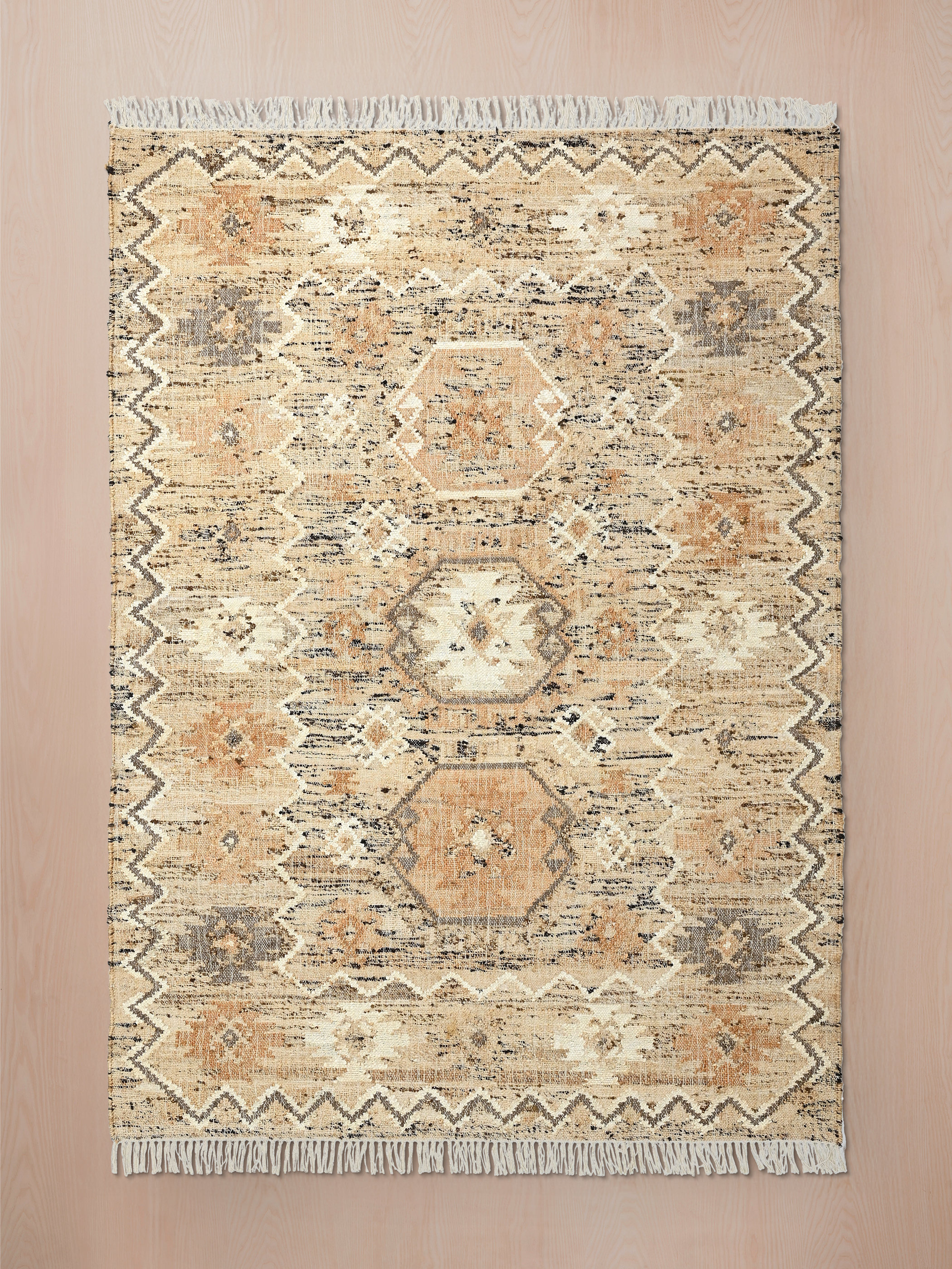 Ruh, the hand-woven rug, is like poetry for your floor. Made with natural jute, its earthy tones of beige and brown give off a cosy, rustic, welcoming vibe. The abstract geometric patterns and soft tassels make this rug a standout piece. It not only creates a pretty sight but is also a nod to eco-friendly living.