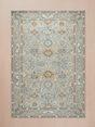 • Intricate Persian-inspired botanical patterns in sky blue, brown, and grey