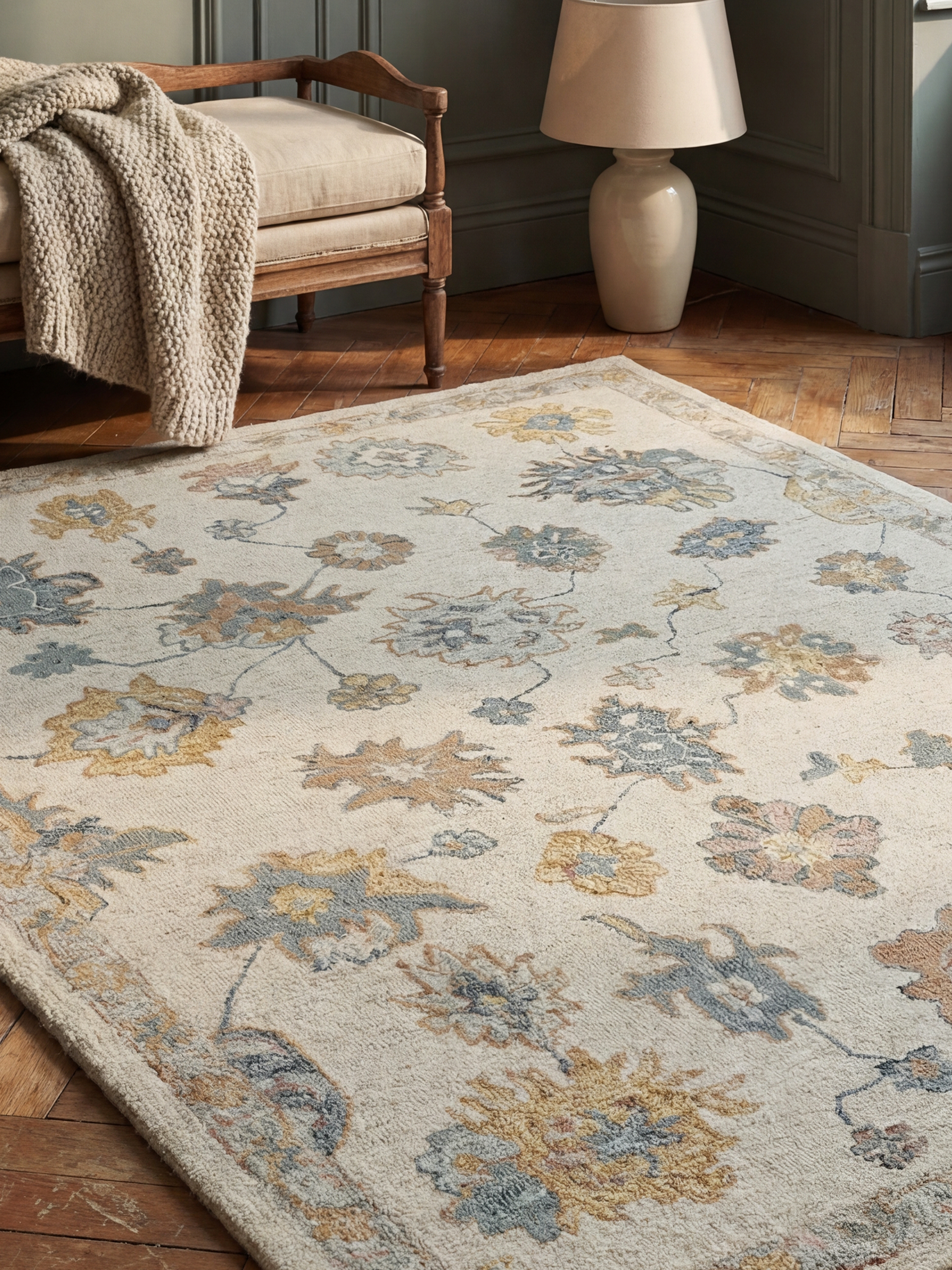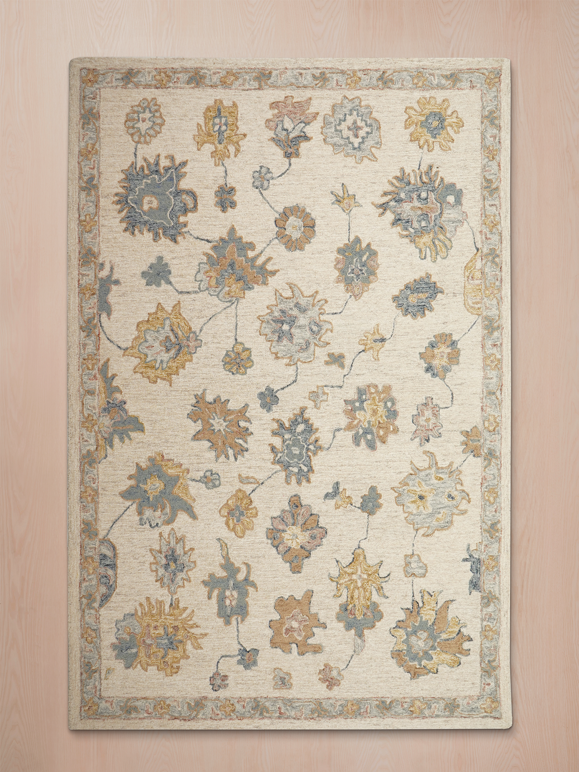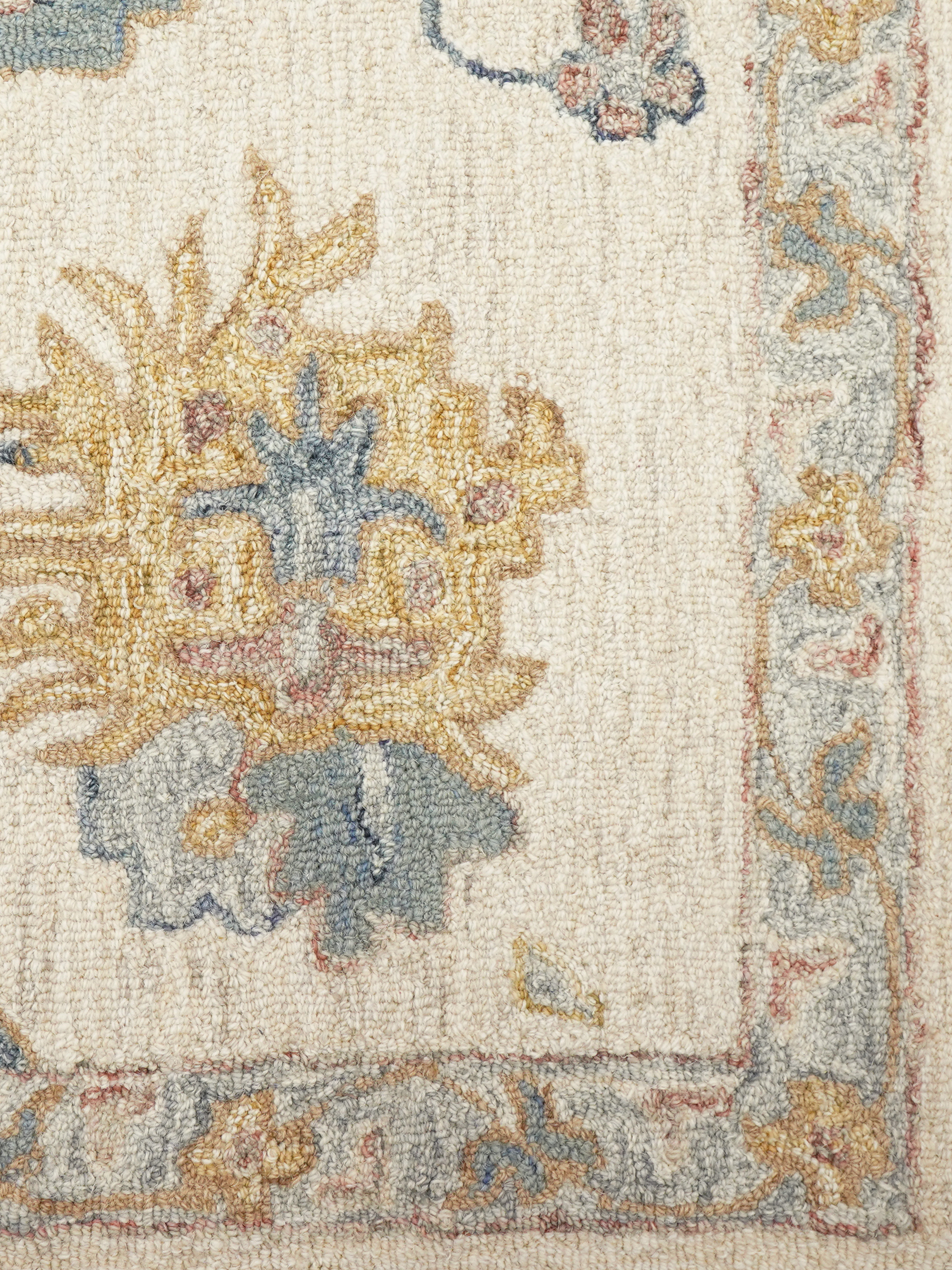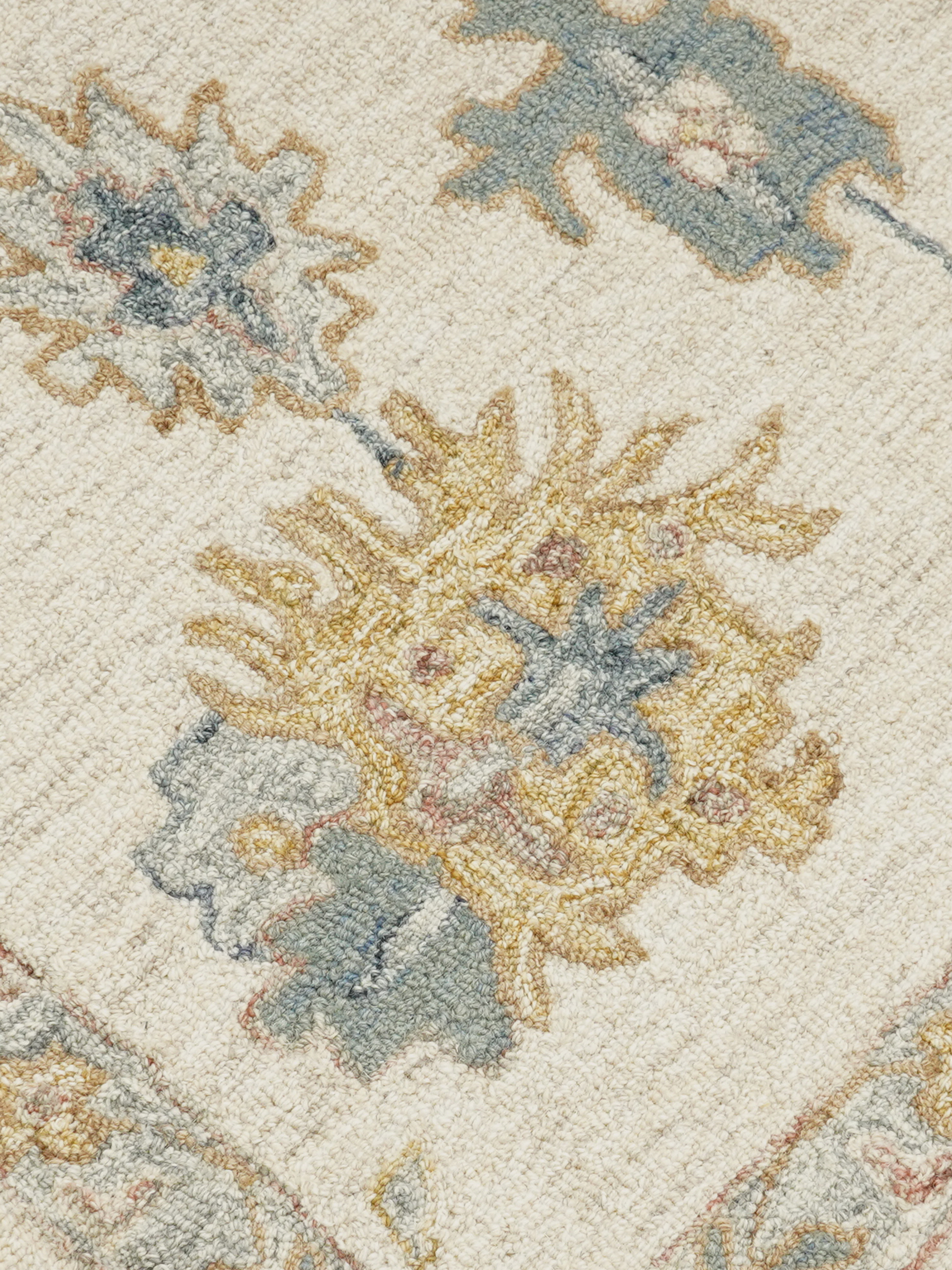 • Ivory base enriched with beige, blue, rust, and ochre tones