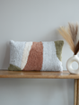 A rectangular cushion with a bold abstract tufted design in rust, olive, and beige, finished with a hidden zipper closure for a clean, polished look.