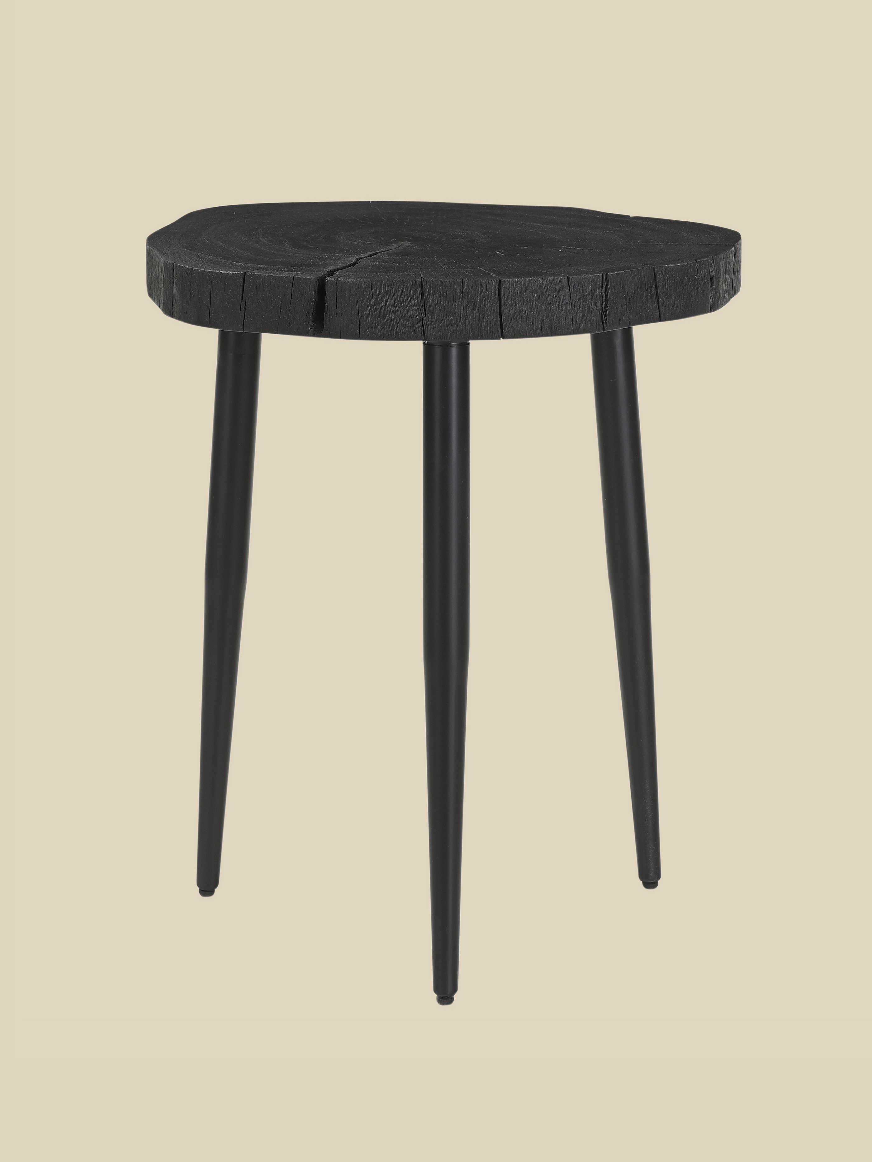 The Logan Side Table showcases the organic beauty of solid acacia wood with its distinctive live-edge top, ensuring each piece is truly unique. Complemented by black tripod-style iron legs, it blends natural textures with industrial sophistication, making it a versatile statement piece for any space.