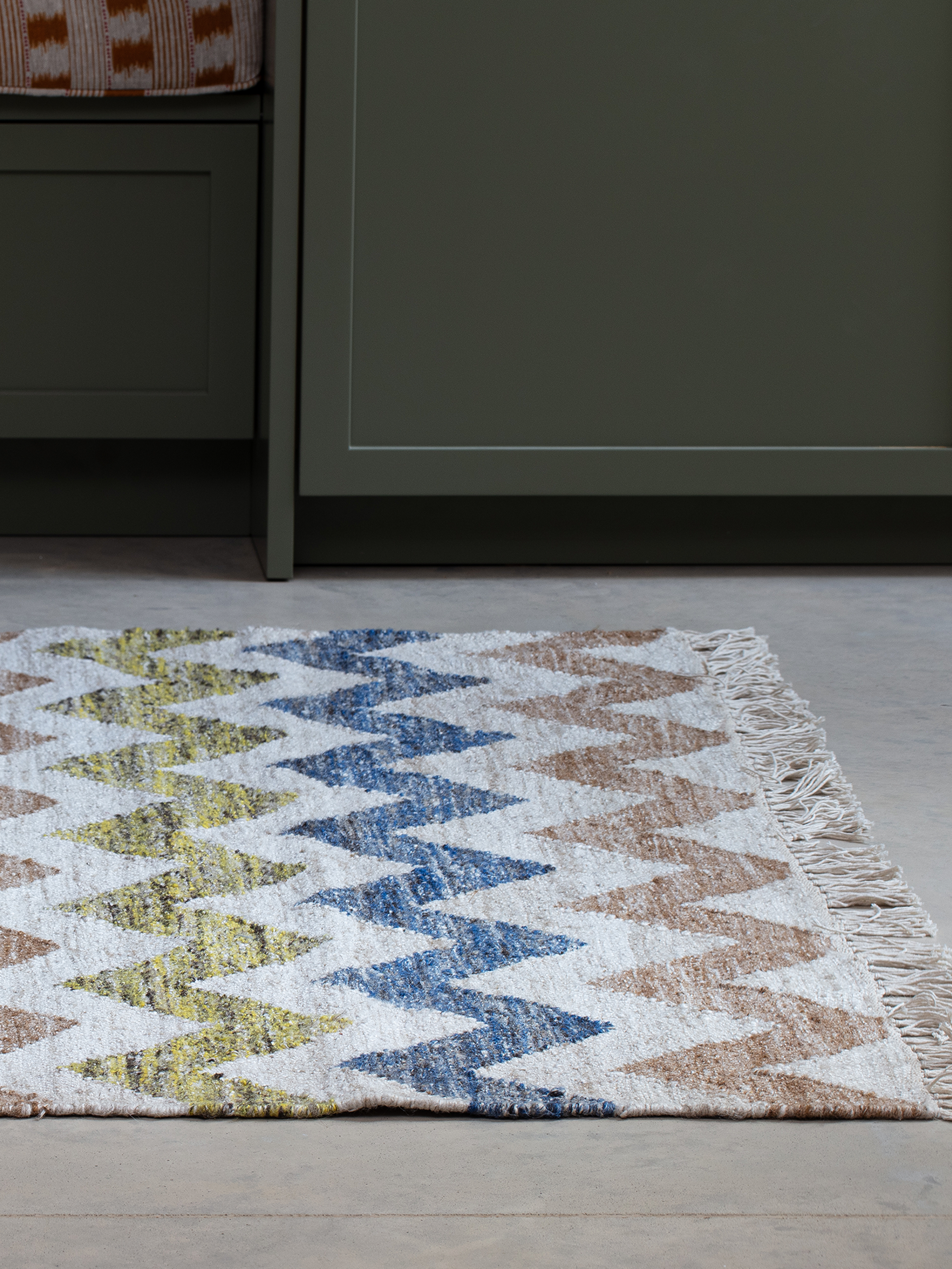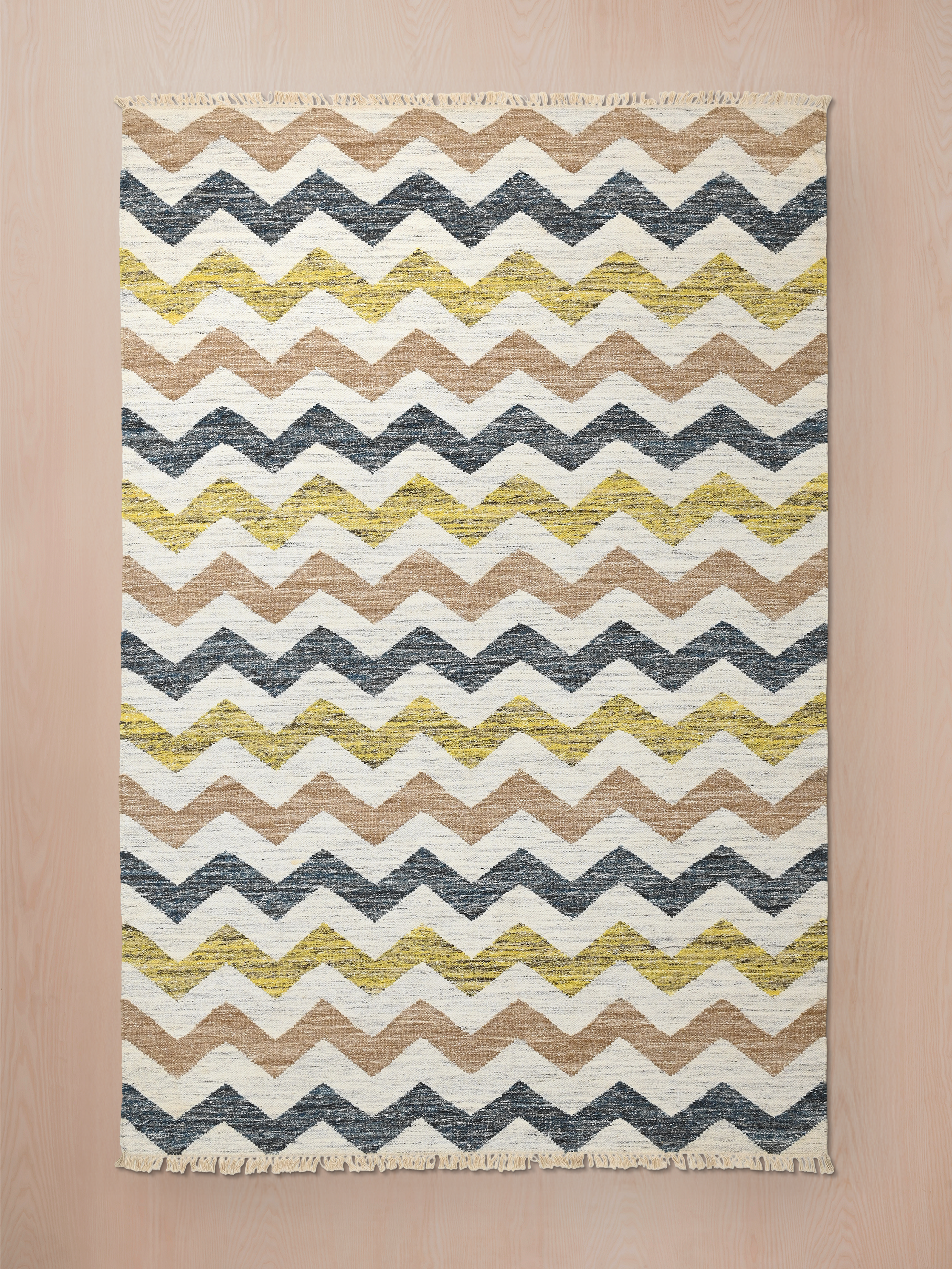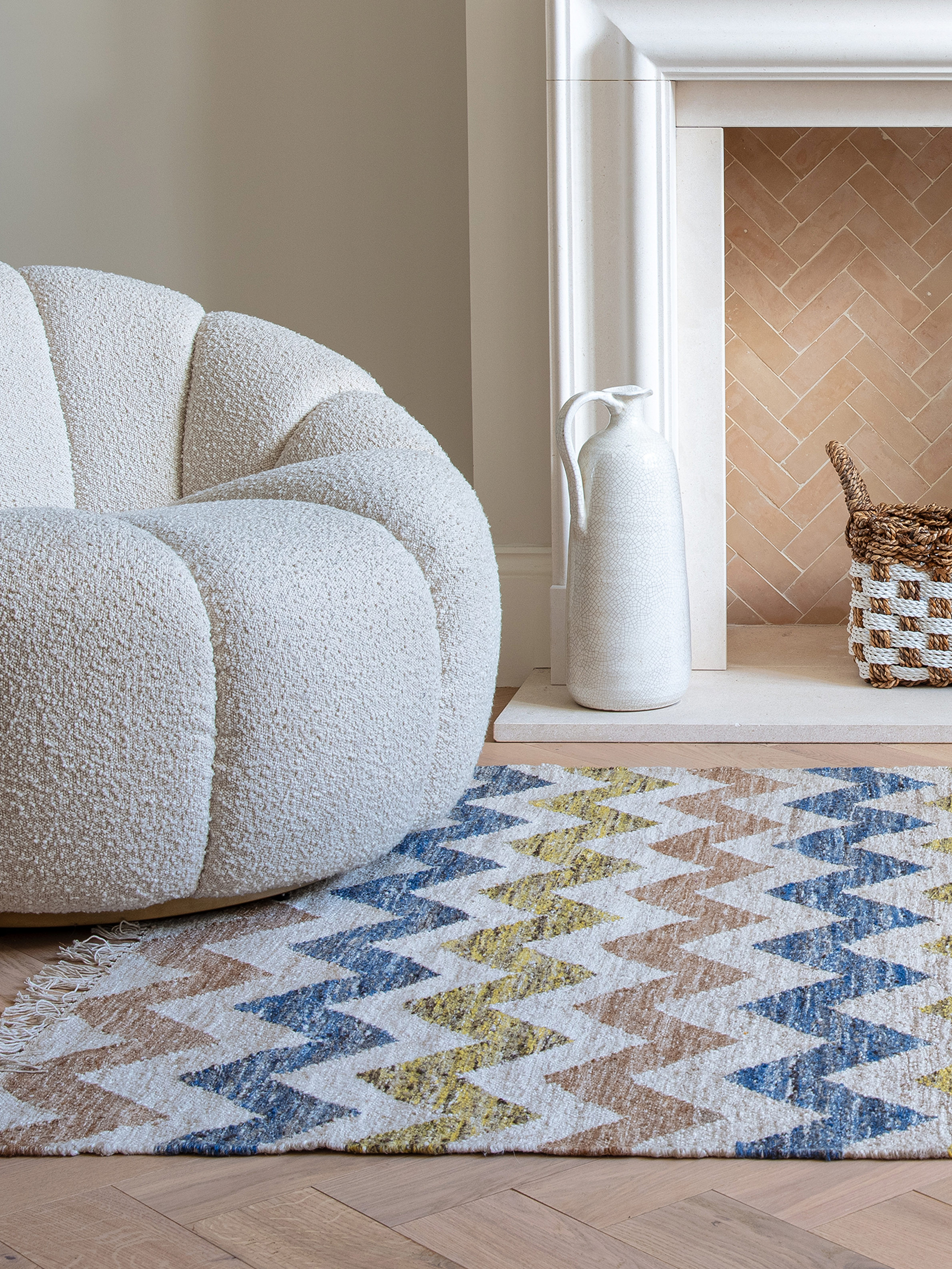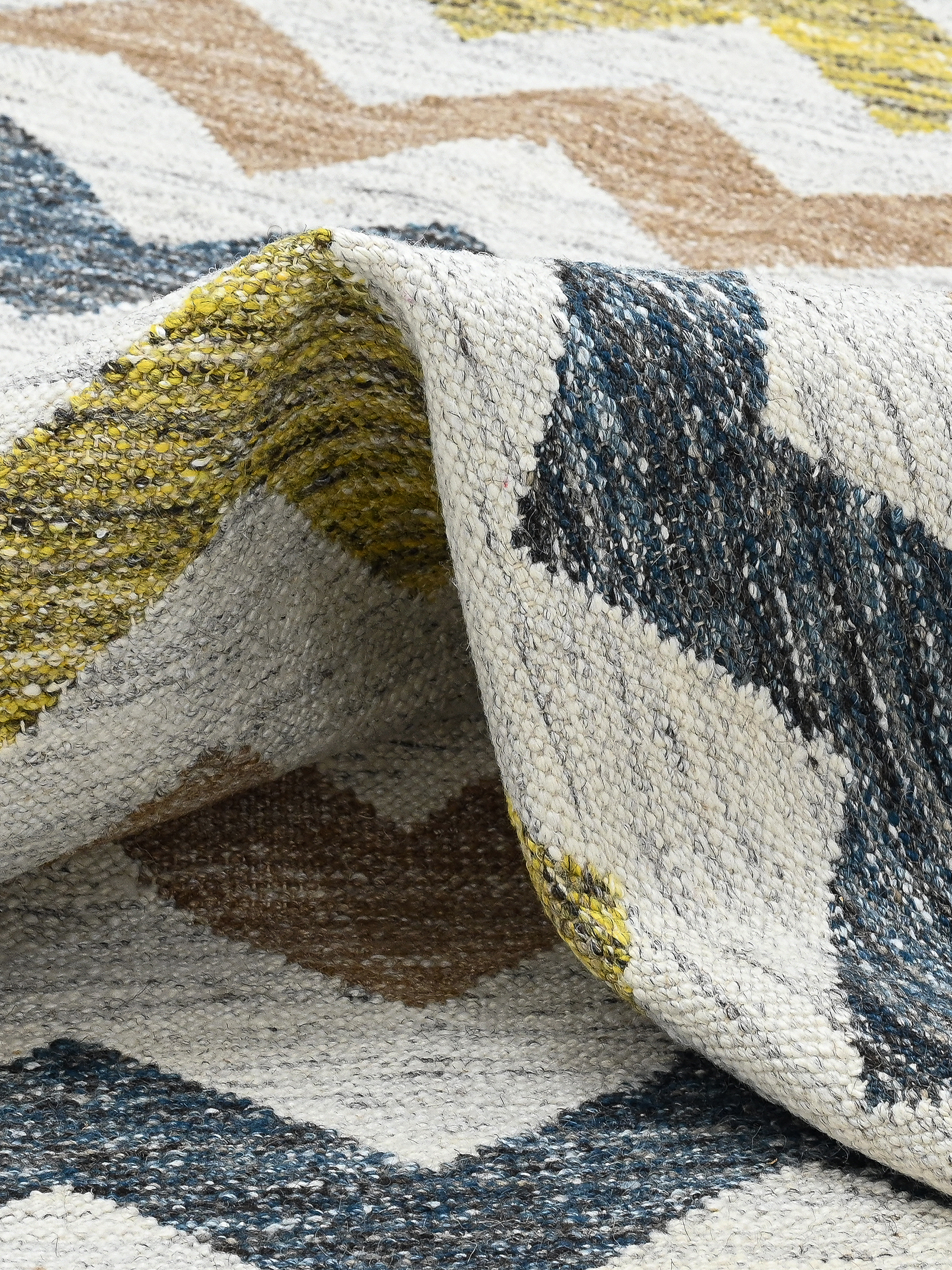A cheerful mix of warm yellows, soft neutrals, and cool greys makes Solvi a versatile statement piece. The subtle contrast between these hues adds depth without overwhelming the space. Pair it with natural wood, crisp whites, or muted pastels for a balanced and inviting aesthetic.