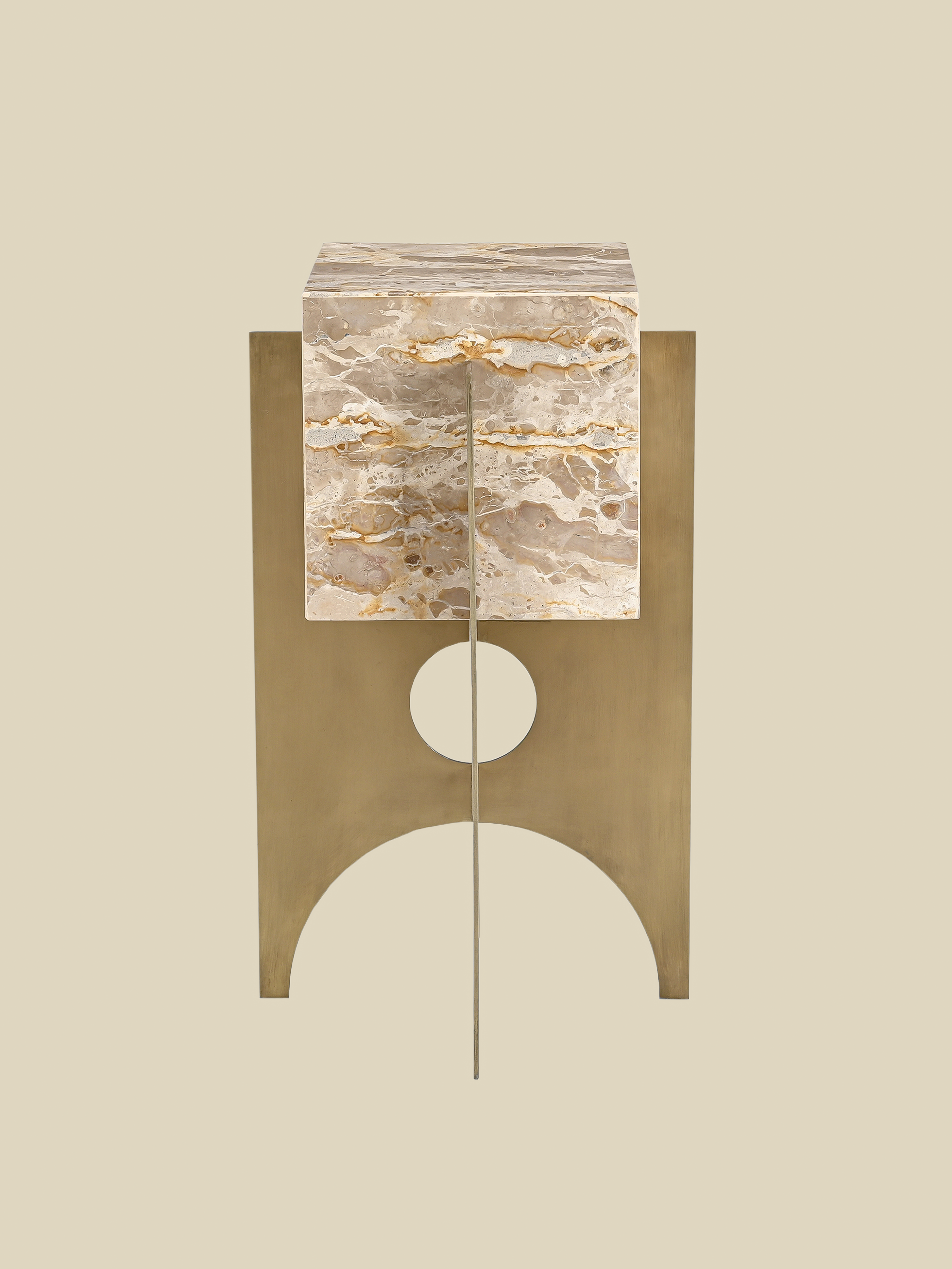 The Aurex Side Table is an elegant fusion of natural luxury and modern design. Its Crema Antique Marble top radiates warmth and sophistication, offering a flawless surface for your favourite décor, while the antique brass-polished iron base adds a structured, geometric touch. Whether styled beside a plush sofa or as a standalone accent, Aurex brings effortless glamour to any space.