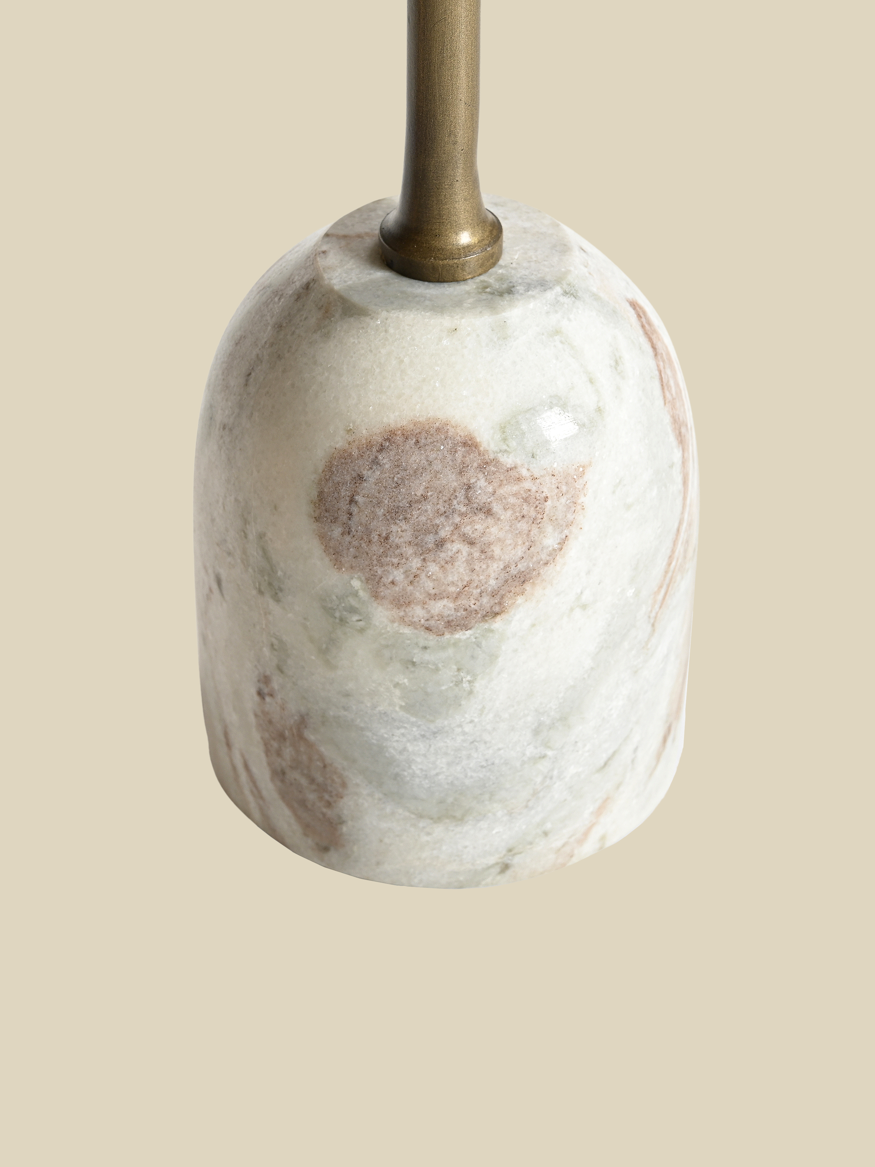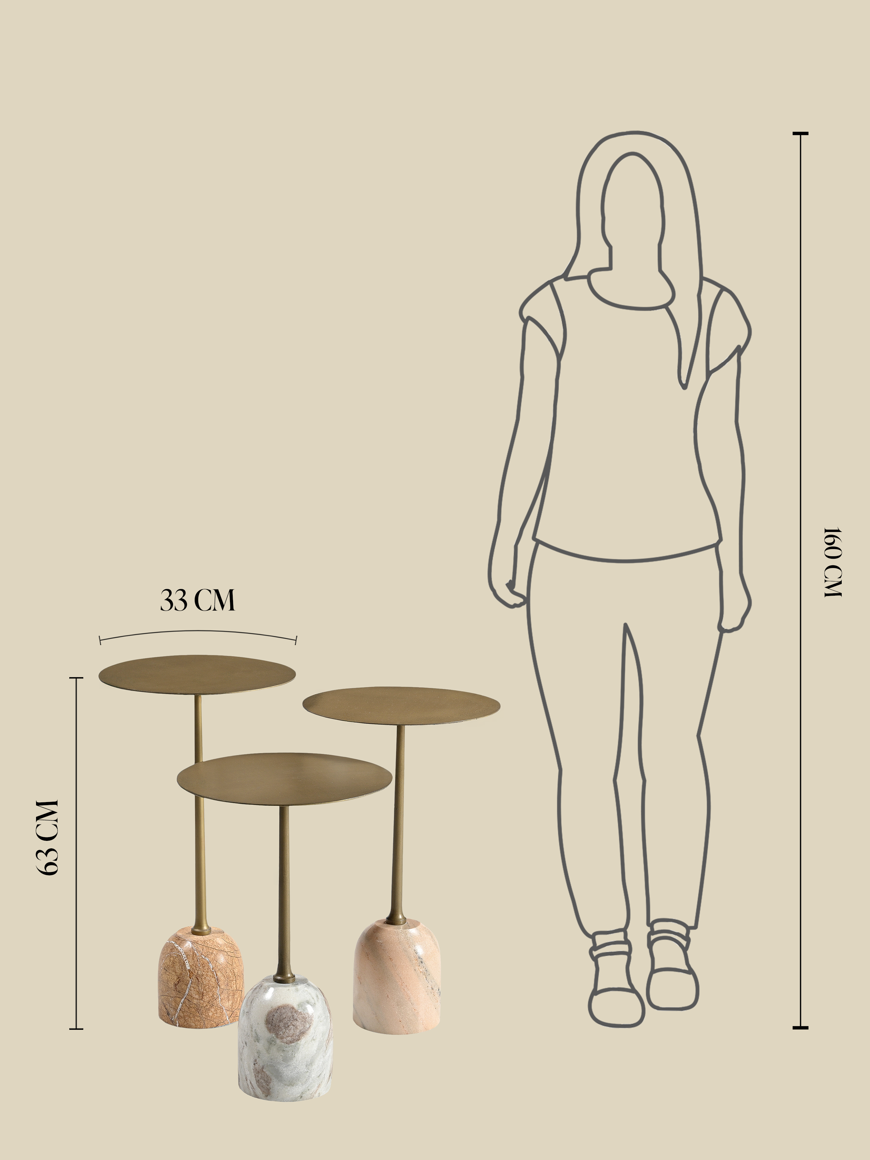 Each base features a different marble tone, adding natural pattern and colour variation. The antique brass-finished iron tops feel warm and luminous, while the trio’s varying heights bring visual rhythm and dimension.