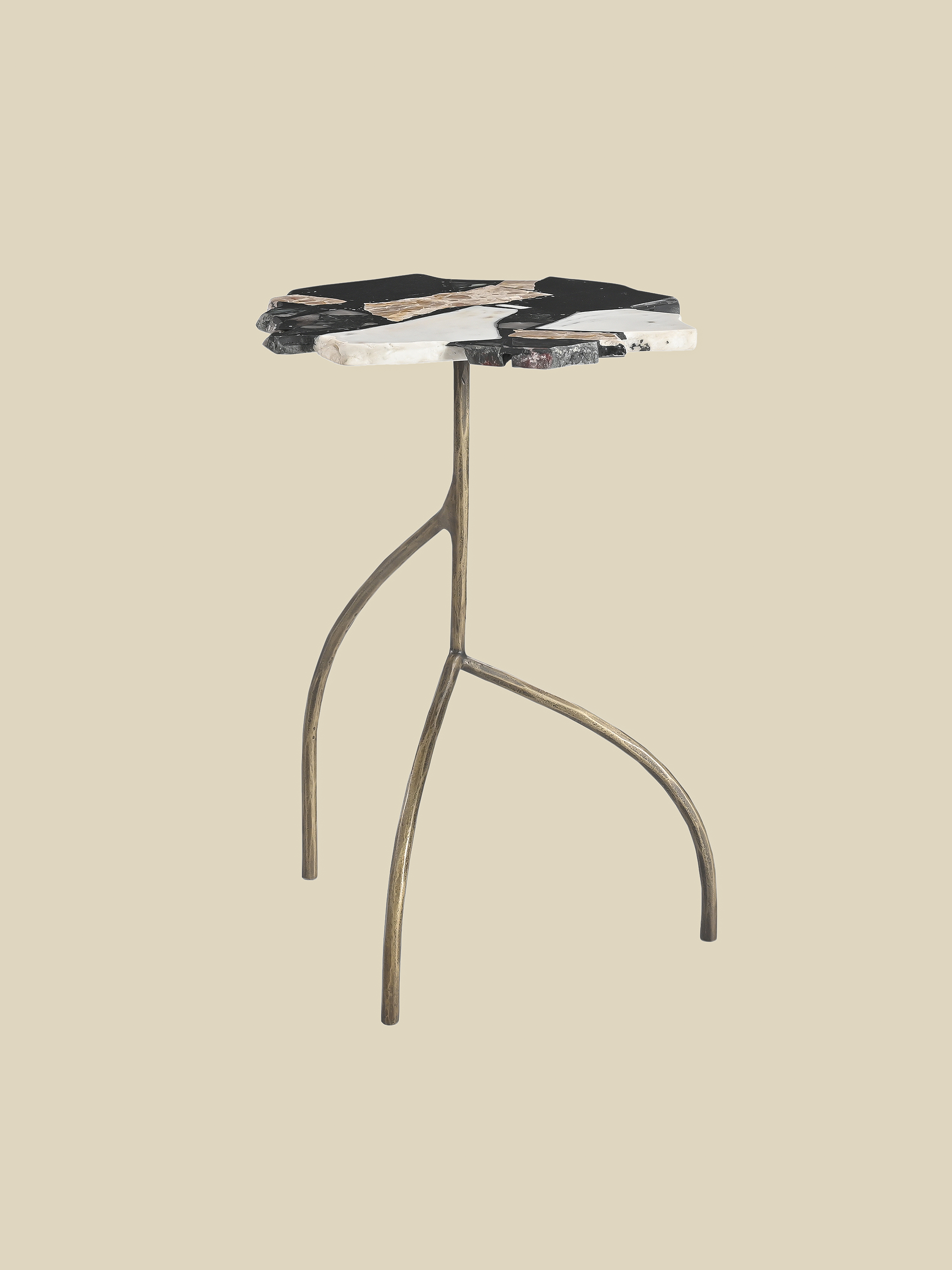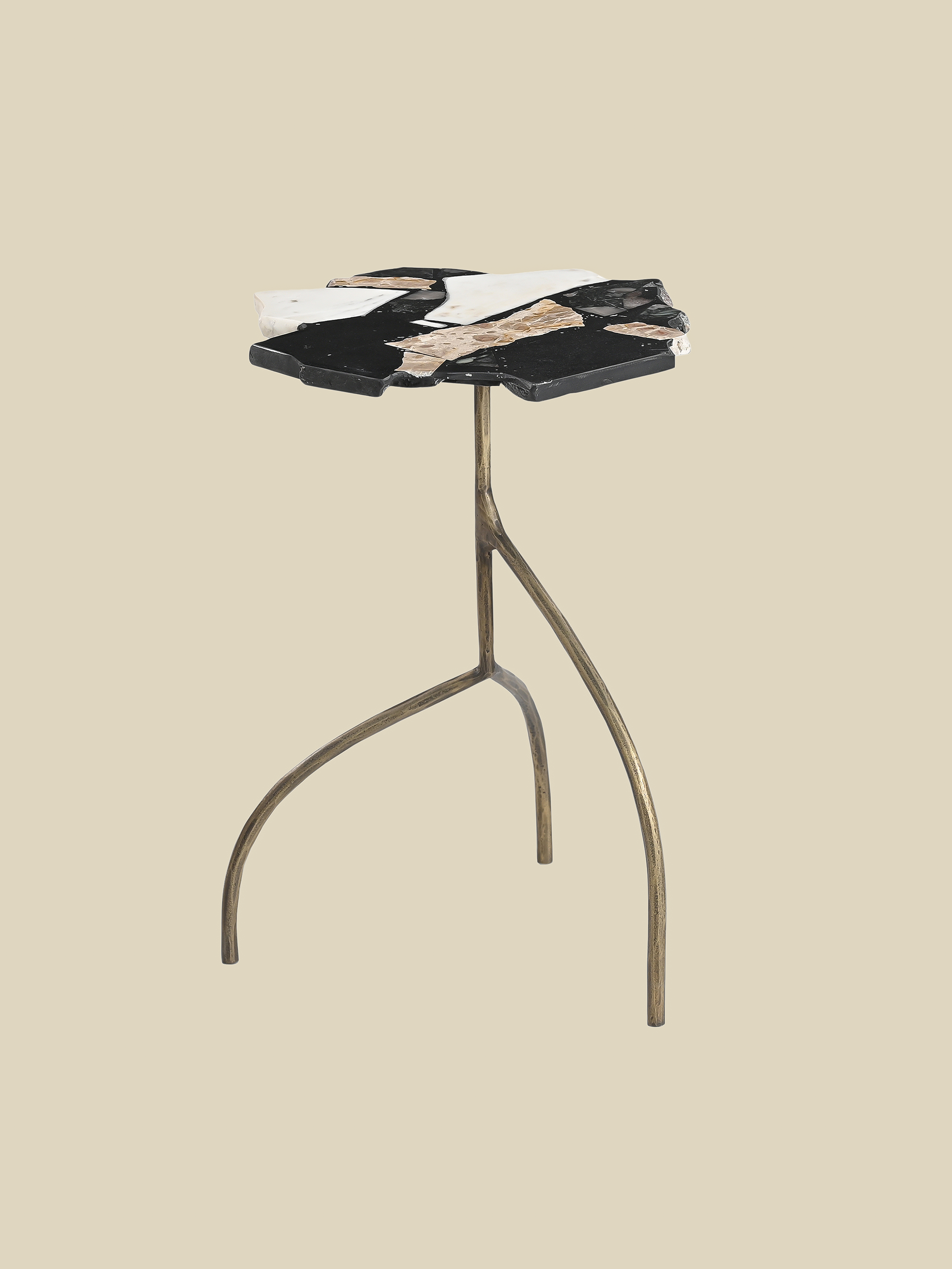 The Maverik Side Table redefines the tripod aesthetic with an unexpected twist. Its striking round top, crafted from mixed marble terrazzo, brings a playful yet sophisticated edge, while three antique brass-finished iron legs provide a sleek, sculptural foundation. Whether styled as a statement piece or paired with contemporary décor, Maverik is made for those who love furniture with a personality.
