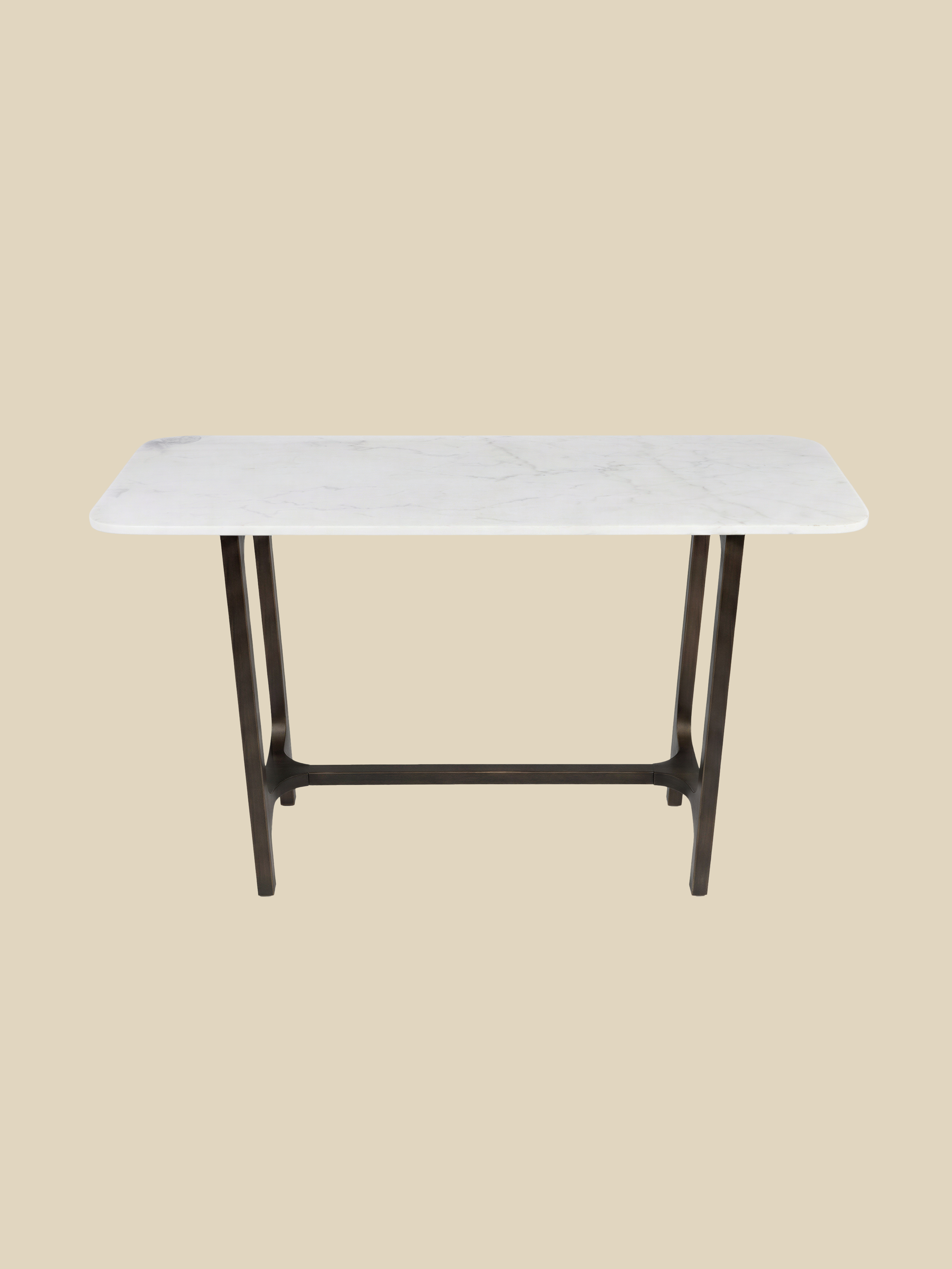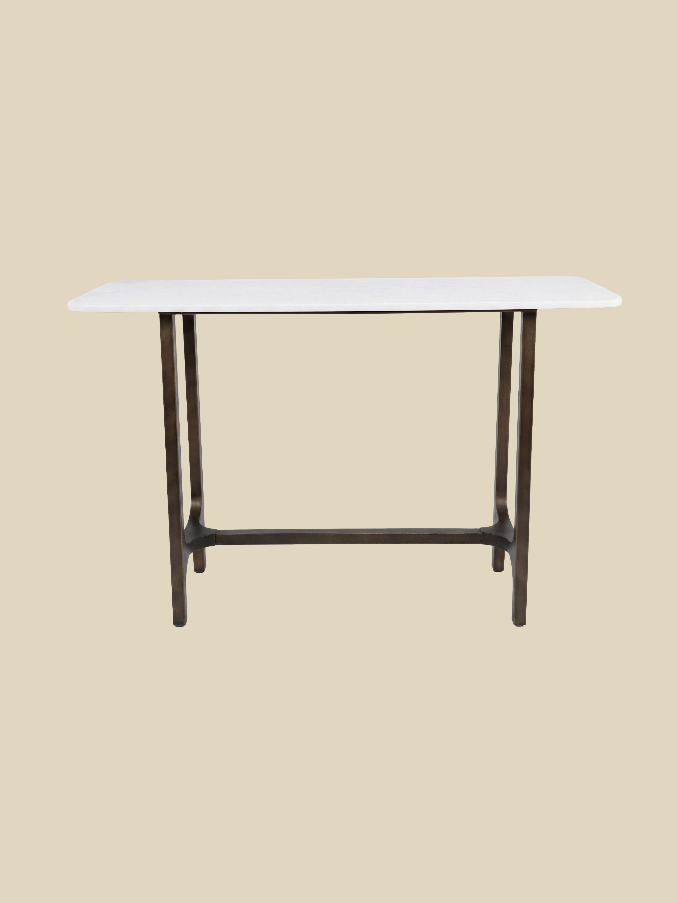 A white marble console table with a metal base, designed to add a refined statement to hallways and living areas.