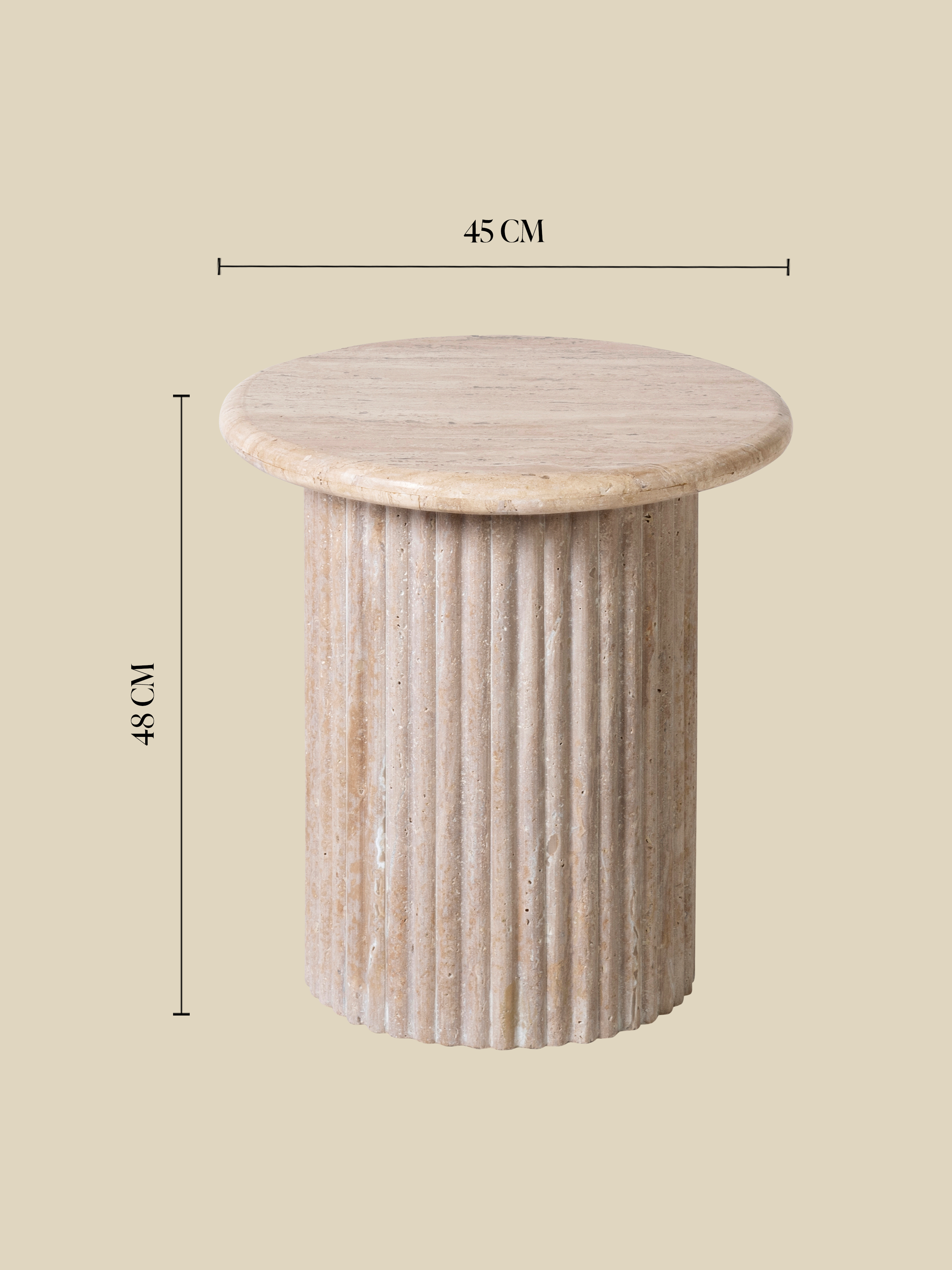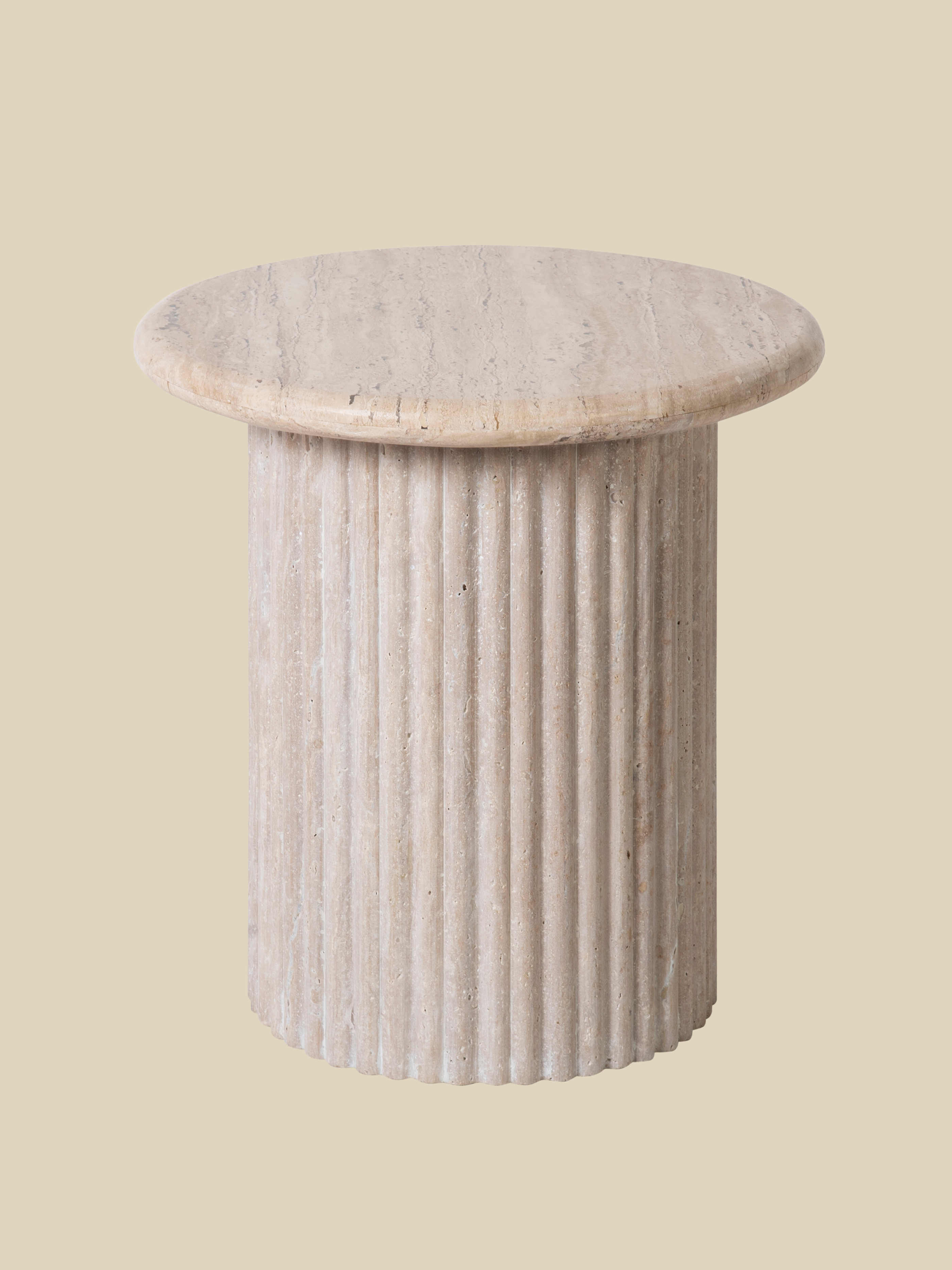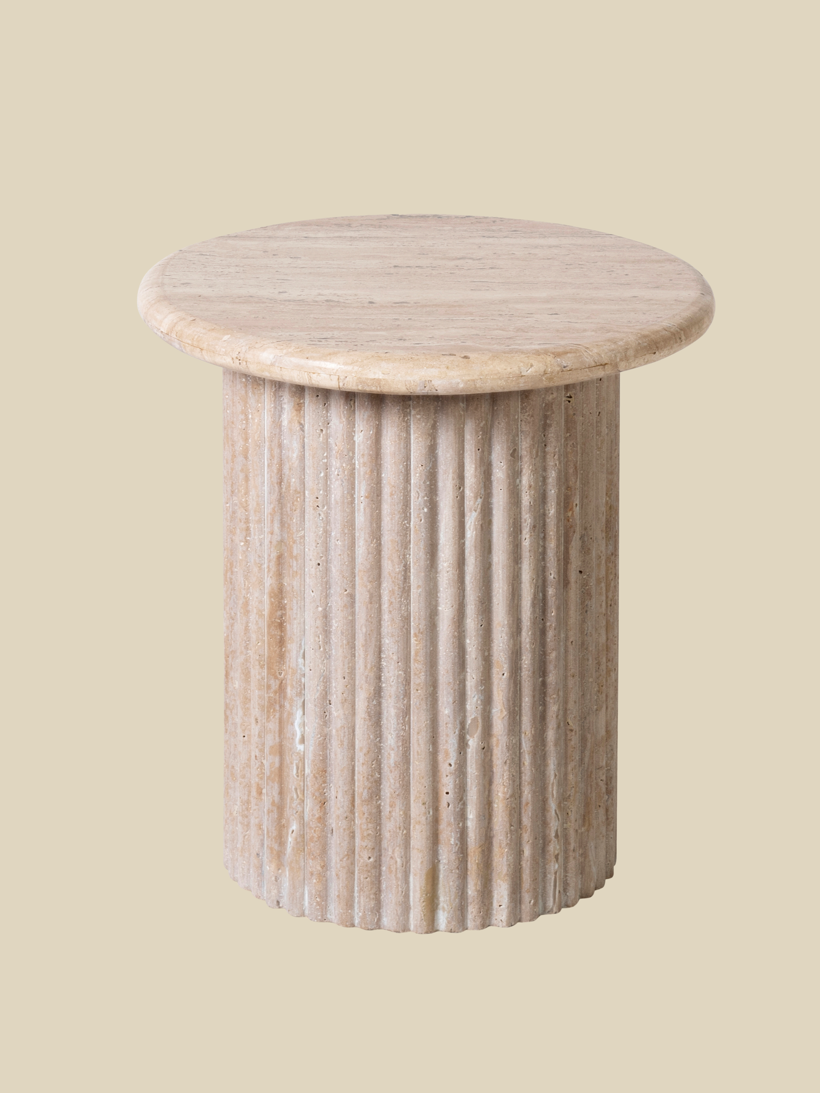 The Solace Side Table combines natural beauty with modern simplicity. Its smooth, round travertine top contrasts gracefully with the textured, fluted cylindrical base. With a soft beige hue, this side table is all things subtlety and impact.