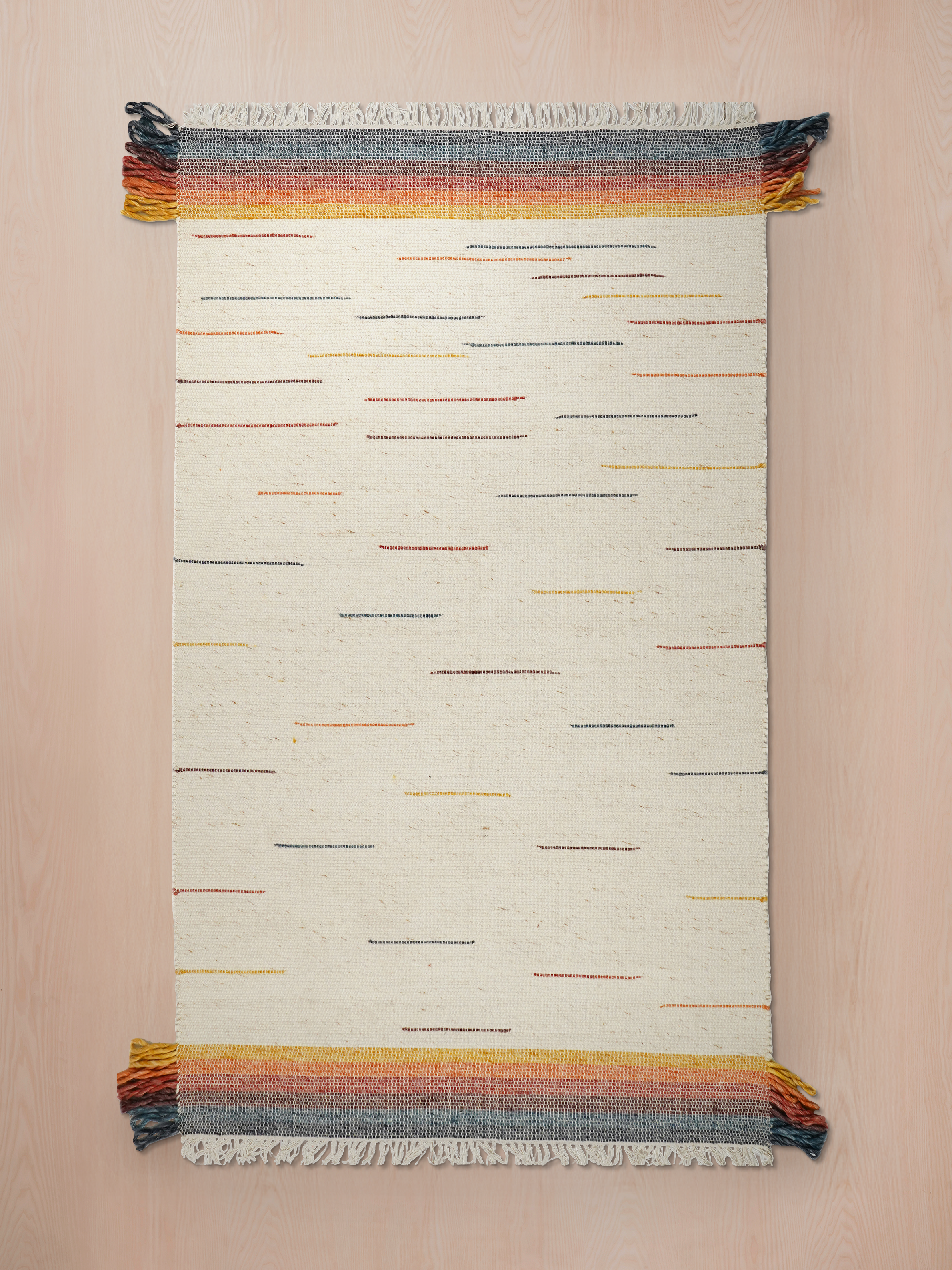 Hand-woven on a loom from a blend of wool and cotton, the Ava hand-woven rug celebrates colour and texture by combining a minimalistic, multi-coloured striped pattern with an ivory base.