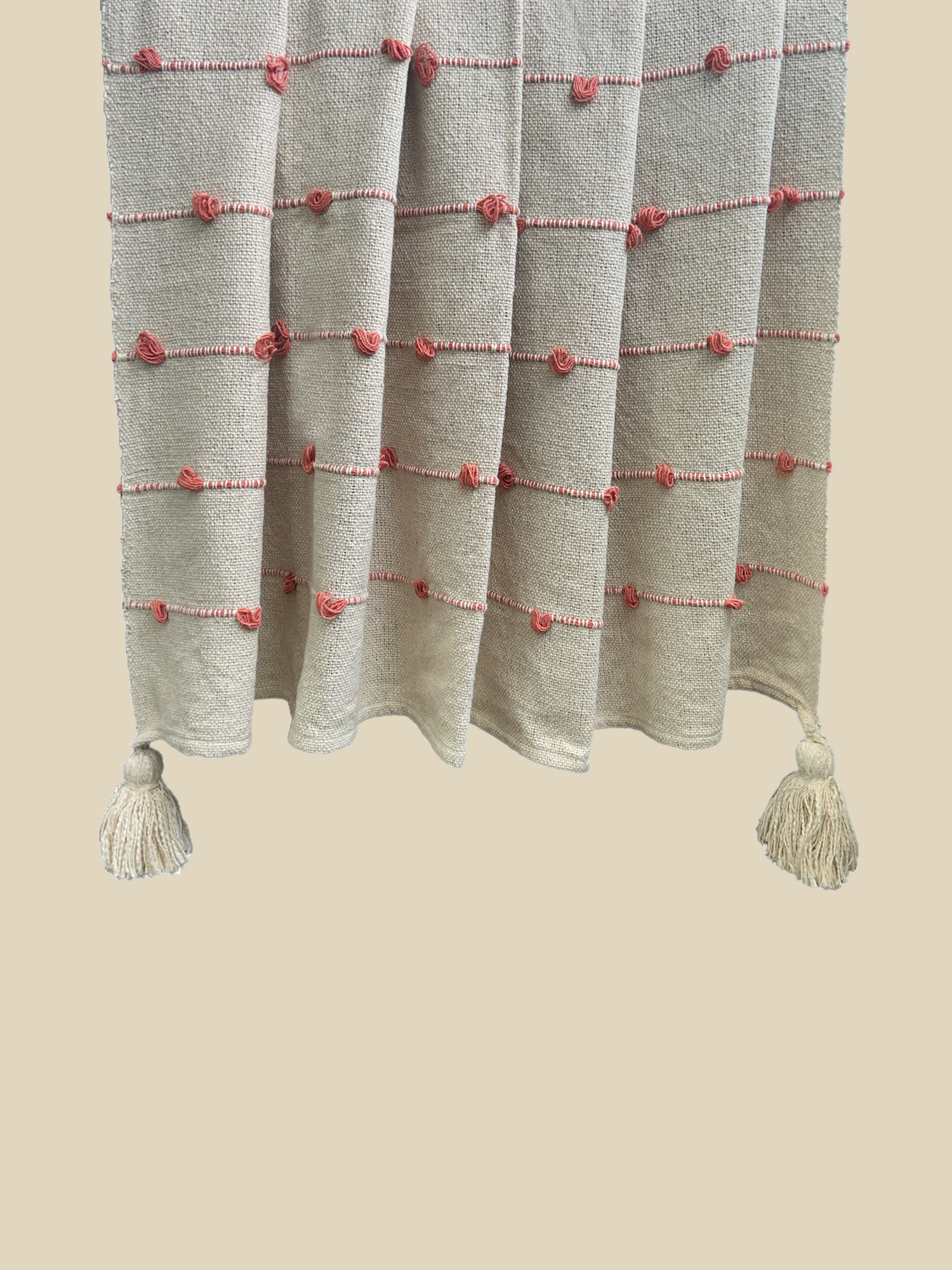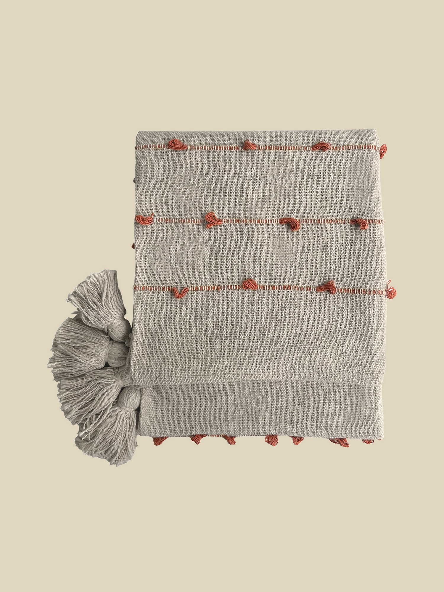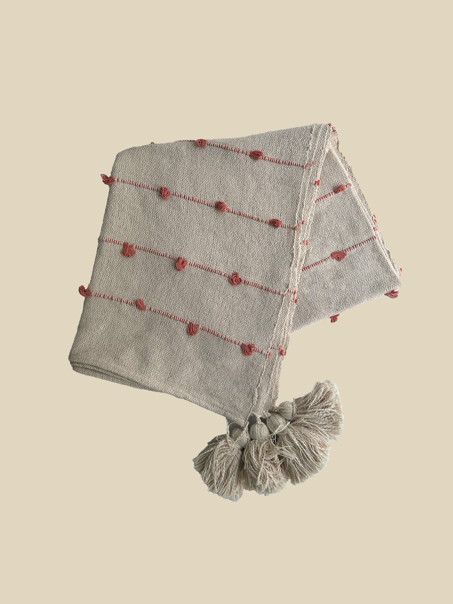 A lightweight cotton throw with an off-white base, coral stripes, and looped detailing for chic texture.