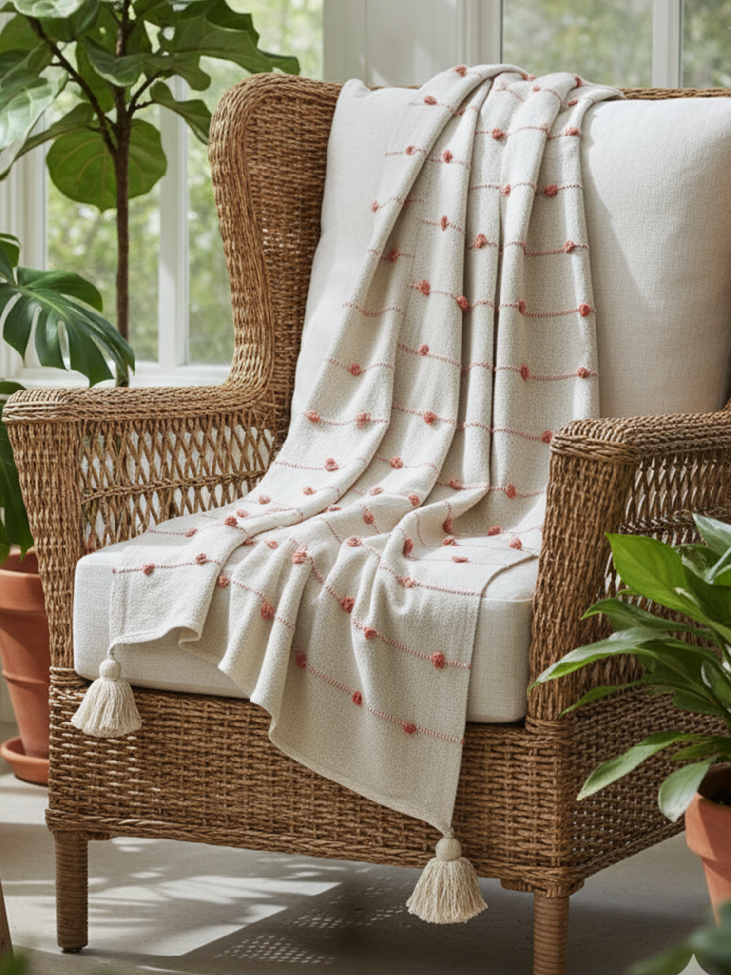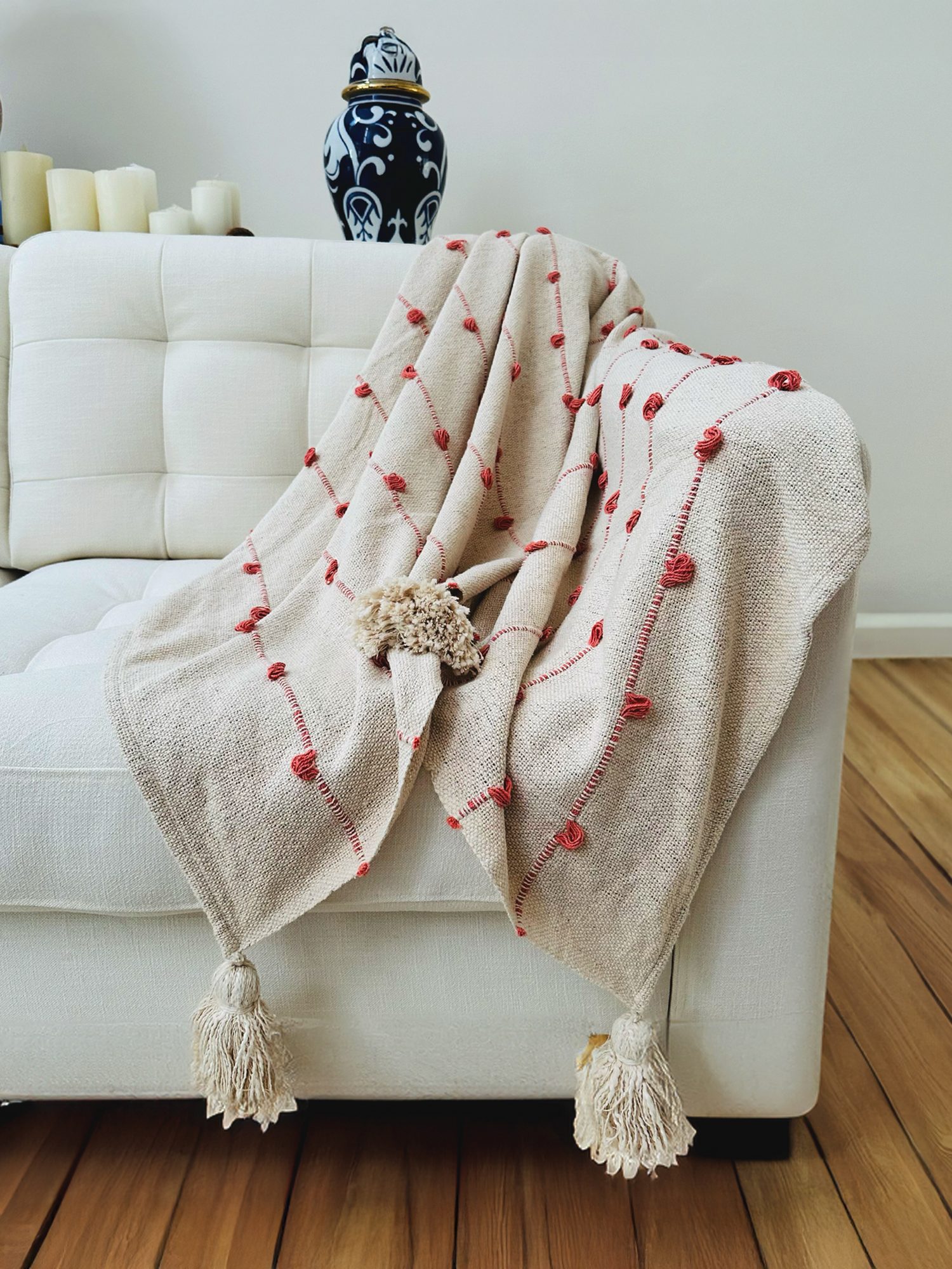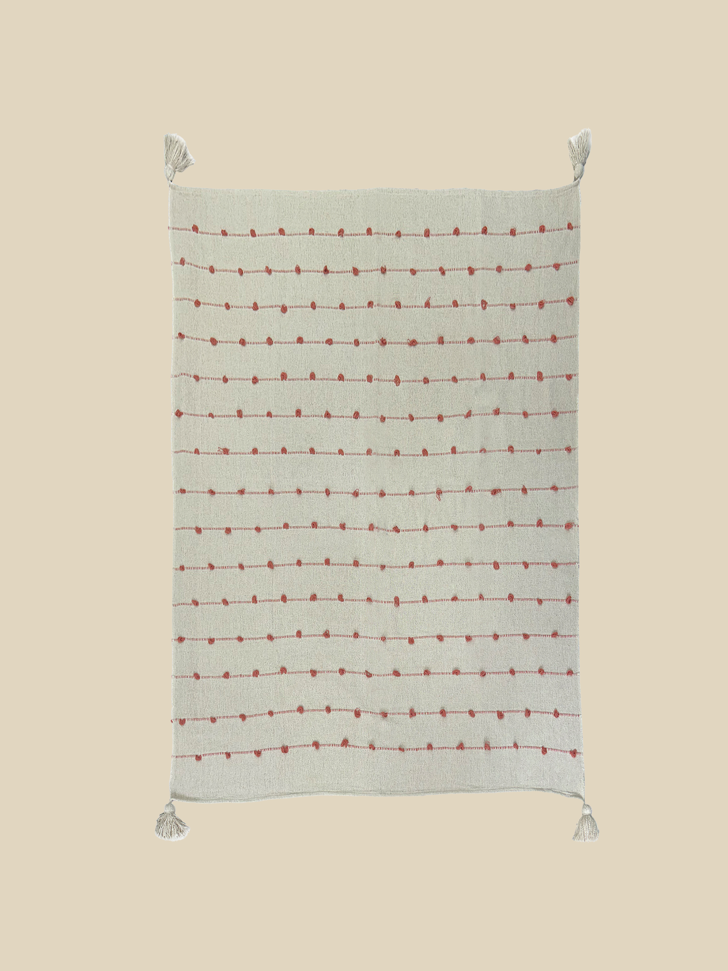 A lightweight cotton throw with an off-white base, coral stripes, and looped detailing for chic texture.