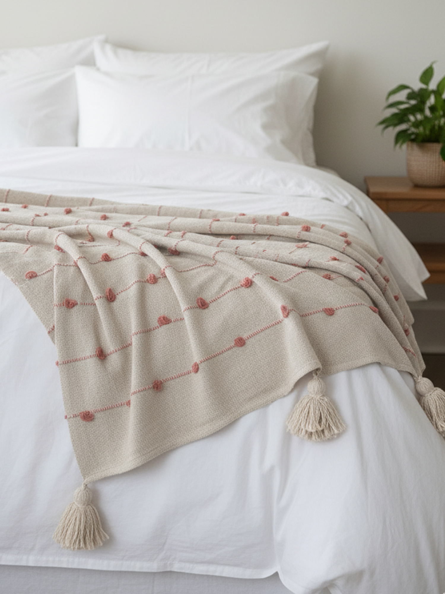 The Blair Throw brings texture, warmth, and understated elegance to your space. Woven from premium cotton, its off-white base is elevated by timeless coral stripes and looped detailing that add both volume and charm. Finished with tasselled corners, Blair is lightweight yet cosy, making it perfect for draping over a sofa, layering on a bed, or curling up with in a favourite nook.