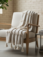 A textured off-white cotton throw with embroidered stripes and tasselled edges for a cosy, layered look.