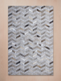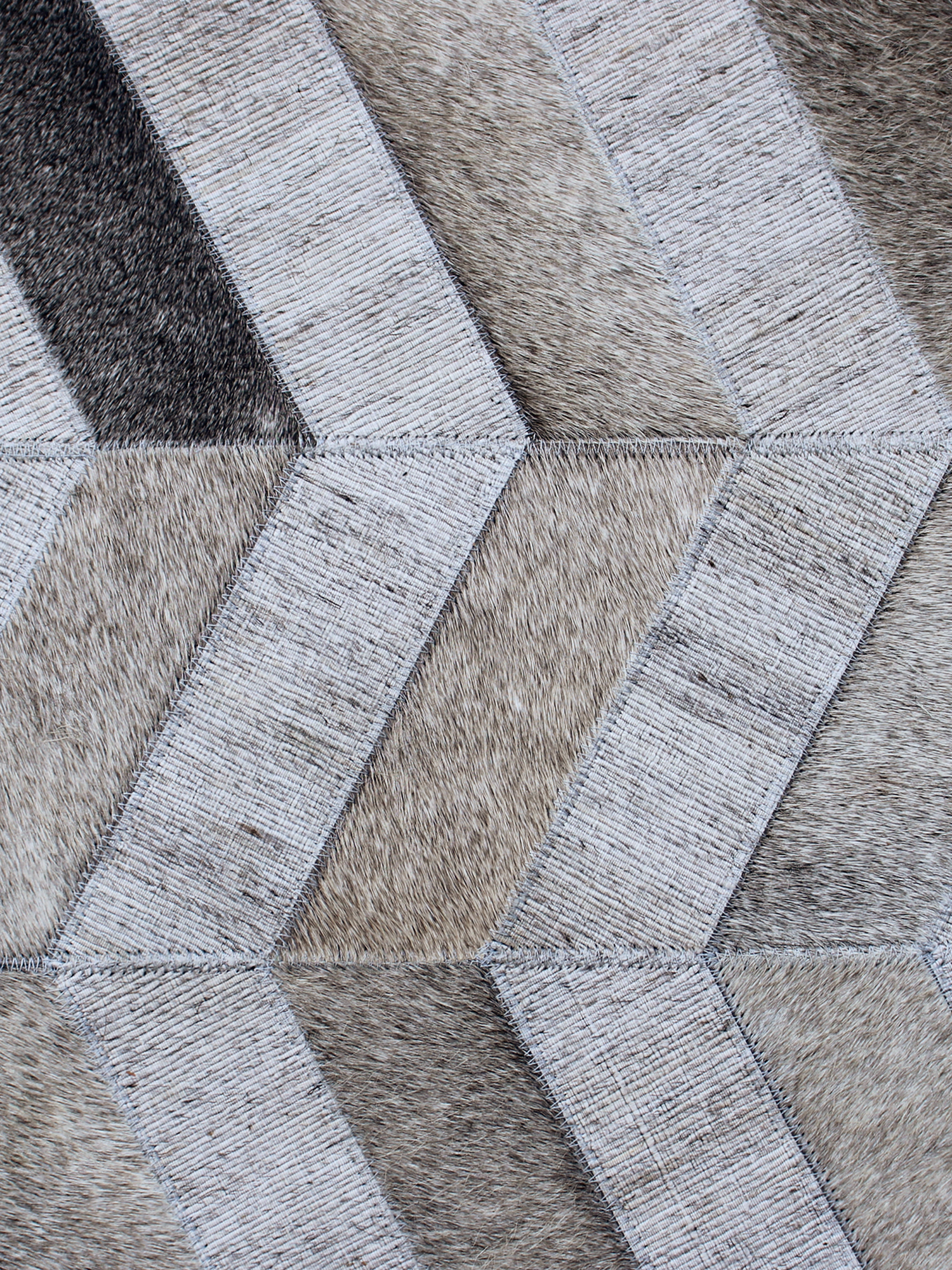 A hand-stitched rug in layered grey and beige tones, featuring a refined chevron pattern crafted from leather, wool, and viscose.