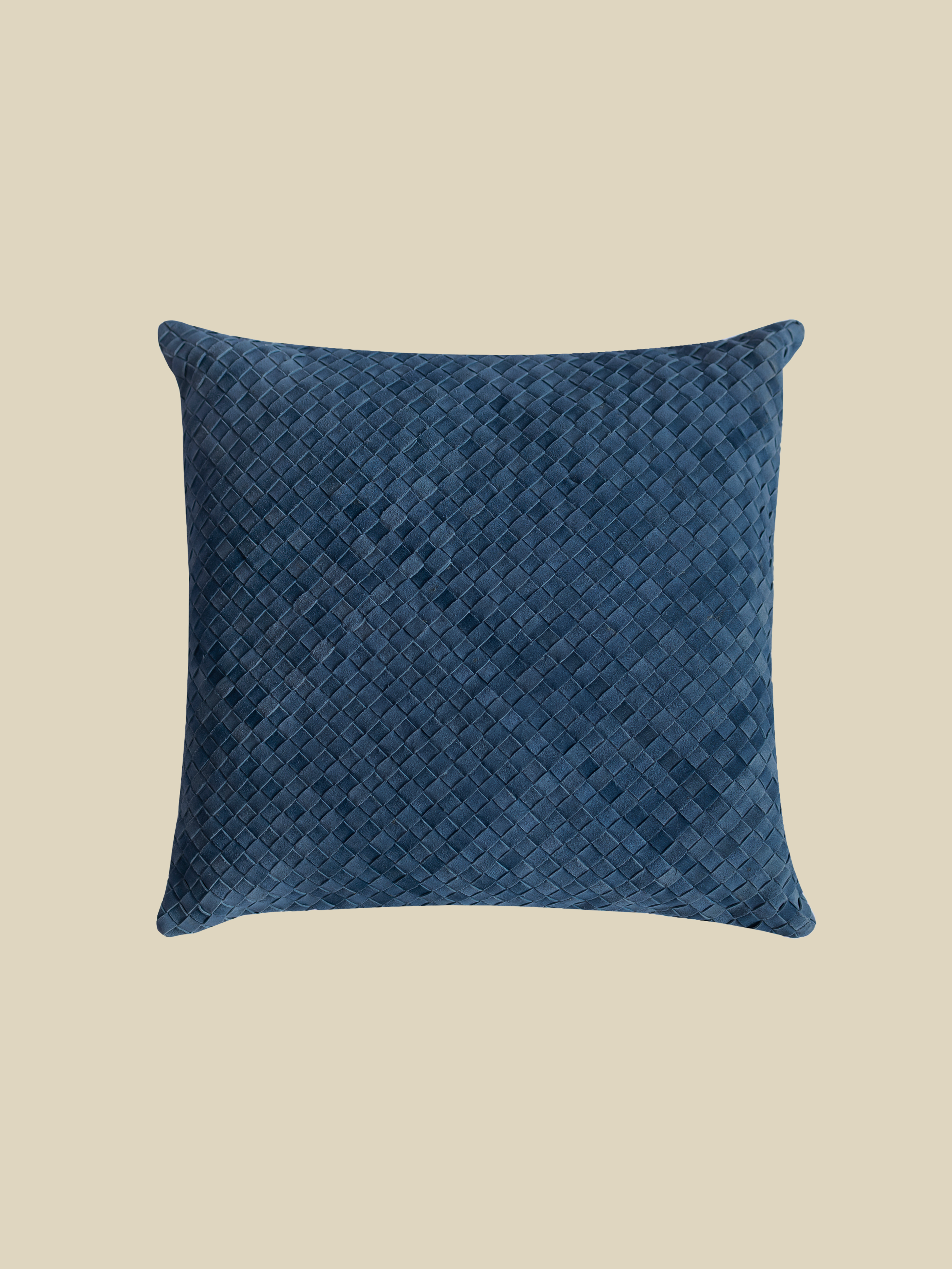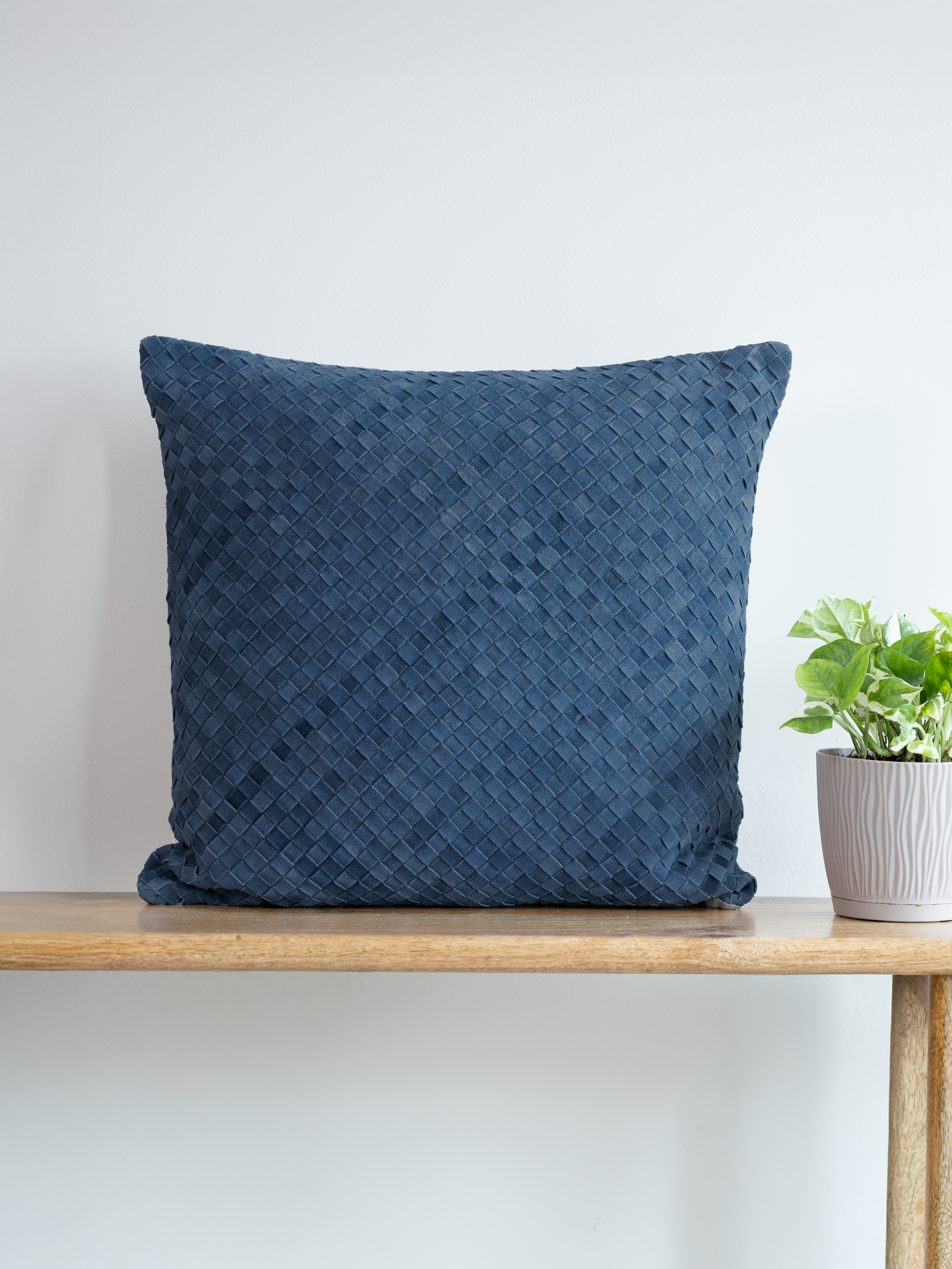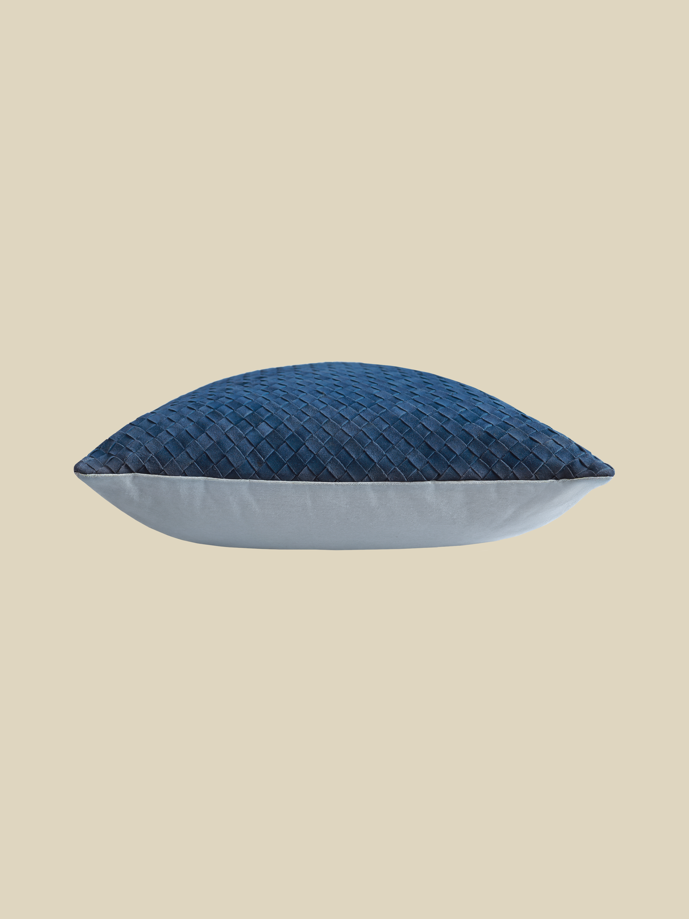 This square cushion features a solid blue leather front with a tonal check pattern for texture, a cotton back, and a hidden zip closure.
