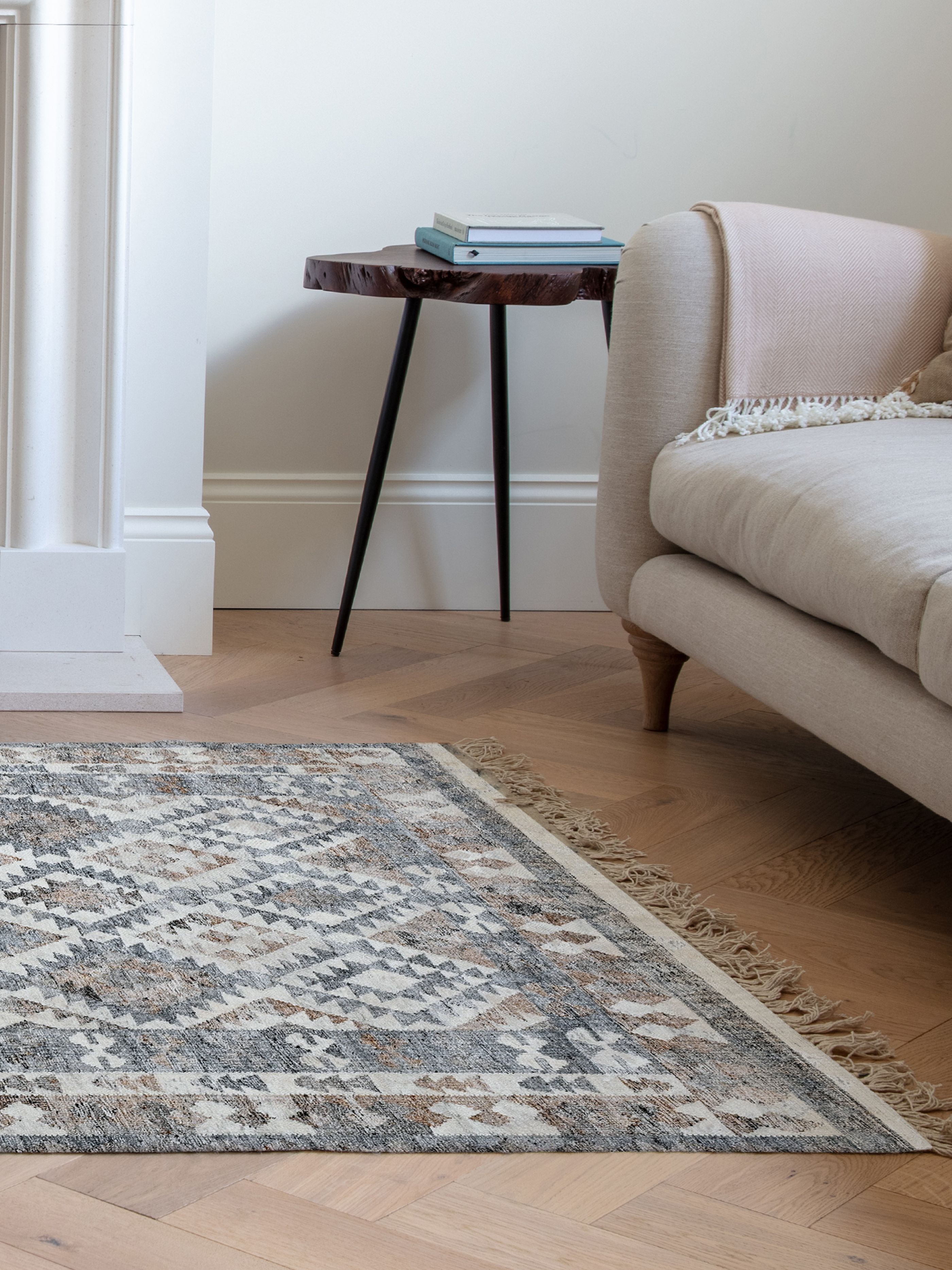 The Dhriti rug showcases a hand-woven geometric pattern, adding texture and visual interest. Its subtle grey and cream tones create a timeless appeal, making it a versatile choice for traditional, country, and coastal-inspired interiors.