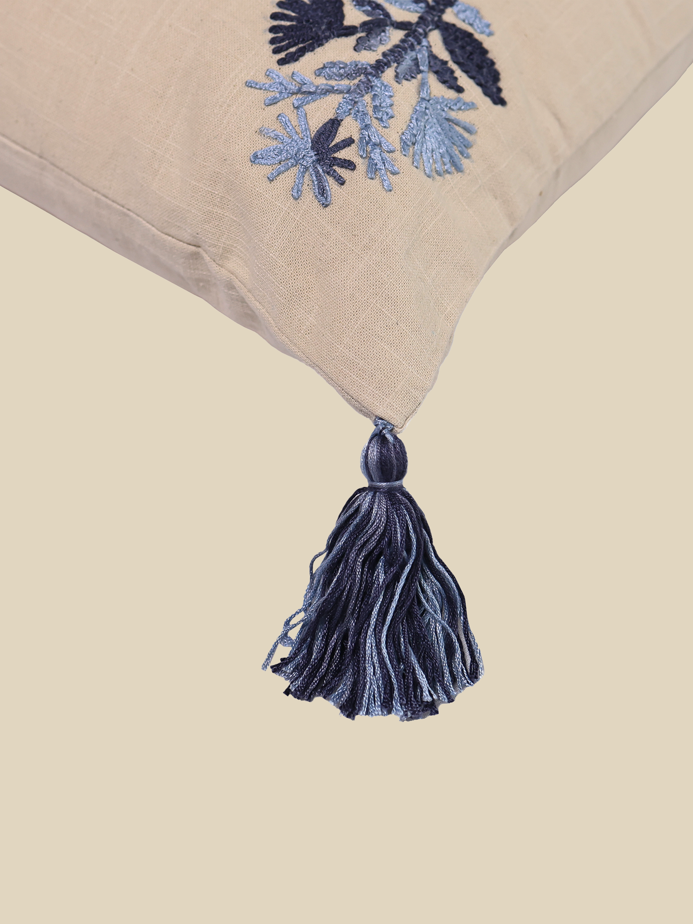 A square cotton cushion in neutral beige, richly embroidered with floral motifs for artisanal charm.