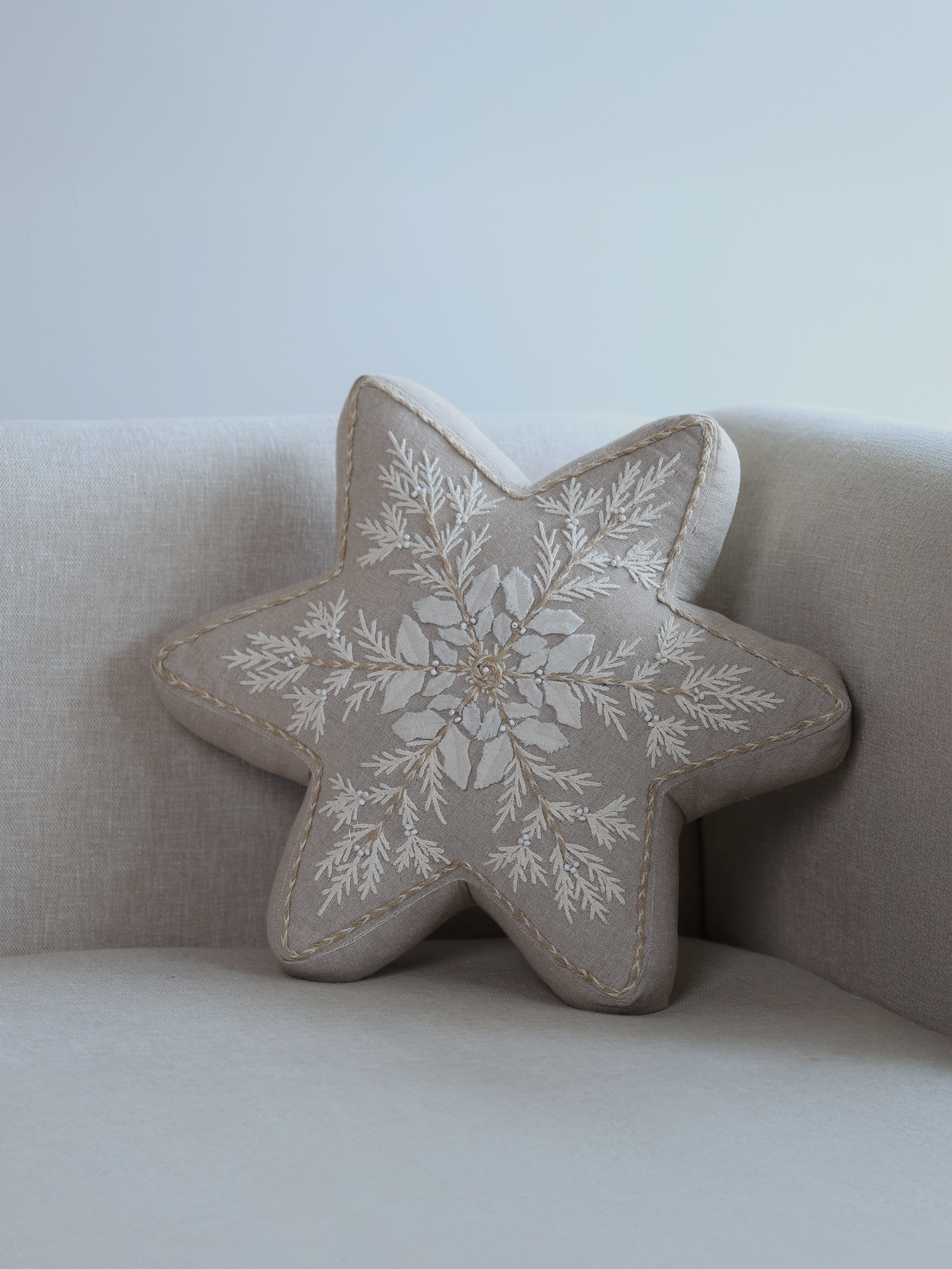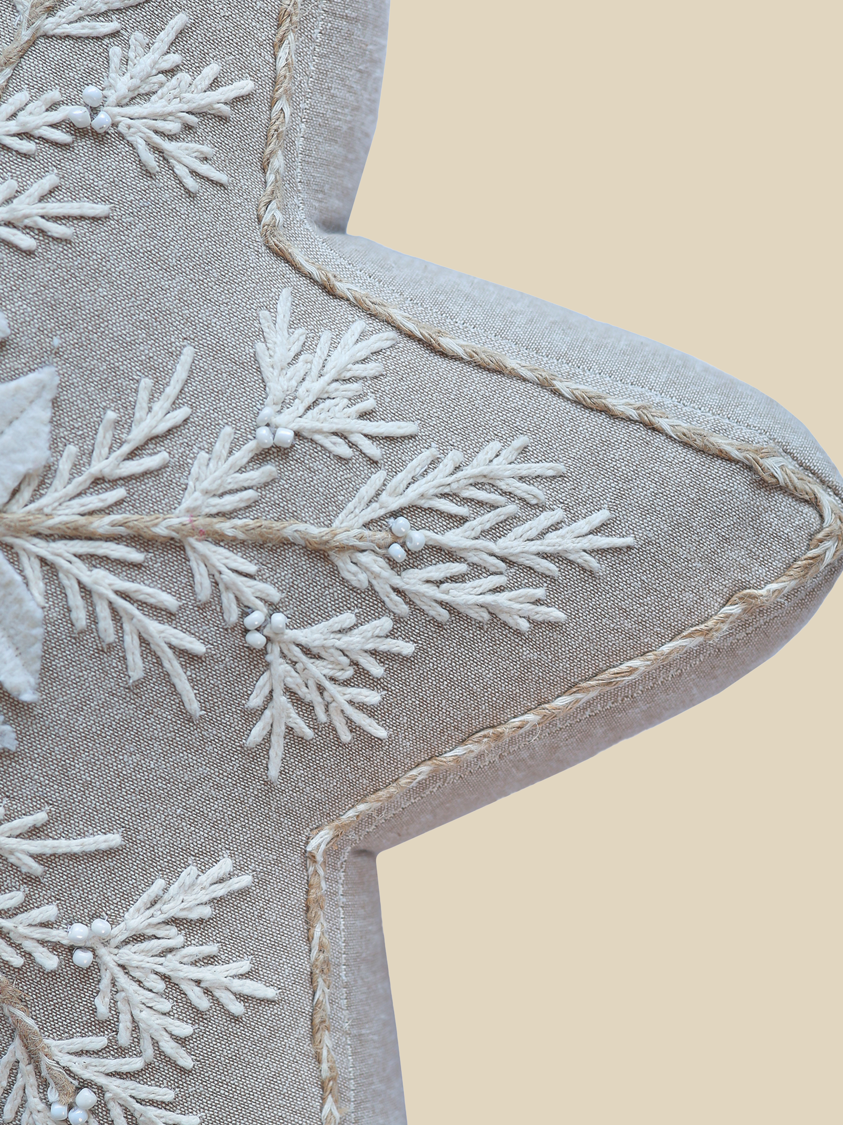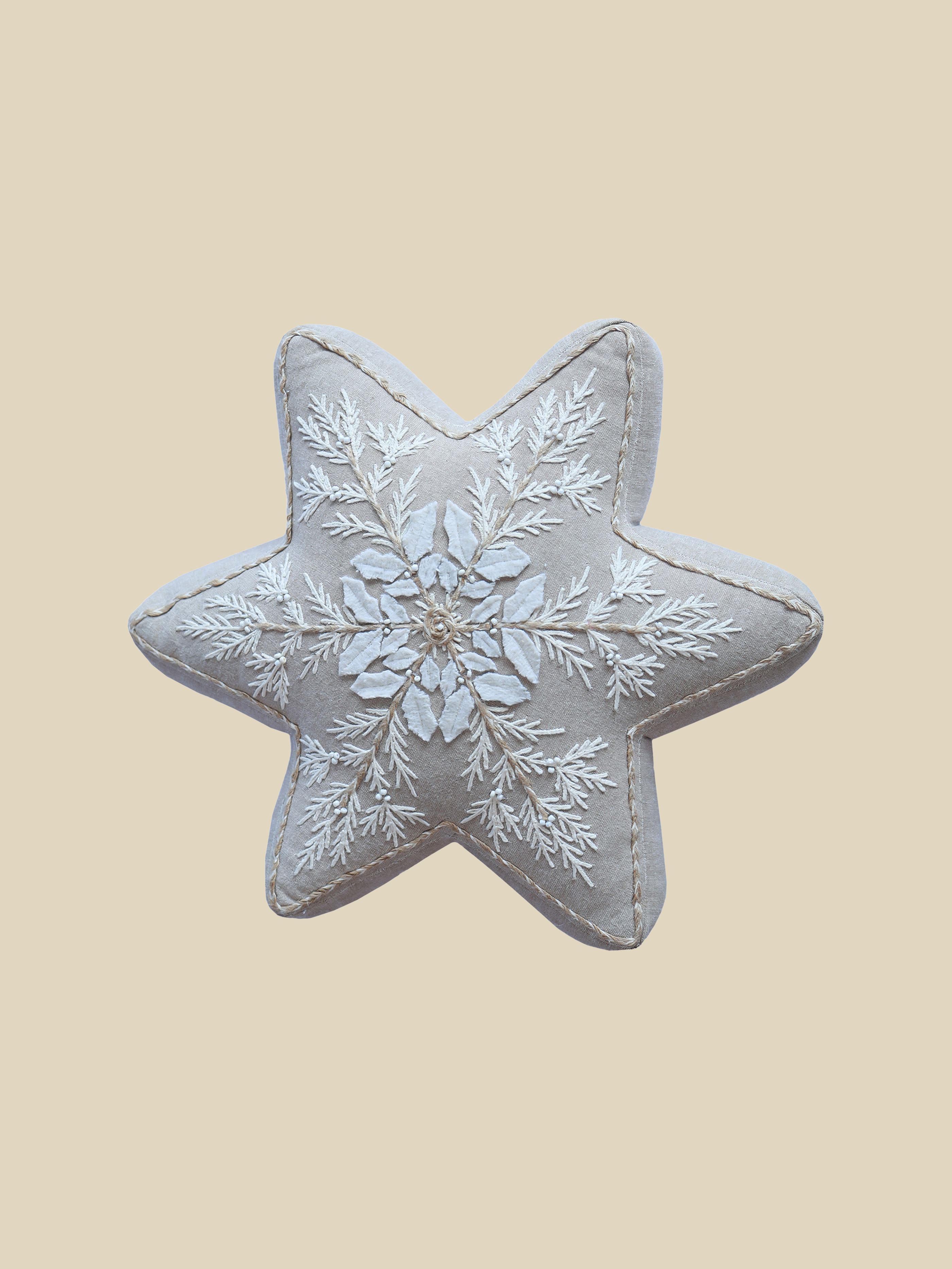 A star-shaped beige cotton chambray cushion with white and gold embroidery, perfect for the festive season.