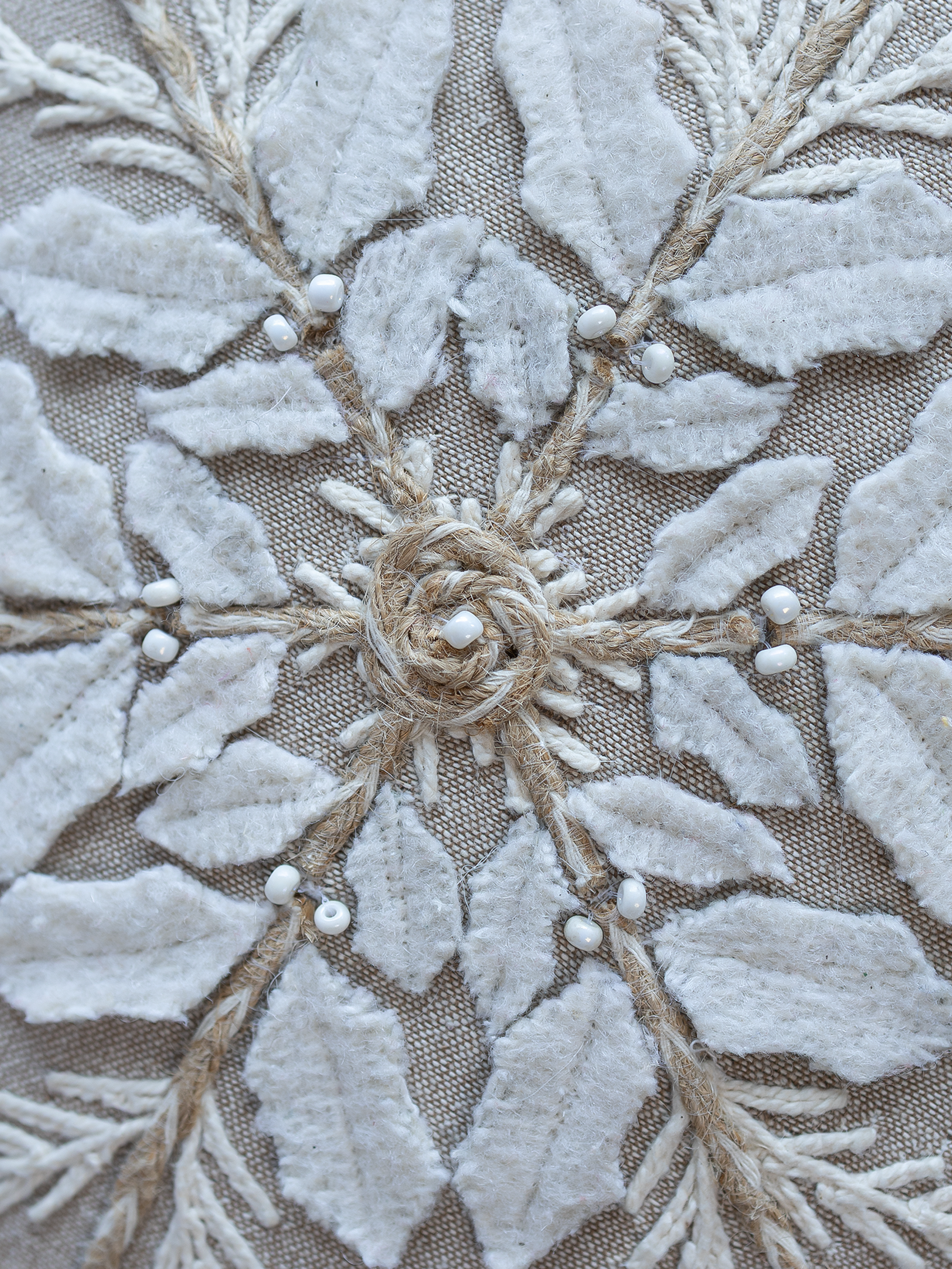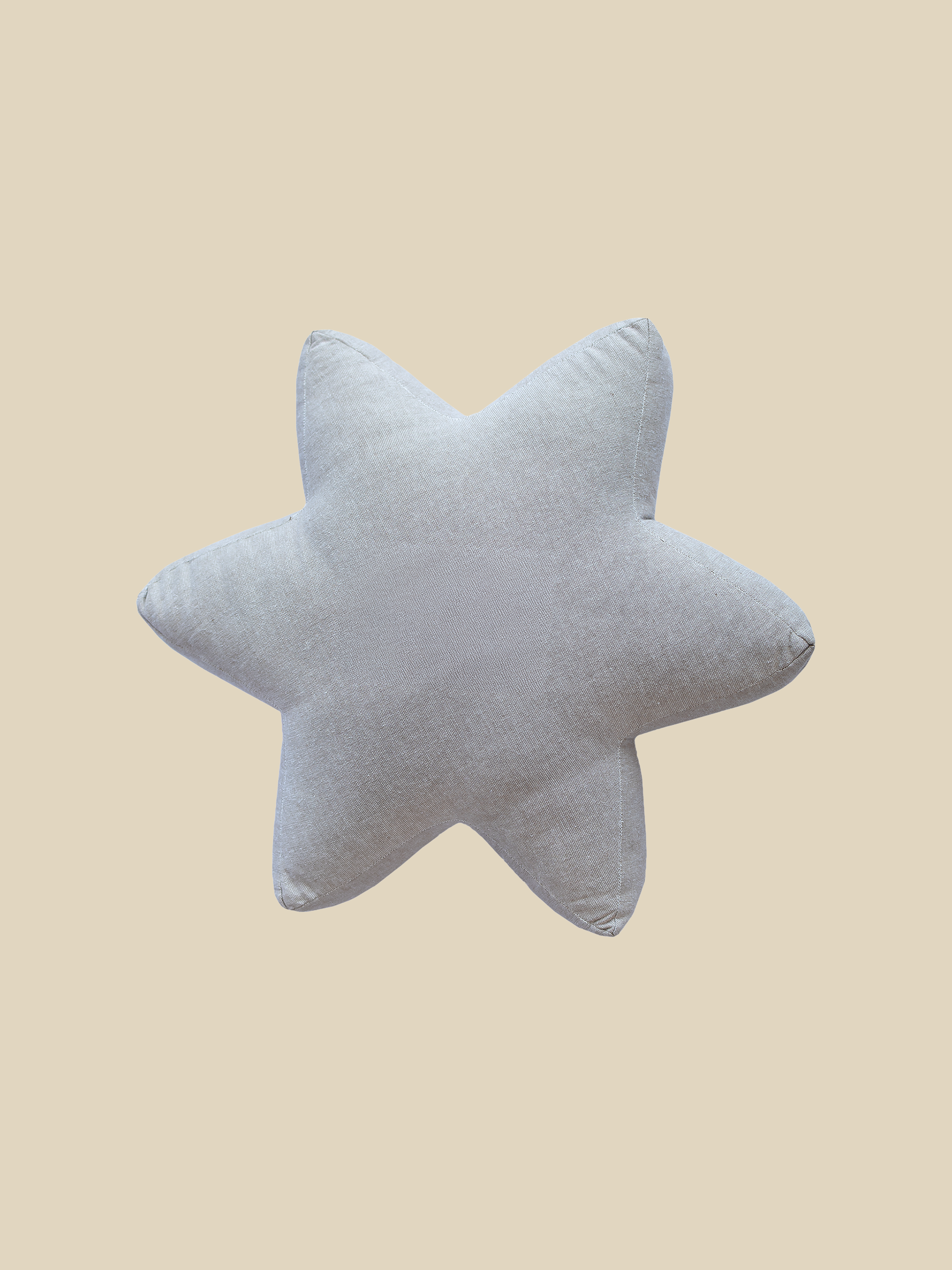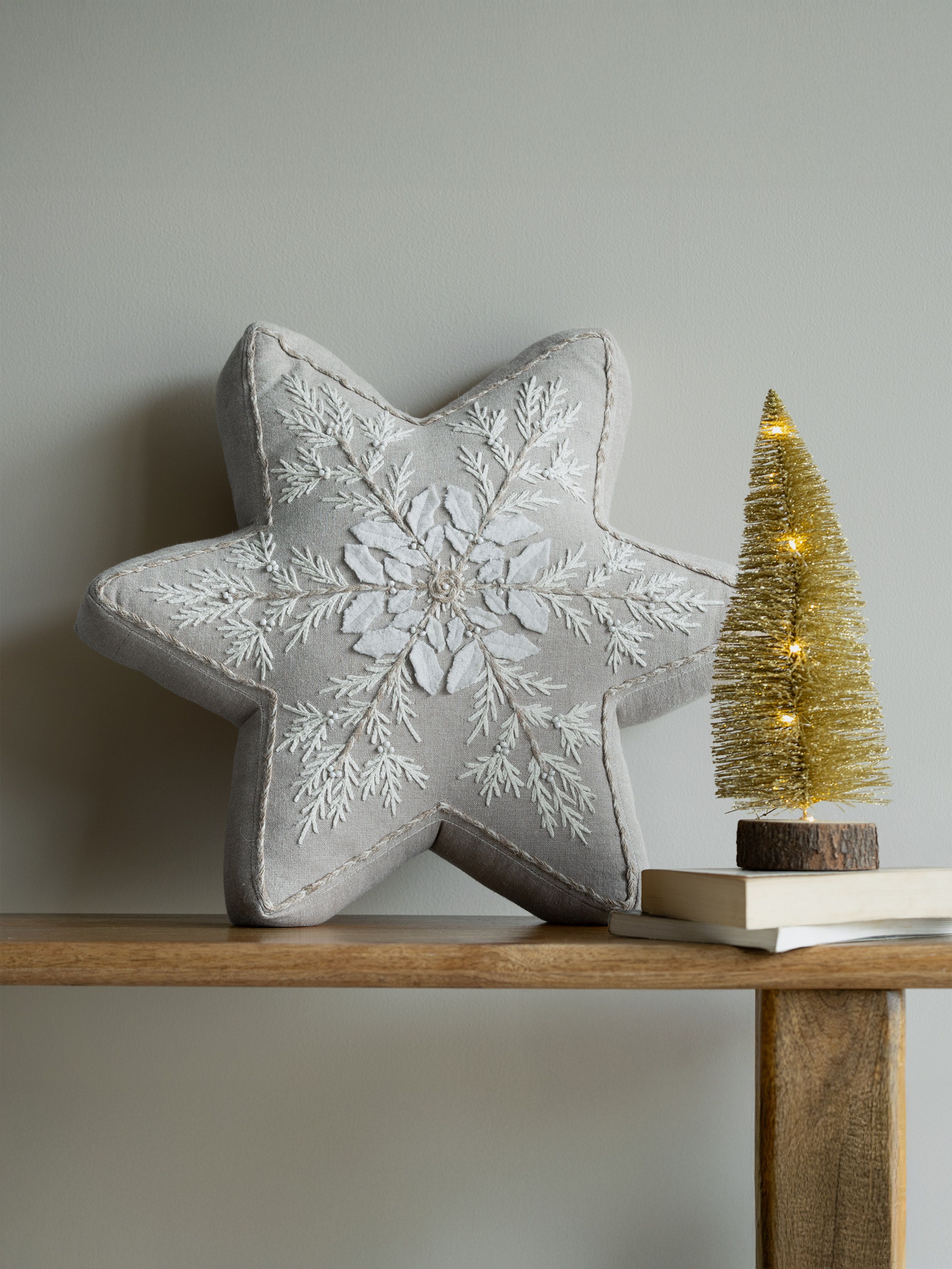 A star-shaped beige cotton chambray cushion with white and gold embroidery, perfect for the festive season.