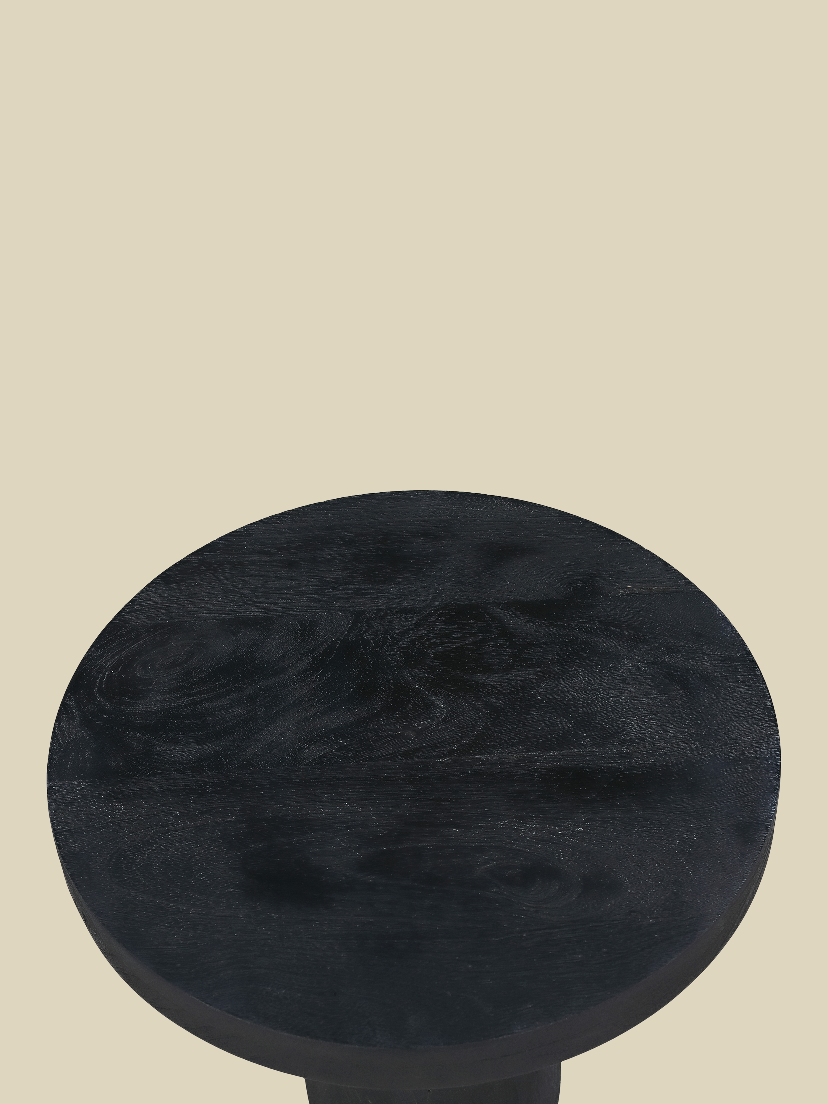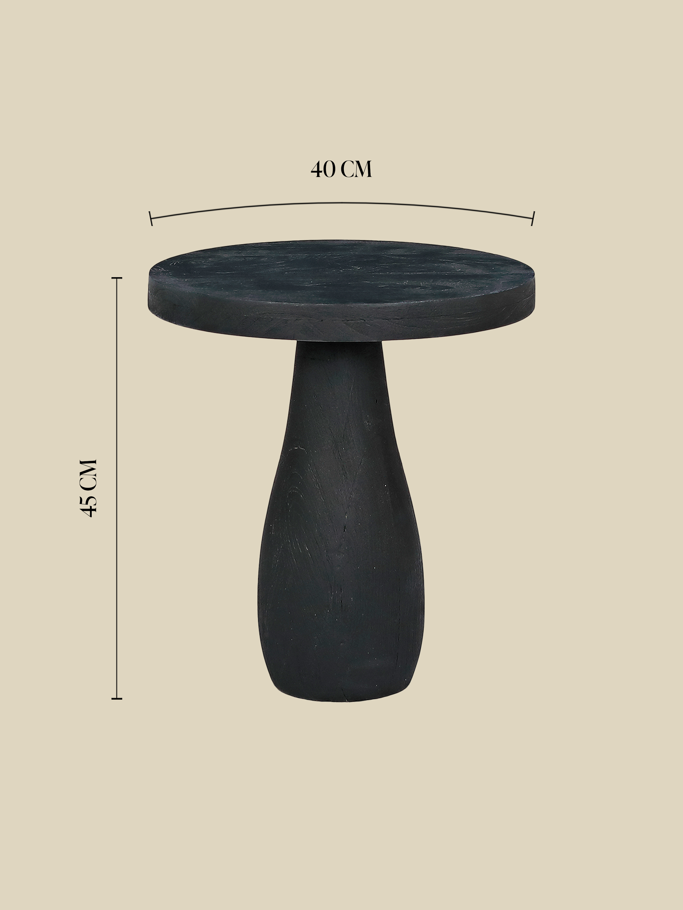 A smooth, circular top rests on a solid pedestal base, flaring subtly at the bottom for balance. The all-black finish highlights the wood's form and texture while keeping the profile refined and contemporary.