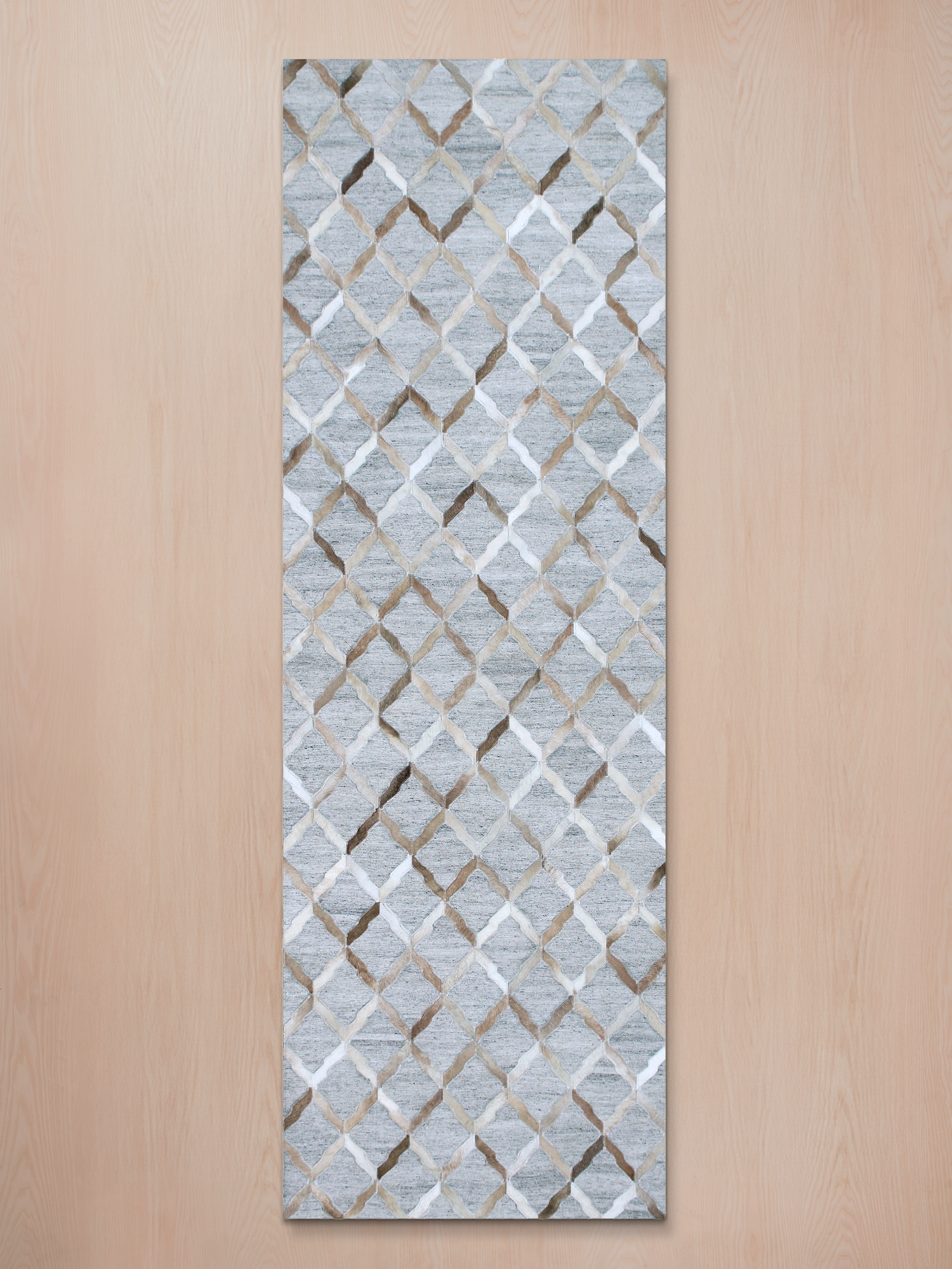 A hand-stitched rug in light grey and beige tones, blending leather, wool, and viscose for a modern take on timeless texture.