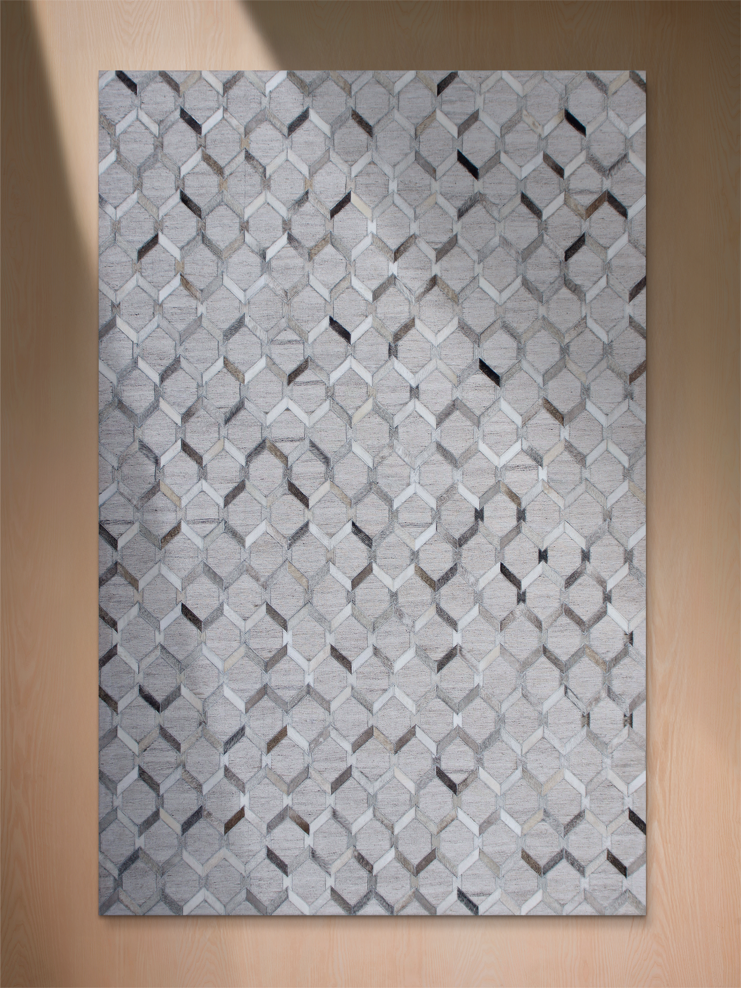 The Rehaan Rug brings contemporary design and natural materials together in perfect harmony. Hand-stitched from a rich blend of leather, wool, and viscose, it features a soft geometric weave in tonal shades of grey and beige. The result is a piece that feels both modern and timeless — tactile, balanced, and beautifully understated.