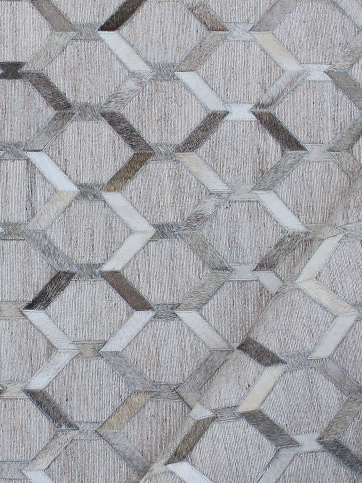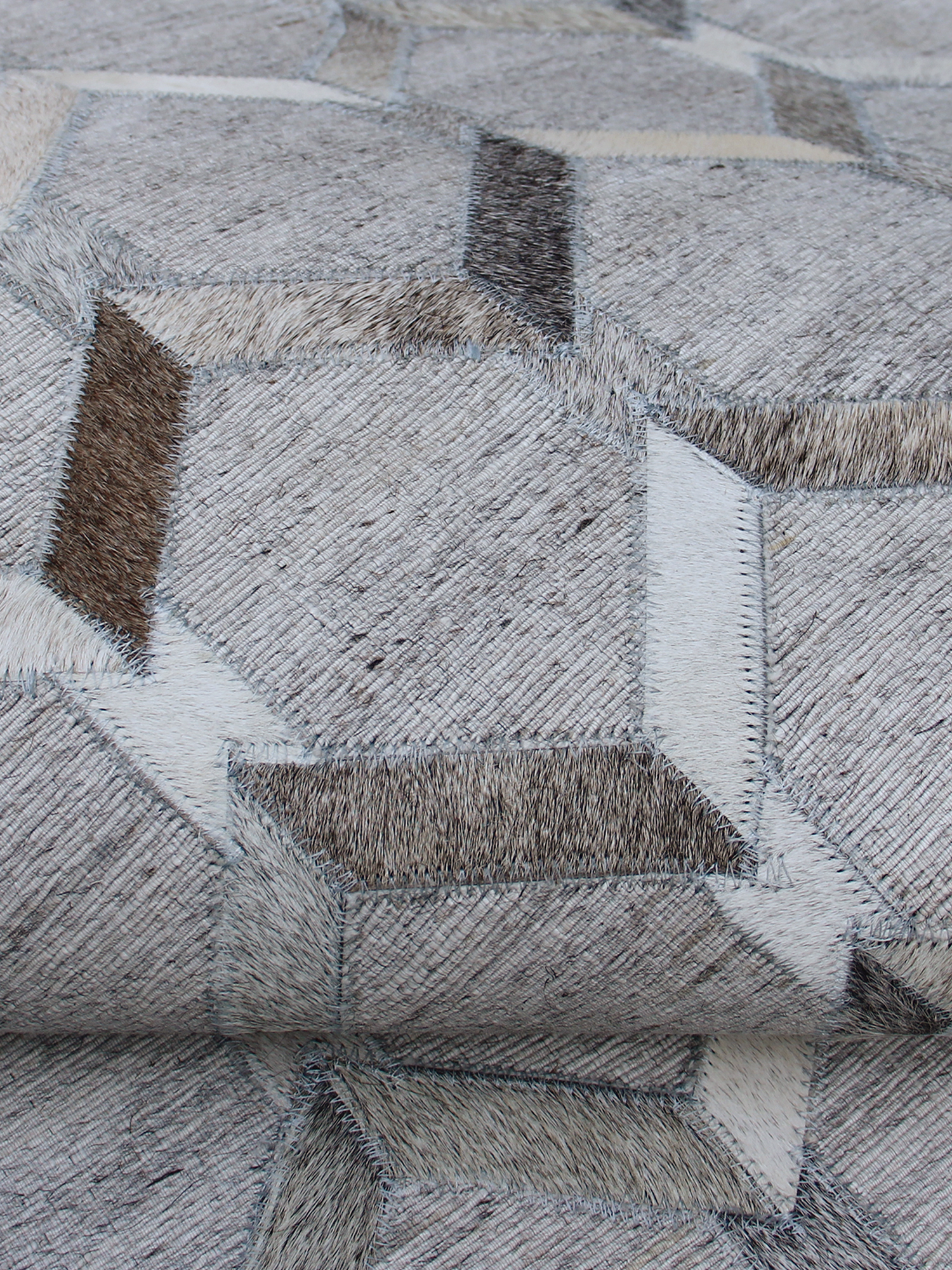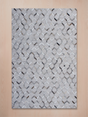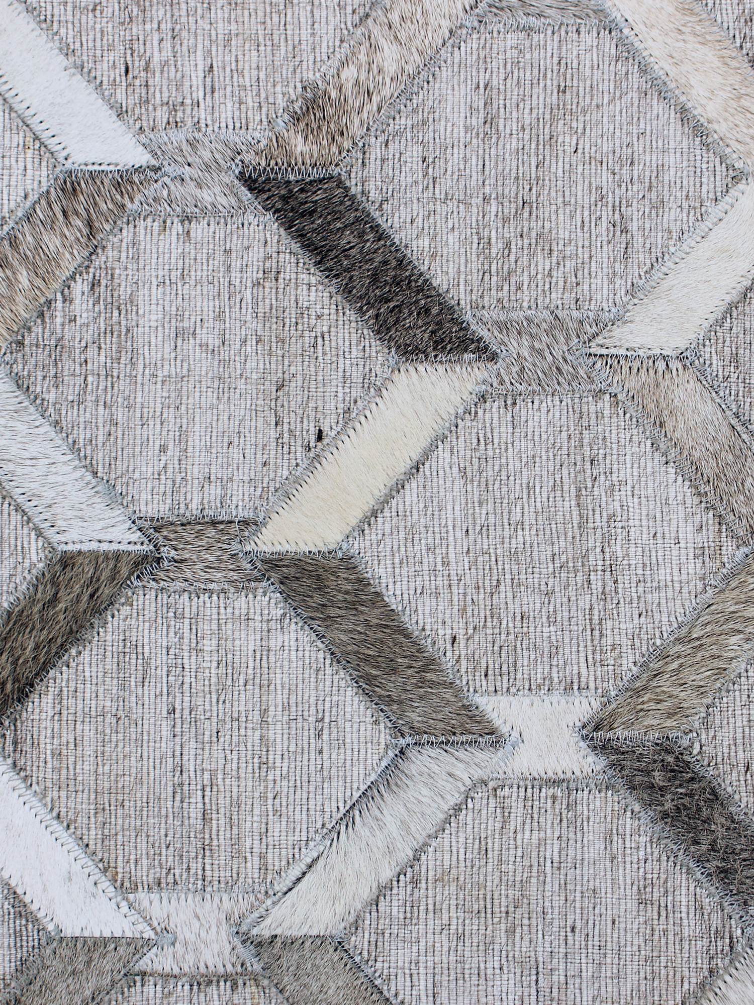 A hand-stitched rug in light grey and beige tones, crafted from leather, wool, and viscose for a modern, textured finish.