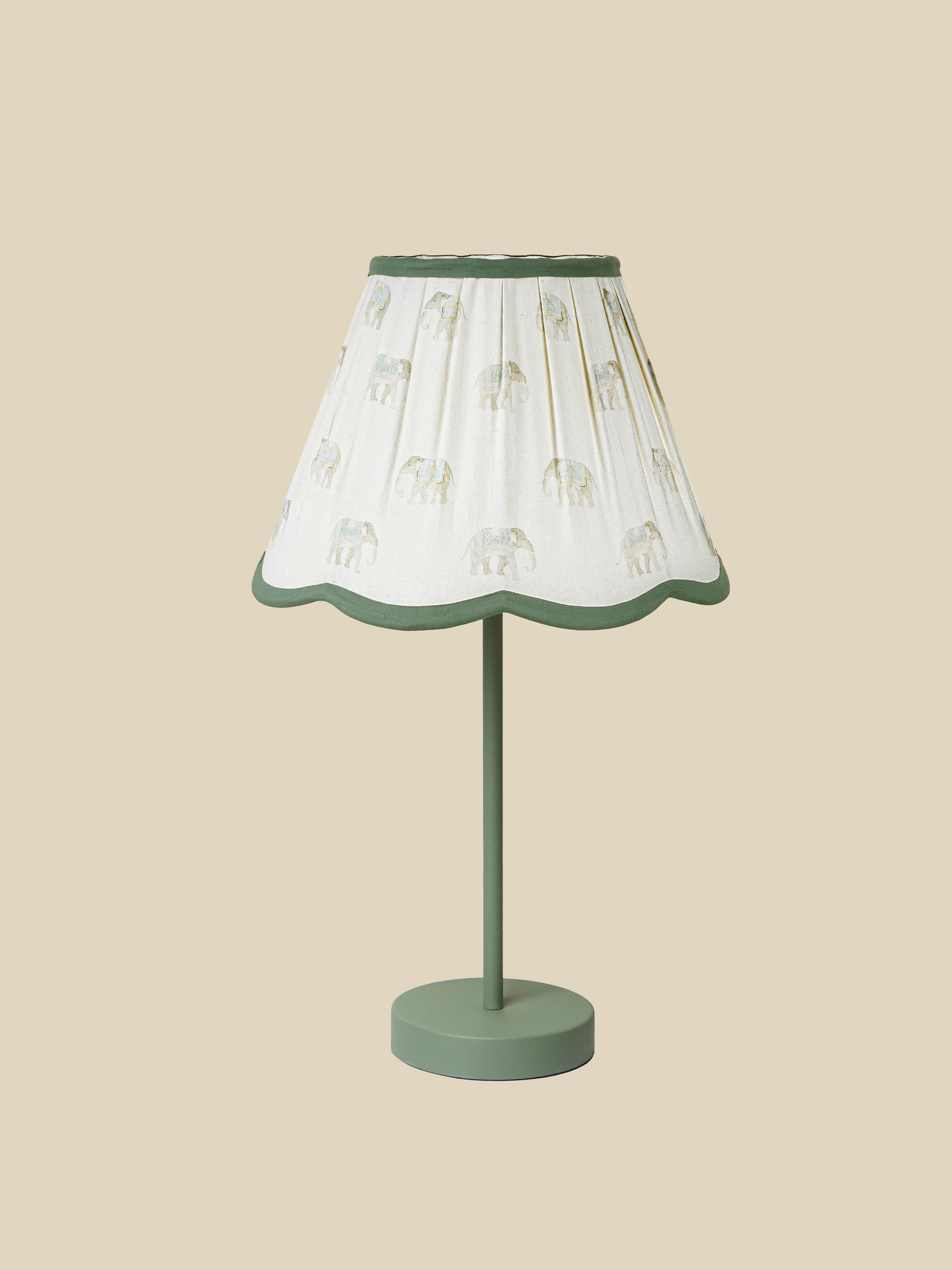A green metal table lamp with an elephant-printed shade and curvaceous linen silhouette.
