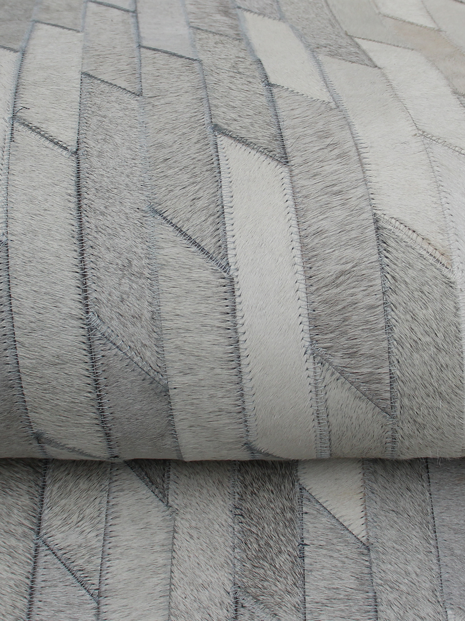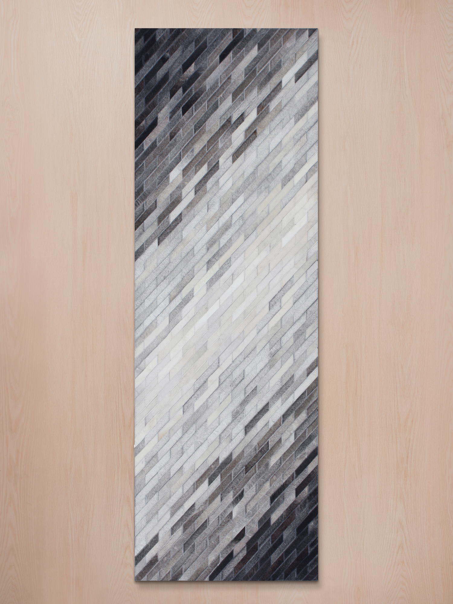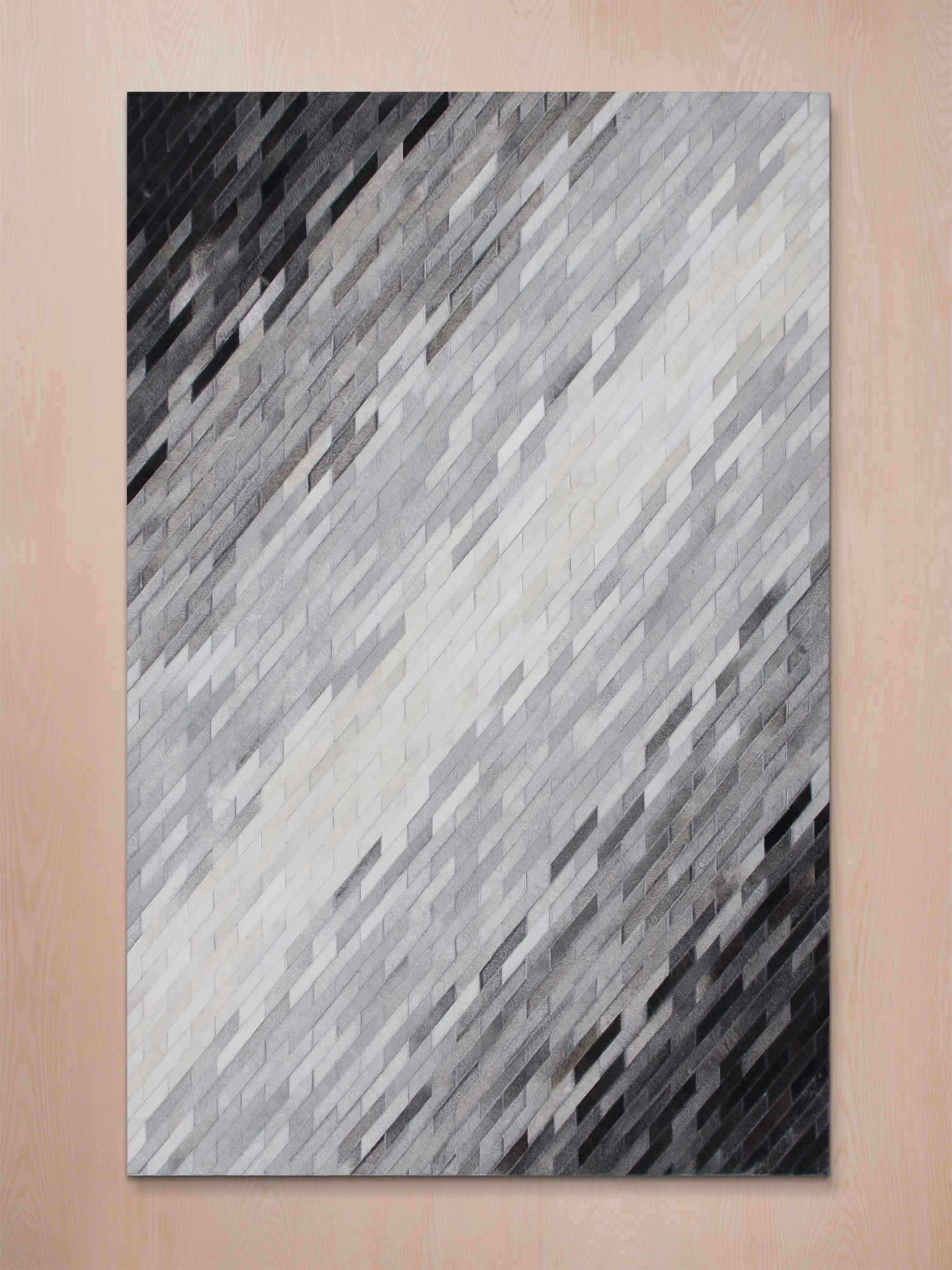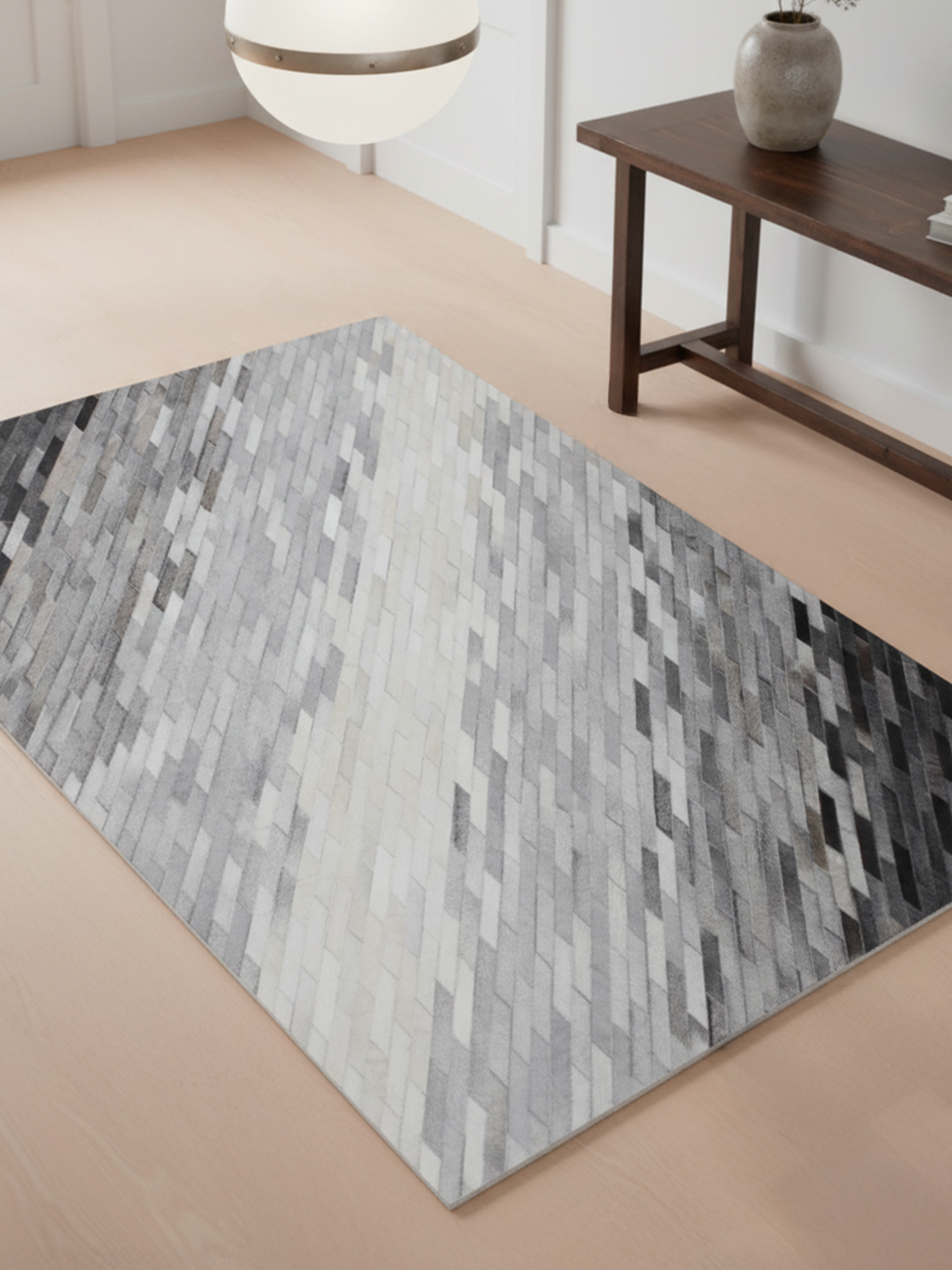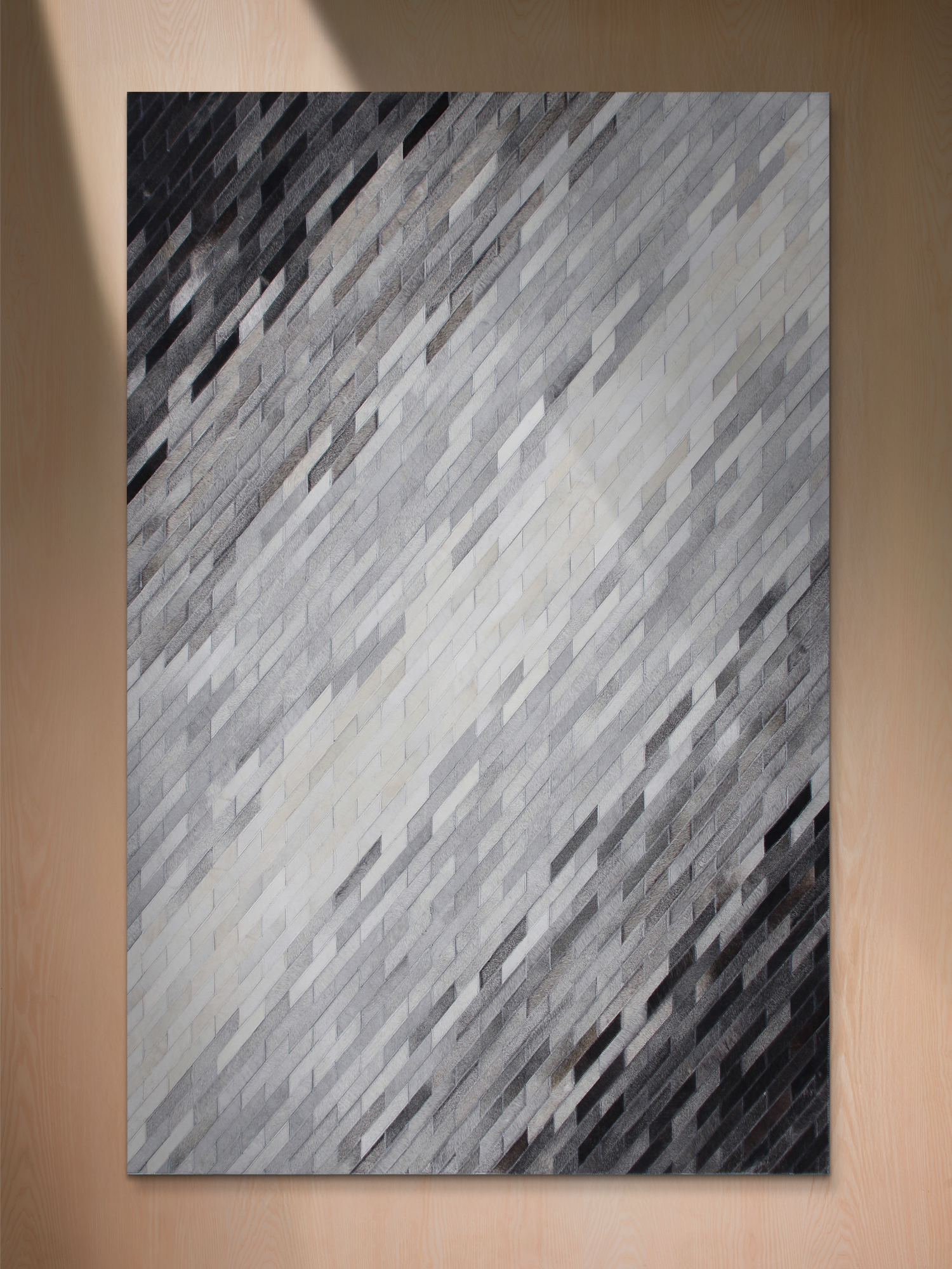 The Zidane Rug embodies quiet strength and modern refinement. Hand-stitched from supple leather and soft wool, it weaves together dark tones of grey, charcoal, and black into a geometric pattern. Its rich texture and grounded hues lend structure and sophistication to any space — perfect for those who appreciate understated luxury and craftsmanship.